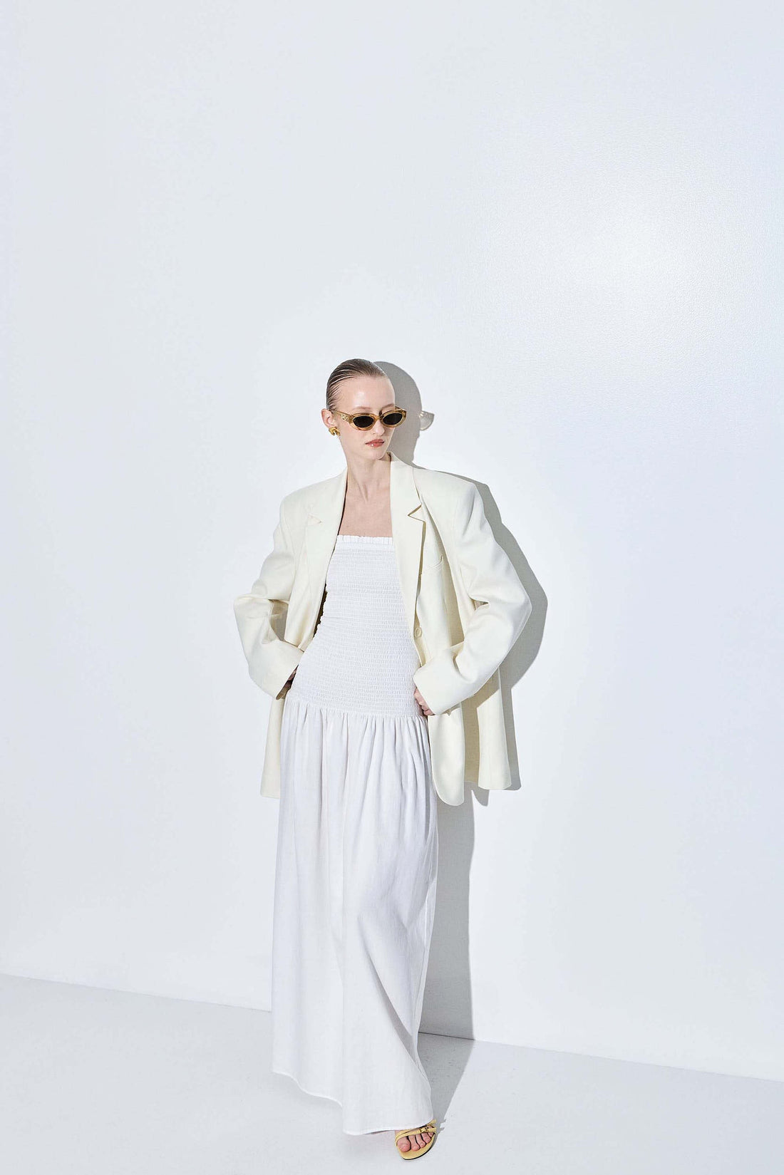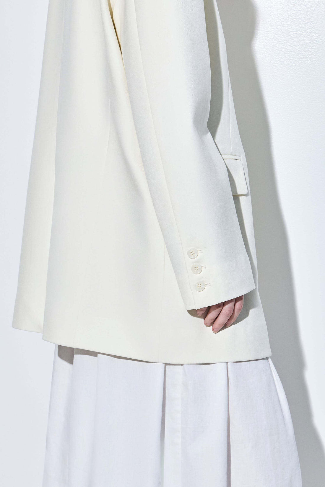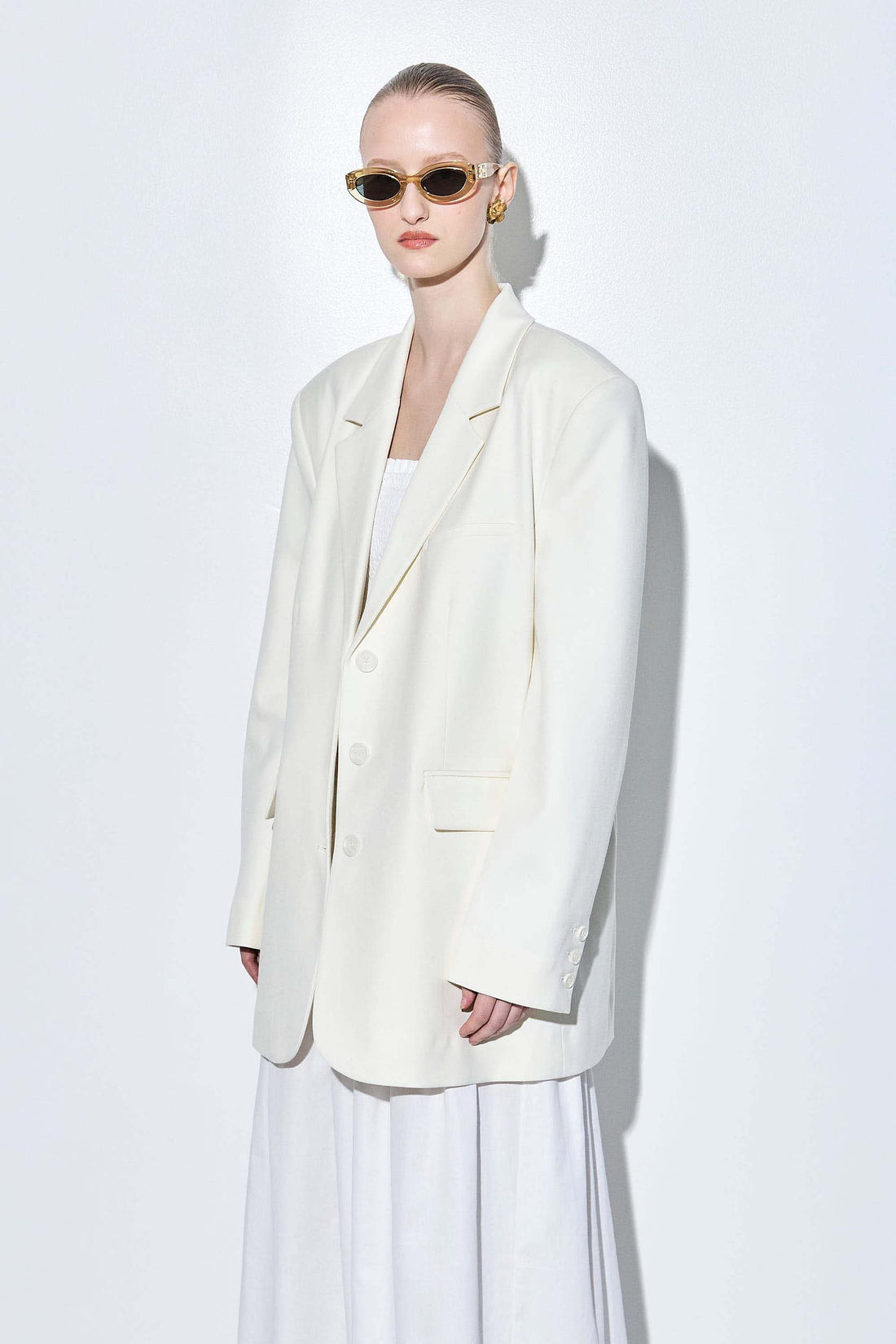 Our new tailored daddy blazer is a timeless piece this season in a new luxurious tailored fabric. Oversized fit. Features a lapel collar. Logo engraved button closure. Three front faux pockets. Back slit. Lined. Tonal logo embroidery on the side. Padded shoulders. Style it with our daddy bootcut pants, our lightweight turtleneck and our signature mini logo belt for a day to night classy look.