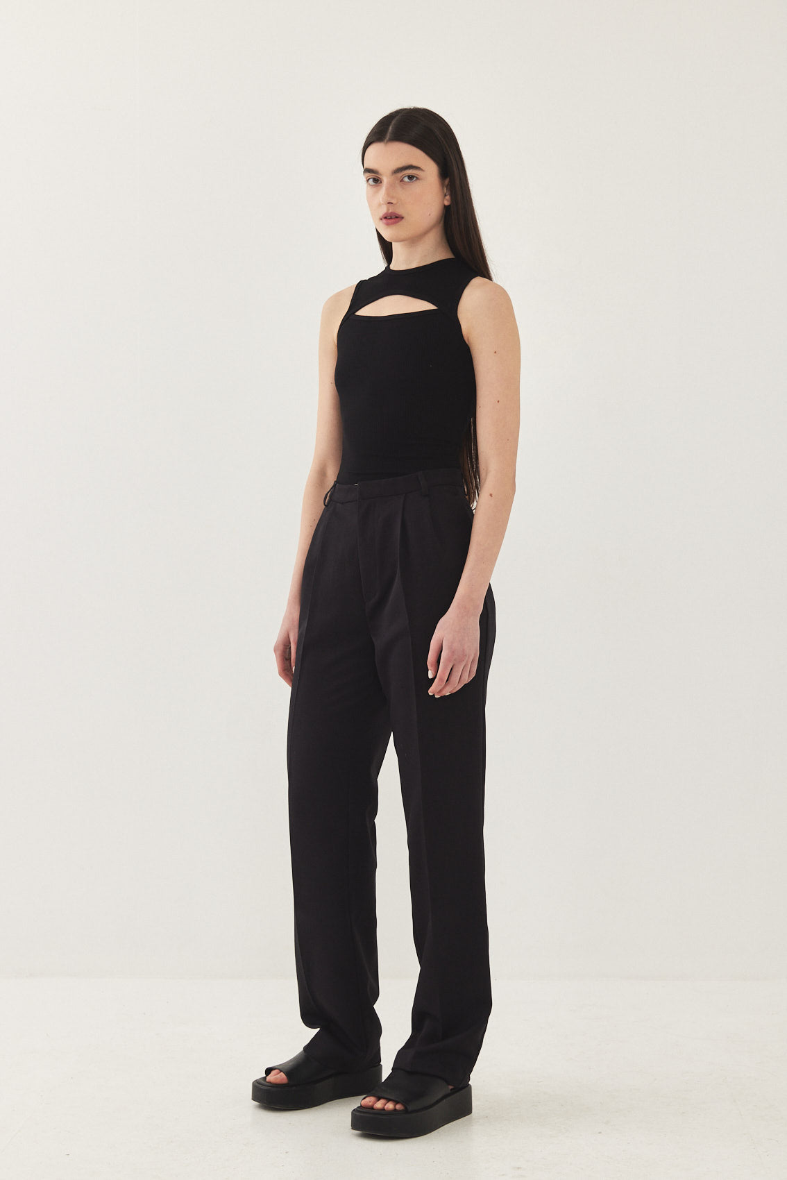 Ribbed tank top with a frontal cut out. Made from a thin ribbed stretchy fabric. Perfect for layering throughout the seasons. Style it with the matching leggings and a kitten heel for the perfect day to night look.