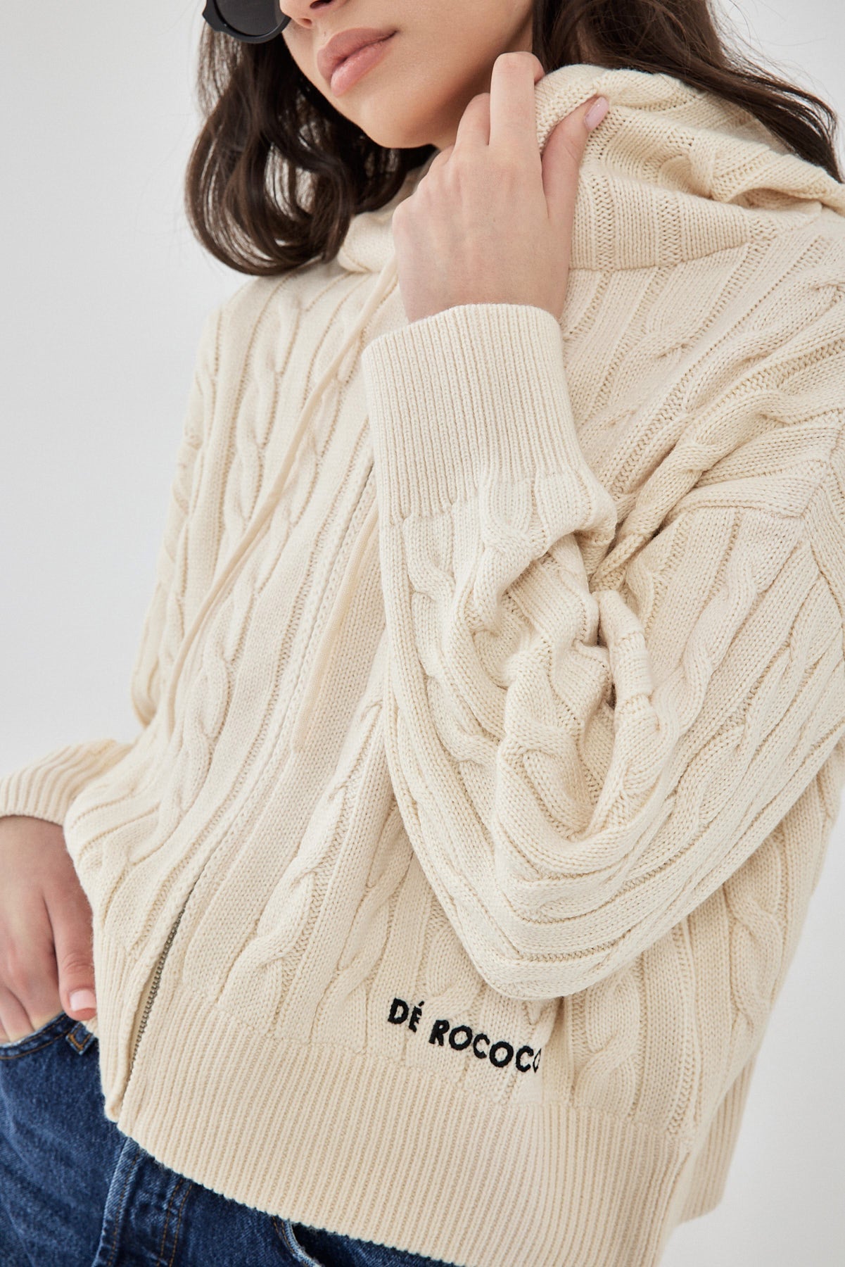 A winter wardrobe essential. Cable-knit sweater made from premium materials. Features a hood with strings. Zipper closure. Embroidered logo detailing on the front. Style it with the maxi vegan leather skirt for an ultra stylish look.