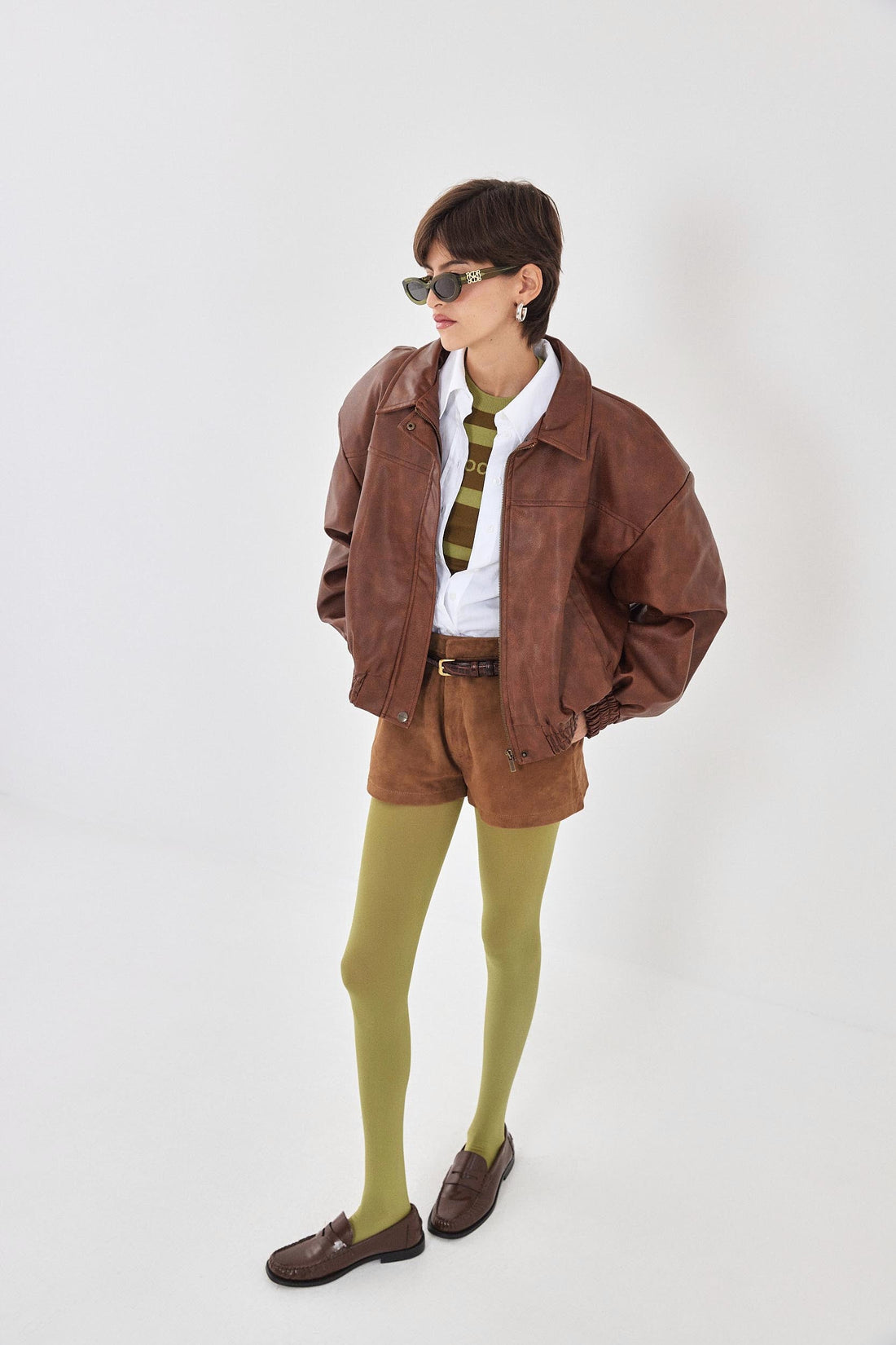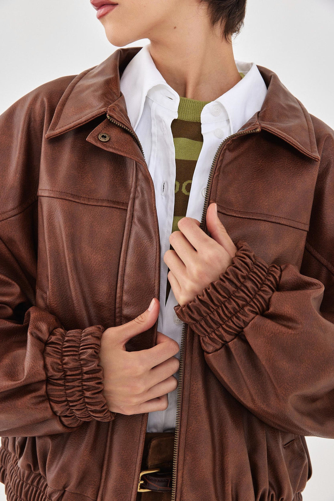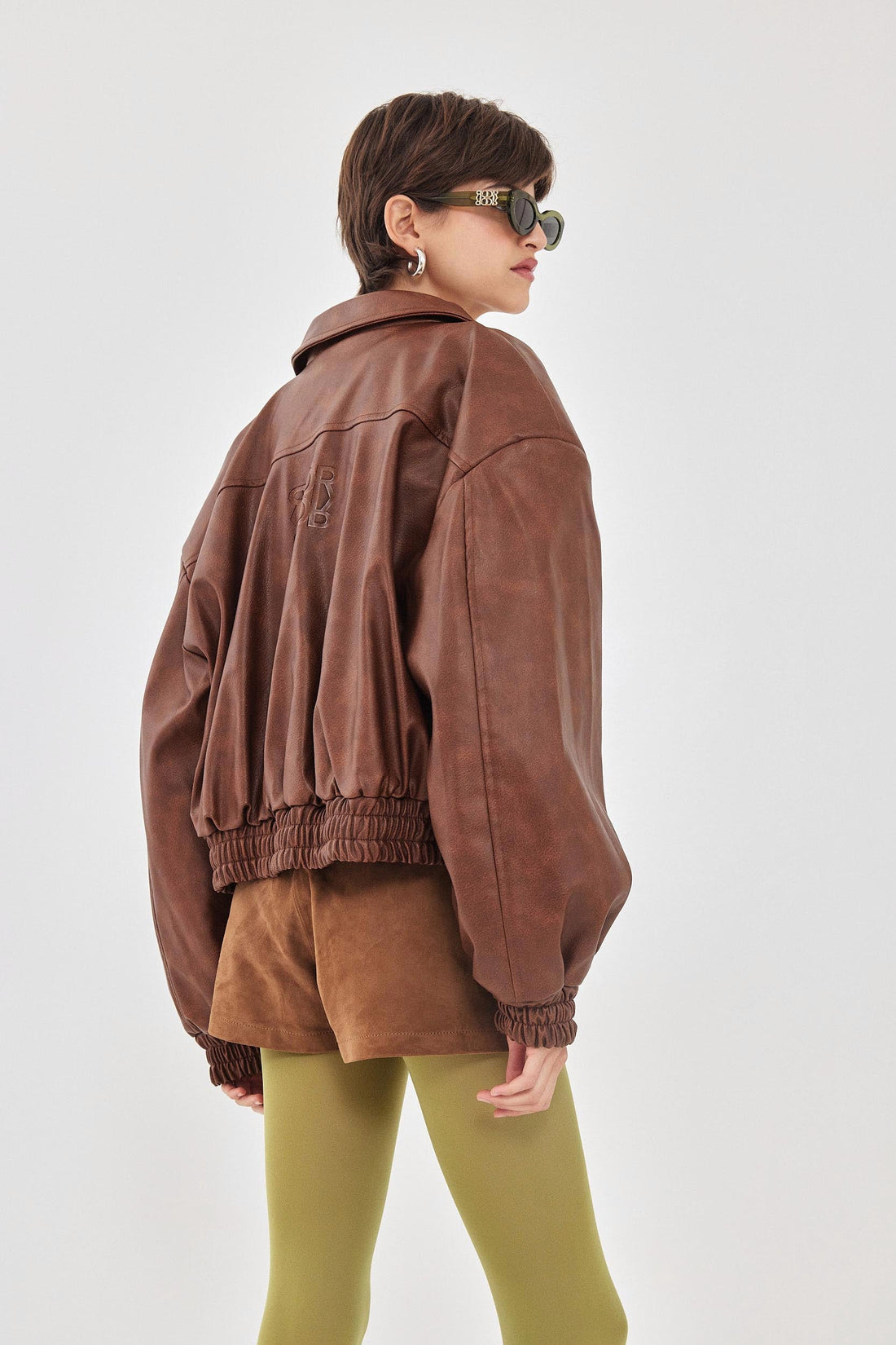The it-girl wardrobe must have for this winter season. Buttery smooth vegan leather. Cropped bomber jacket. Featuring elastic cuff finishing. Frontal zipper closure. Featuring two buttons on the front. Two front pockets. Drop shoulder sleeves. Debossed logo detailing on the back. Lined. Stitch detailing. Style it with a pair of trousers, a pair of kitten heels and some chunky hoops for a stylish look perfect from day to night.