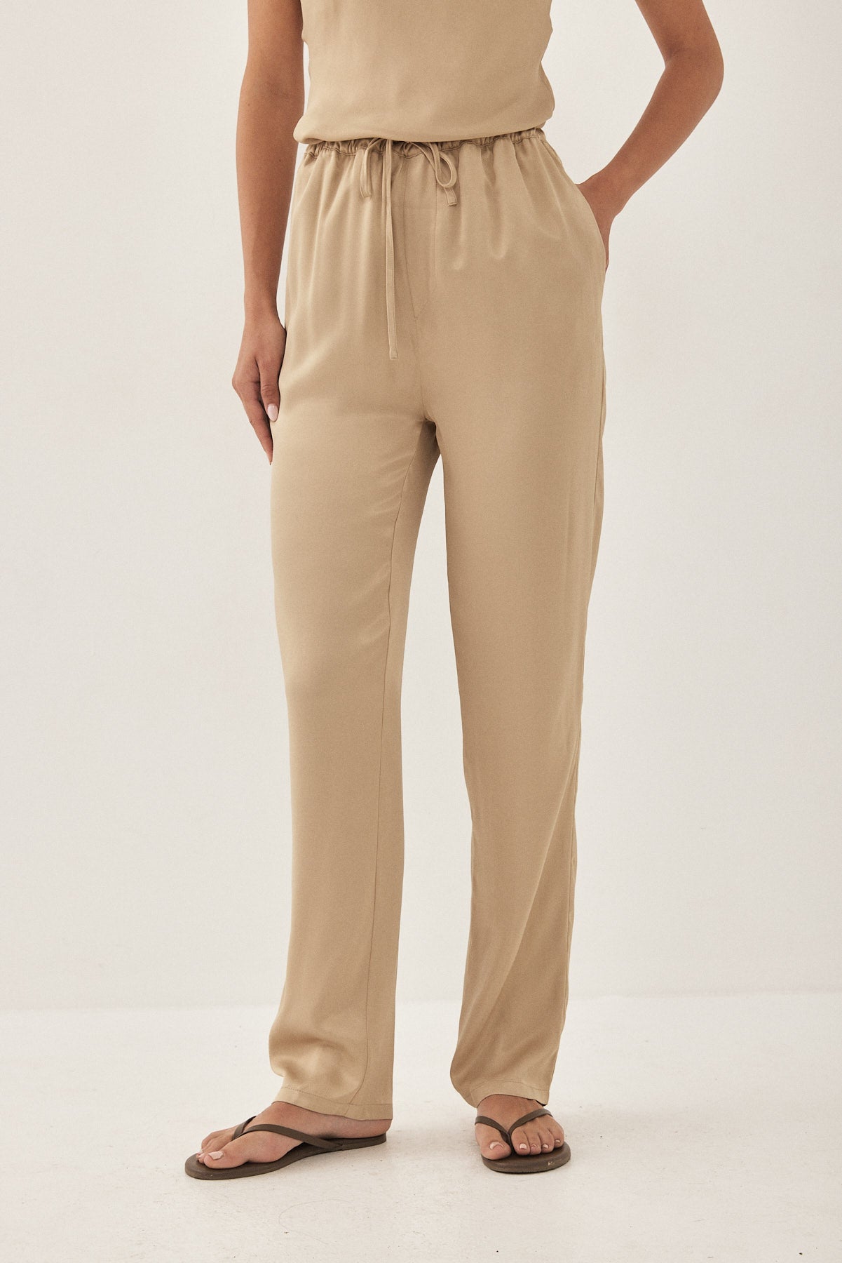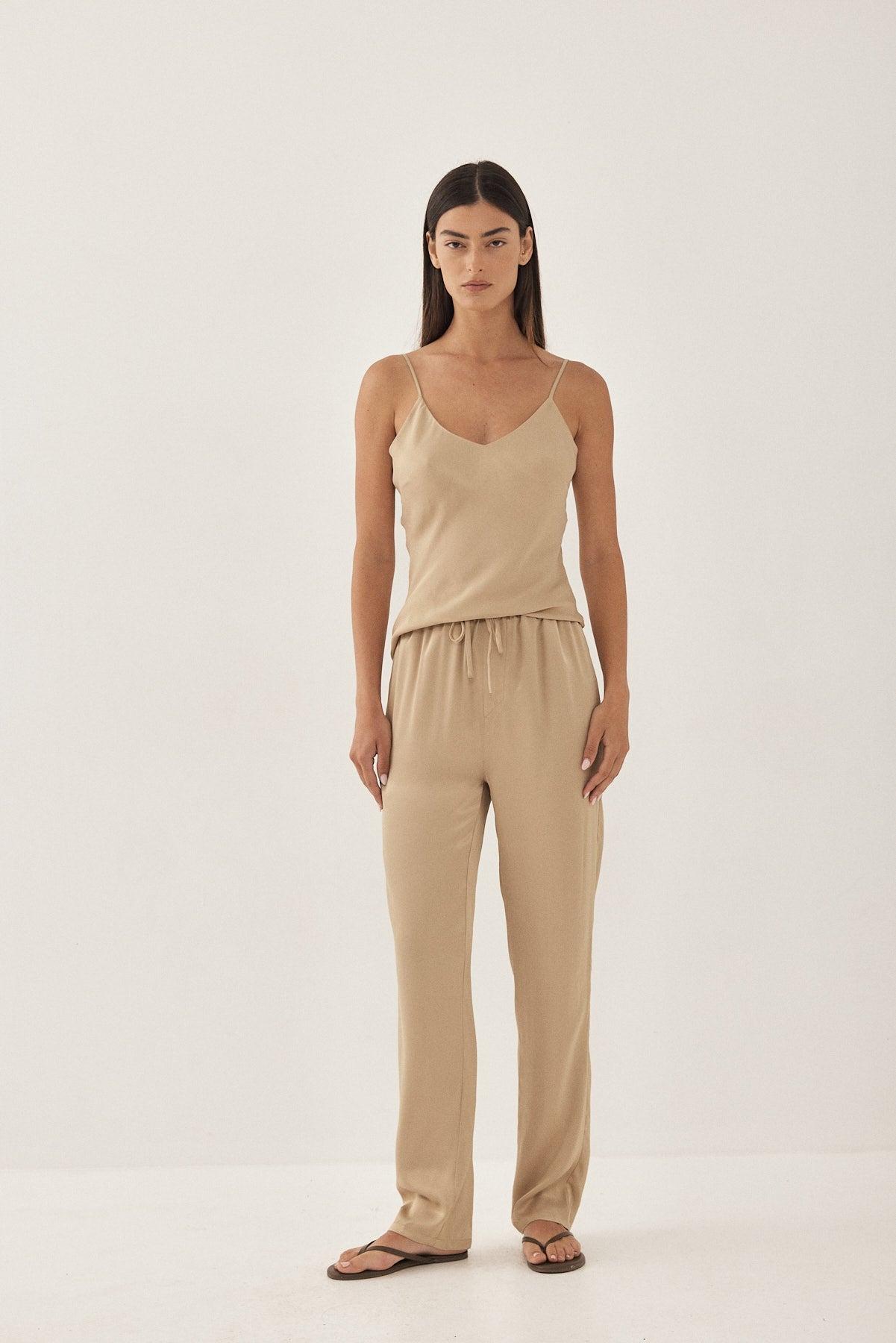 High waisted relaxed satin pants. Features a delicate drawstring and two side pockets. Made from breathable material. Cut in a special bias cut technique so that the materials falls smoothly and moves with your body. Style it with your favorite basic tank and a pair of slides for a casual and stylish look.