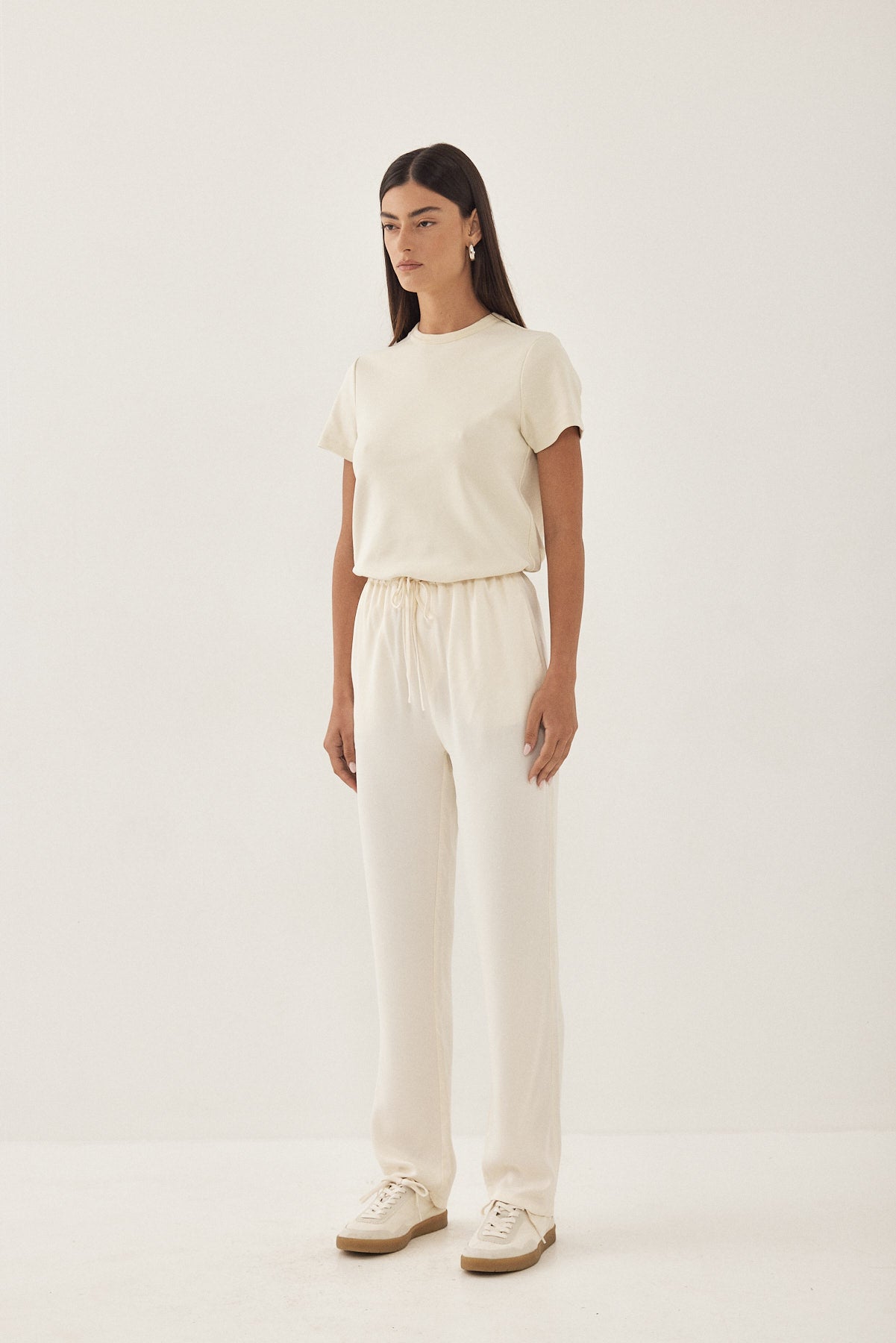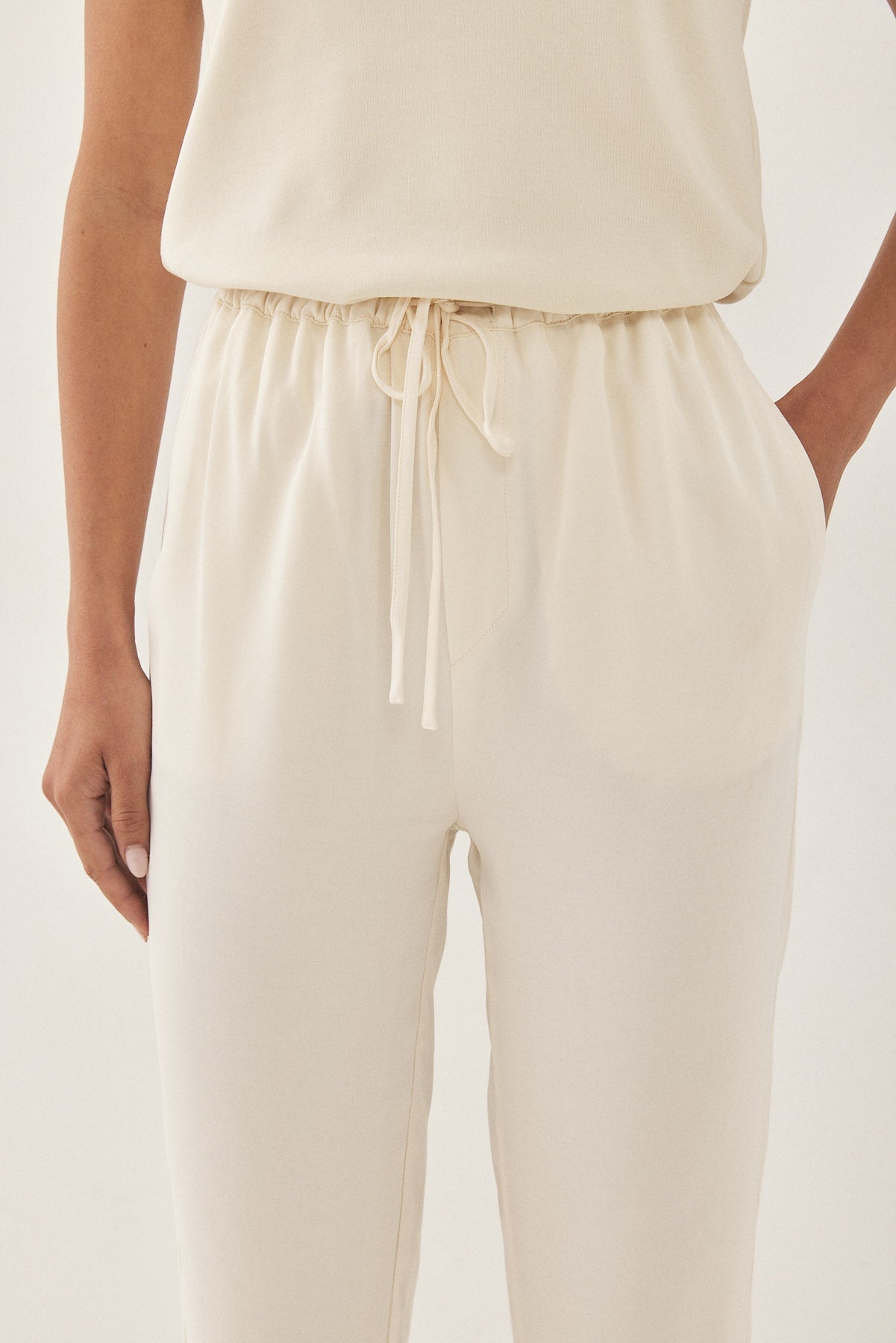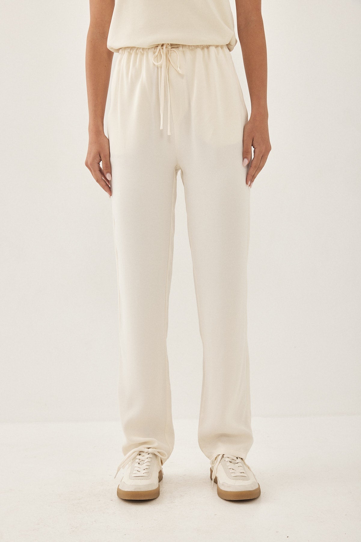 High waisted relaxed satin pants. Features a delicate drawstring and two side pockets. Made from breathable material. Cut in a special bias cut technique so that the materials falls smoothly and moves with your body. Style it with your favorite basic tank and a pair of slides for a casual and stylish look.