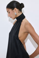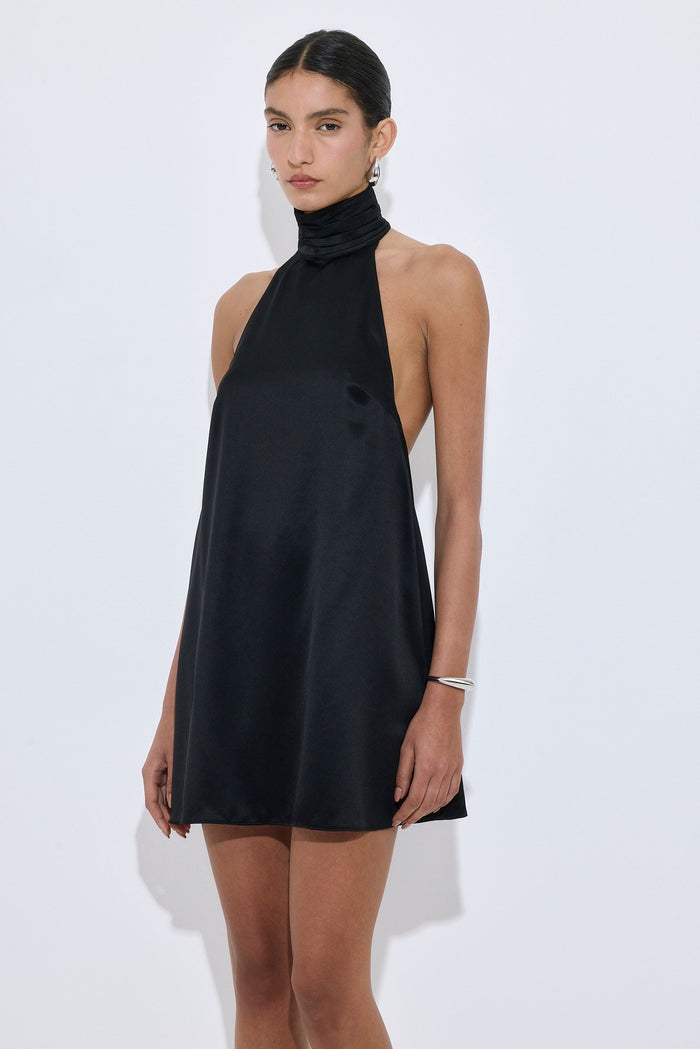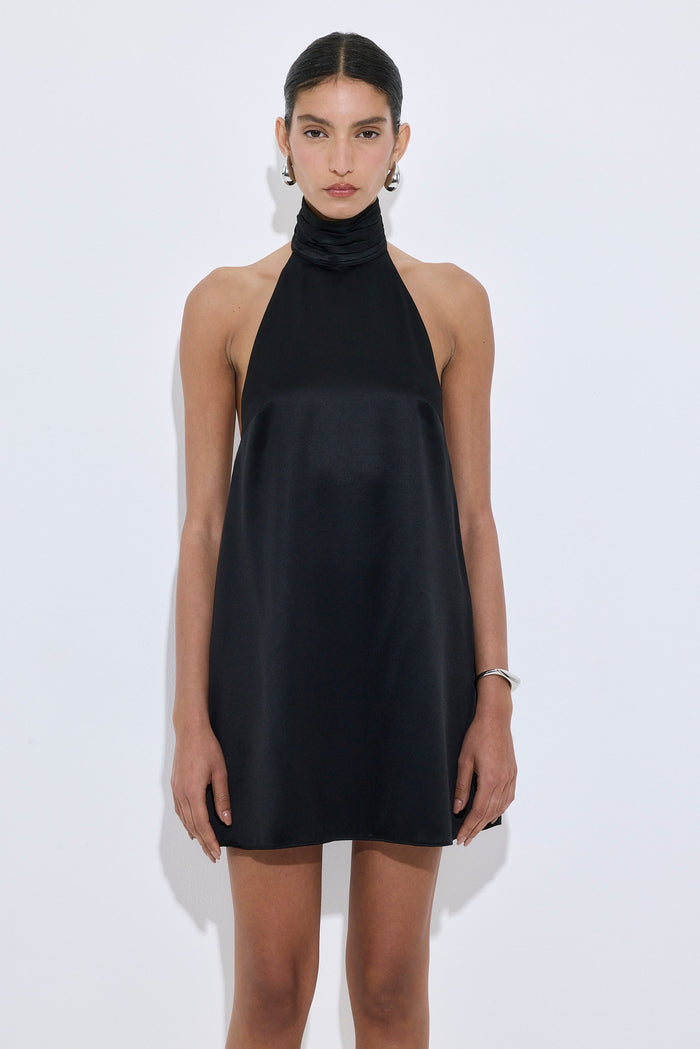 Our new high collar satin mini dress is a true must have in your summer occasion wardrobe. Mini length. Soft and luxurious satin fabric. Doesn't crease. High gathered collar. Deep open back. Flowy silhouette. Secured at the back with a delicate satin-covered button and loop closure for a seamless finish. Style it with our matching scrunchie for the chicest evening wear outfit.