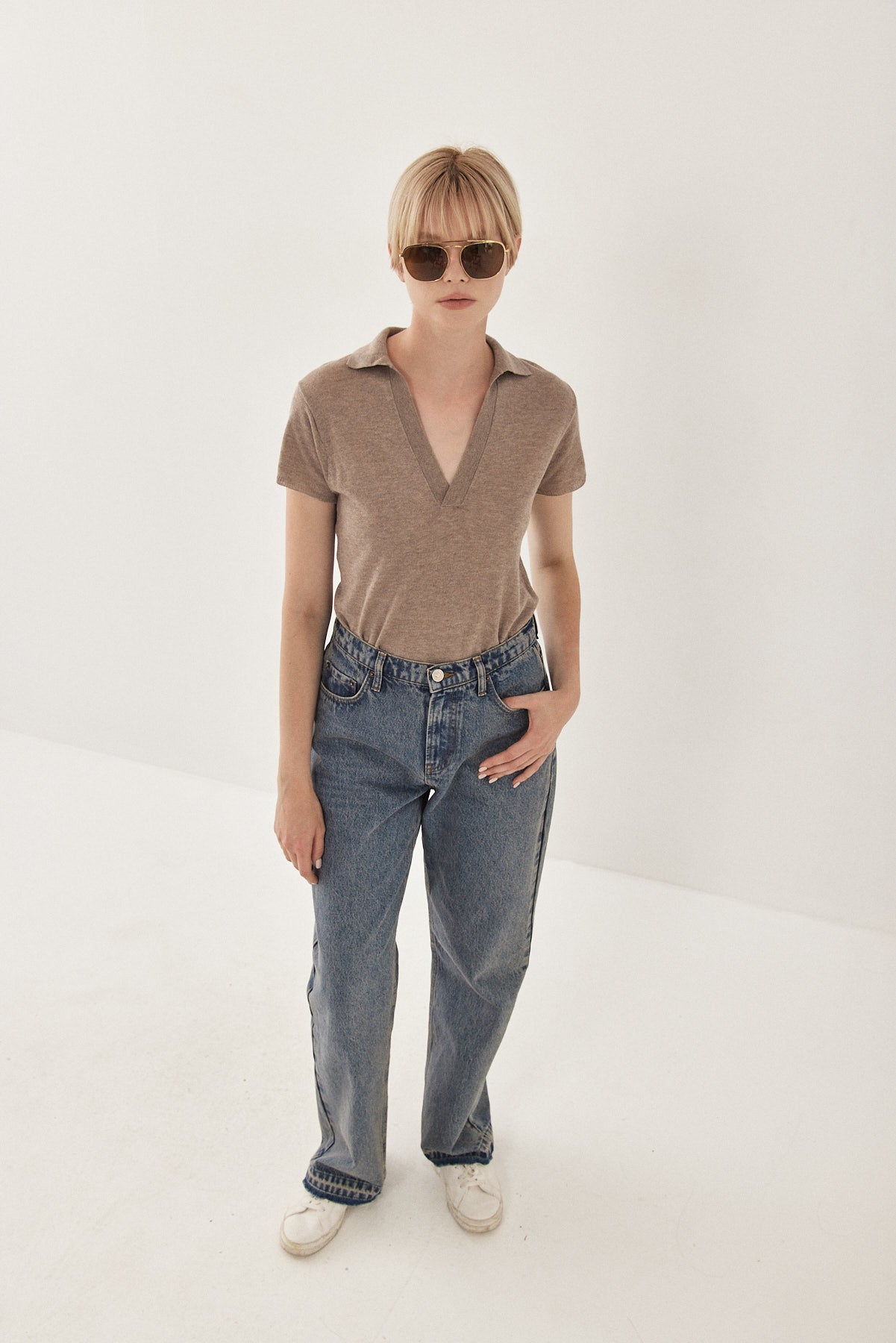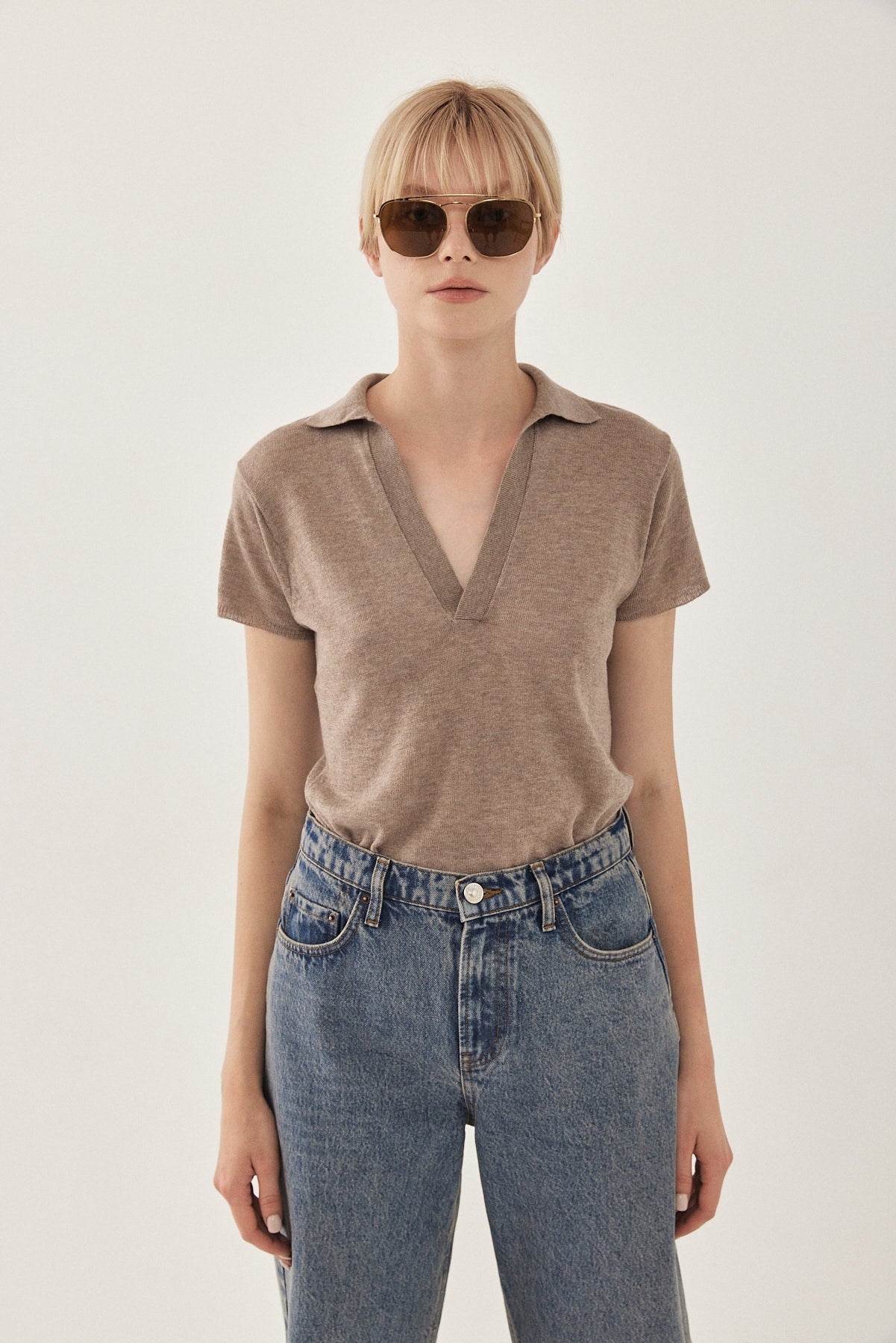 The perfect summer essential for building effortlessly chic looks. Short sleeve light knitted polo t shirt. Delicate V neckline. Style it with our baggy denim shorts, our Croco belt and a pair of slides for a stylish everyday look.