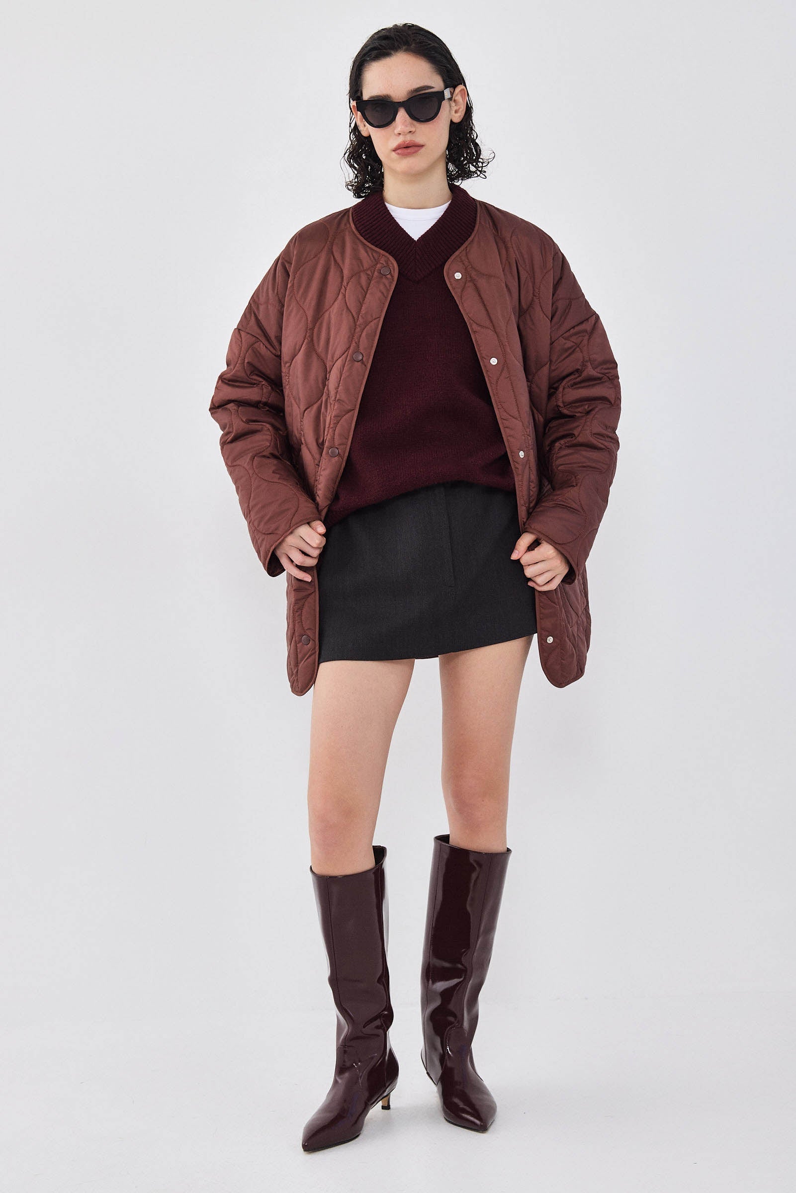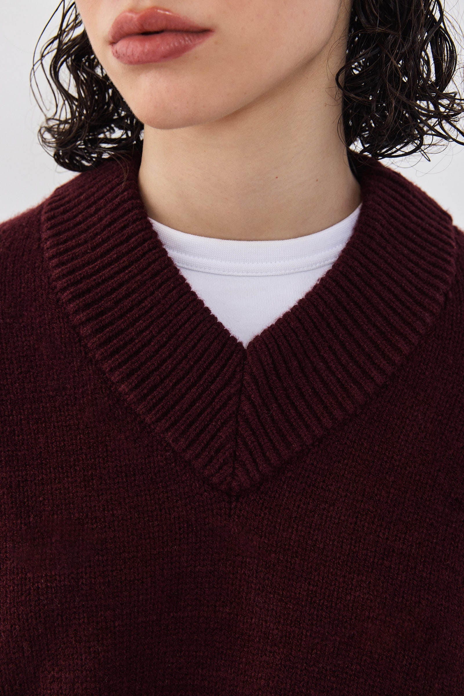 The coziest addition to our luxurious fully fashioned knitwear. Wide ribbed v neck sweater. Oversized fit for the coziest feel. Drop shoulder sleeves. Wide ribbed finish. Silicone tonal logo patch on the back. Layer it over a classic white tee, your favorite daddy mini skirt and knee high boots for a Parisian winter look.