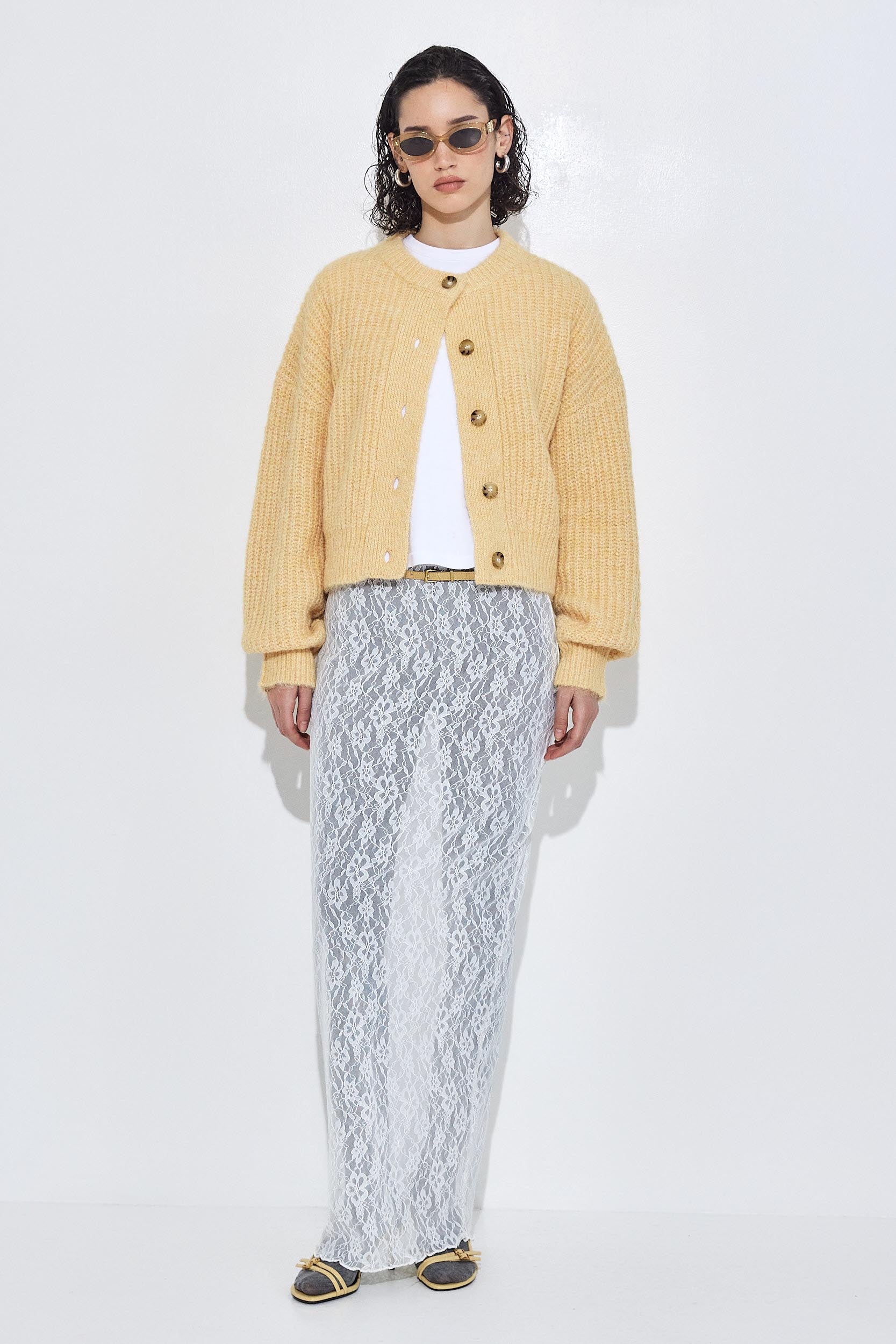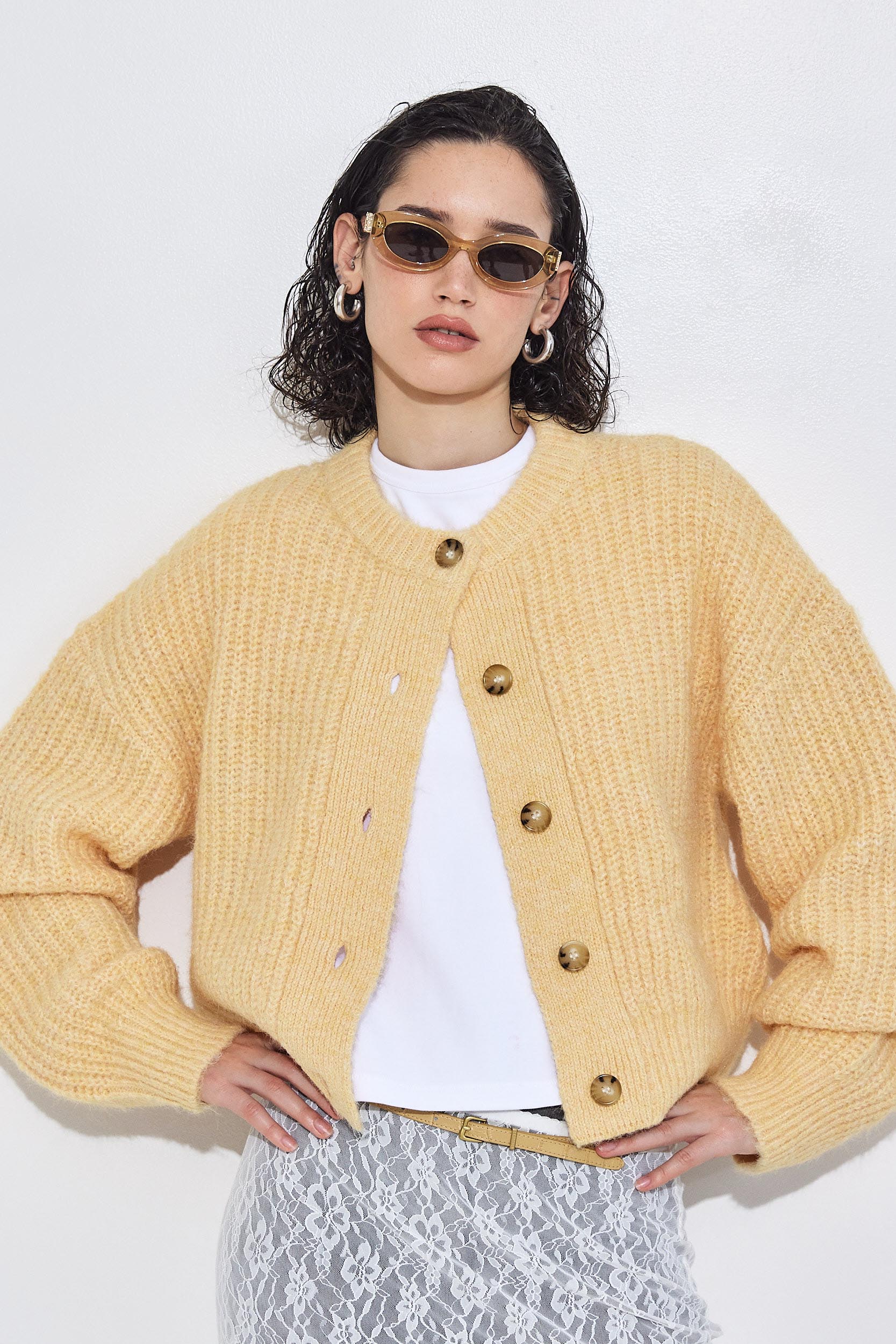 Get warm and cozy with our new fuzzy cardigan. Slightly cropped fit. Soft and hugging fabric. Ribbed crew neckline. Ribbed cuffs and hems. Tortoise logo engraved button closure. Cable knitting. Style it with our daddy wide leg pants, lettuce hem socks and our beautiful vegan leather bomber for a chic day to night look.