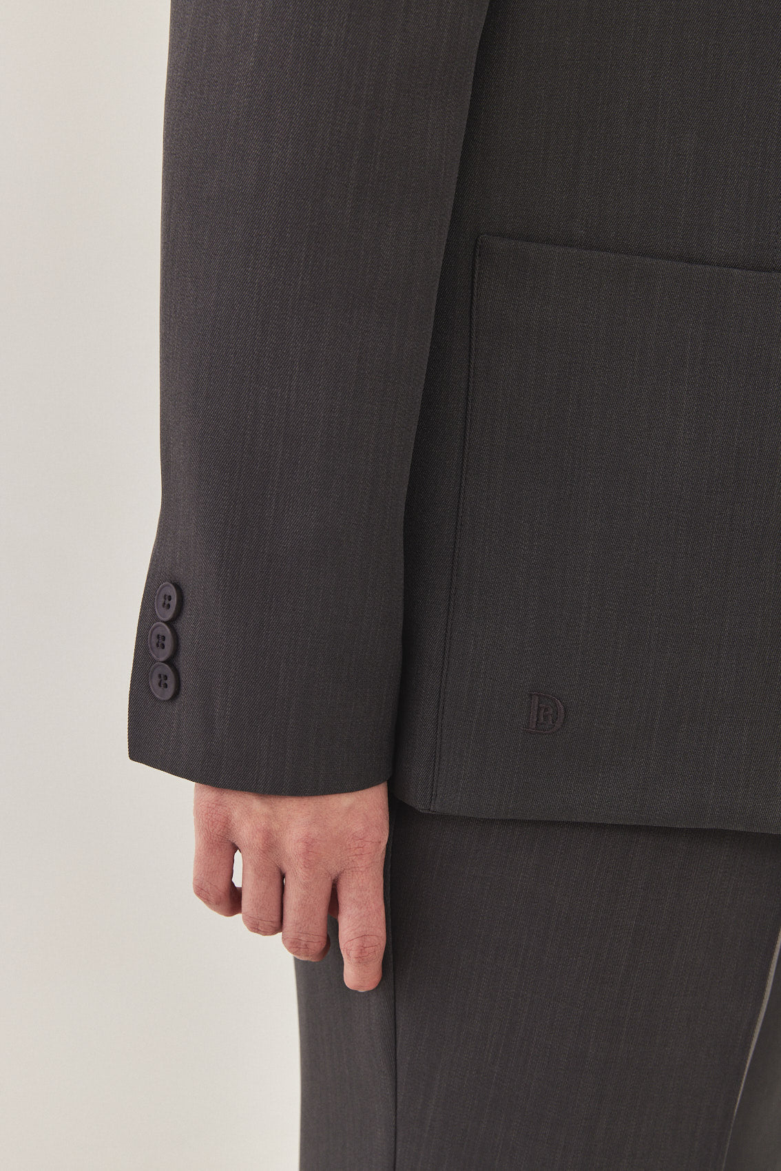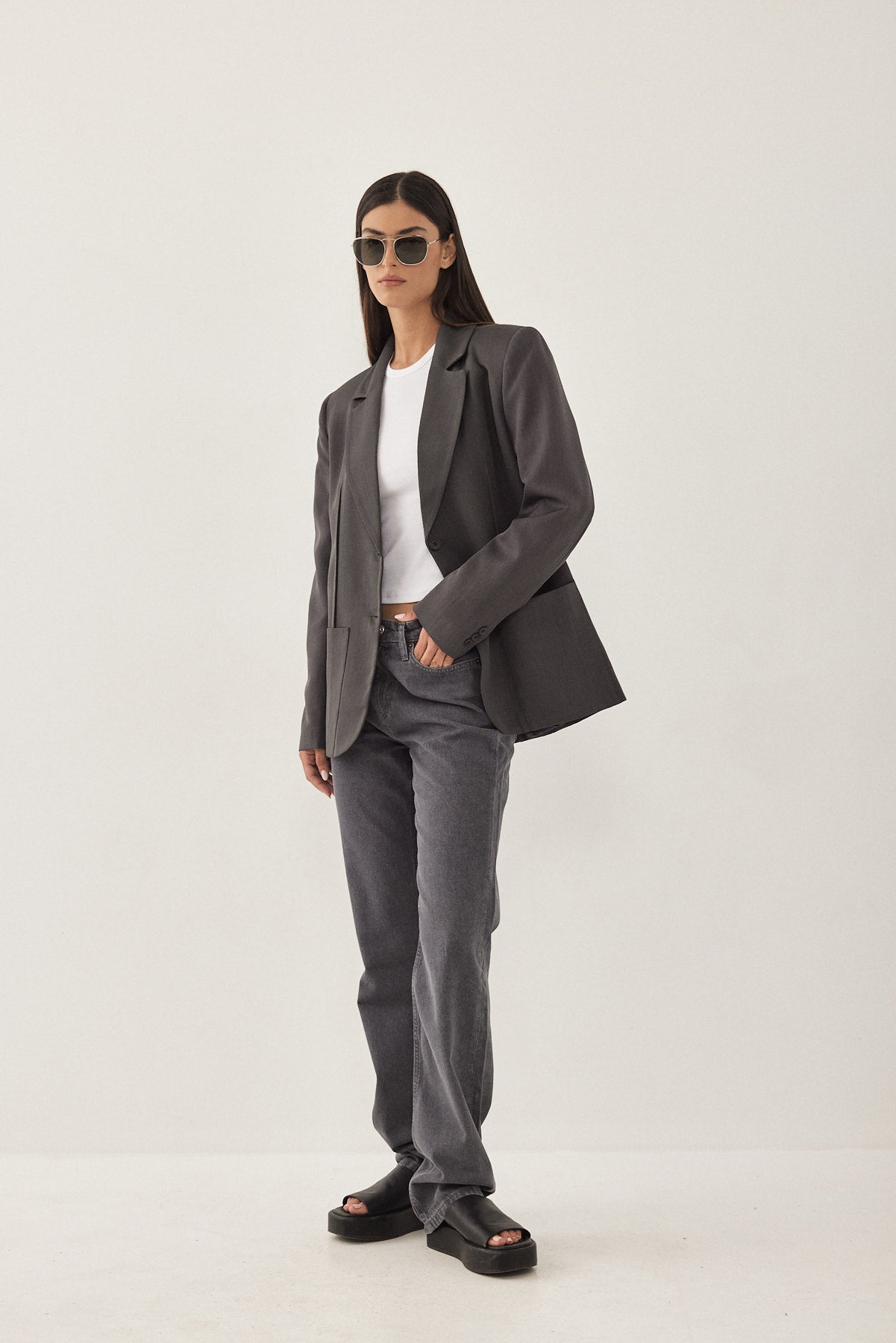 A classic masculine cut in a loose silhouette, reminiscent of men's blazers. Features a lapel collar and long sleeves with pronounced shoulders. Front button closure and two front pockets. Back embroidered logo detail on the collar and on the side pocket. Style it with your favorite top and matching daddy pants.