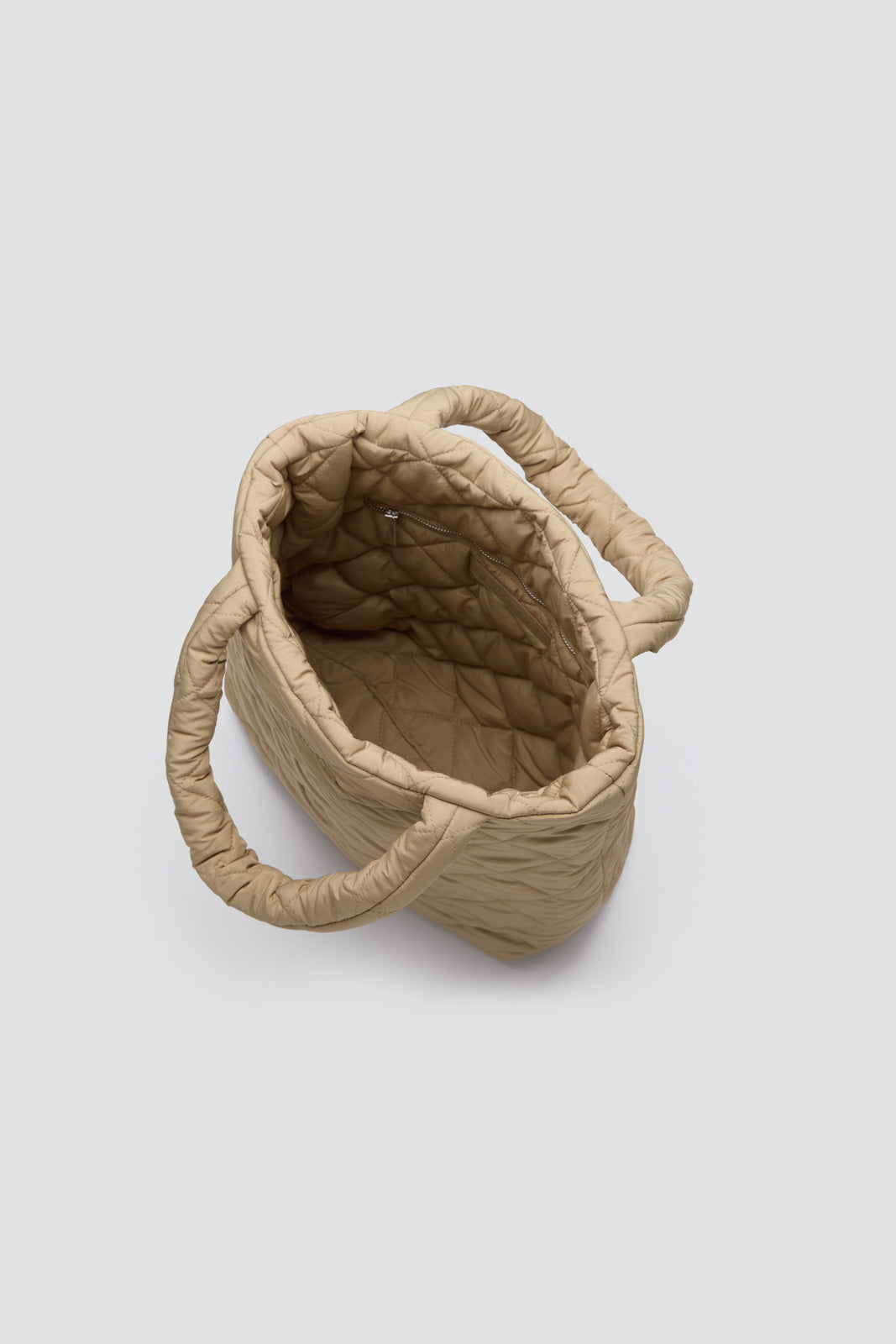 The newest addition to our Quilt Carry All Bags; versatile sizes for everyday use. Boxy. Diamond pattern. Unlined. Tonal silicon logo. Features two inside pockets; one patch pocket, one zipper pocket. Debossed tonal faux leather patch on the inside. Can carry up to 4KG. Style it with our new effortless Lounge Set and chic Cat Eye Sunglasses for an elevated, everyday look.
