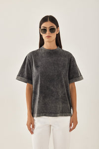 A classic oversized t shirt. Featuring a crew neckline and folded hem sleeves. Sits loosely on the body. Perfect to pair with your favorite pair of denim, a kitten heel and a pair of sunnies for the perfect everyday look.