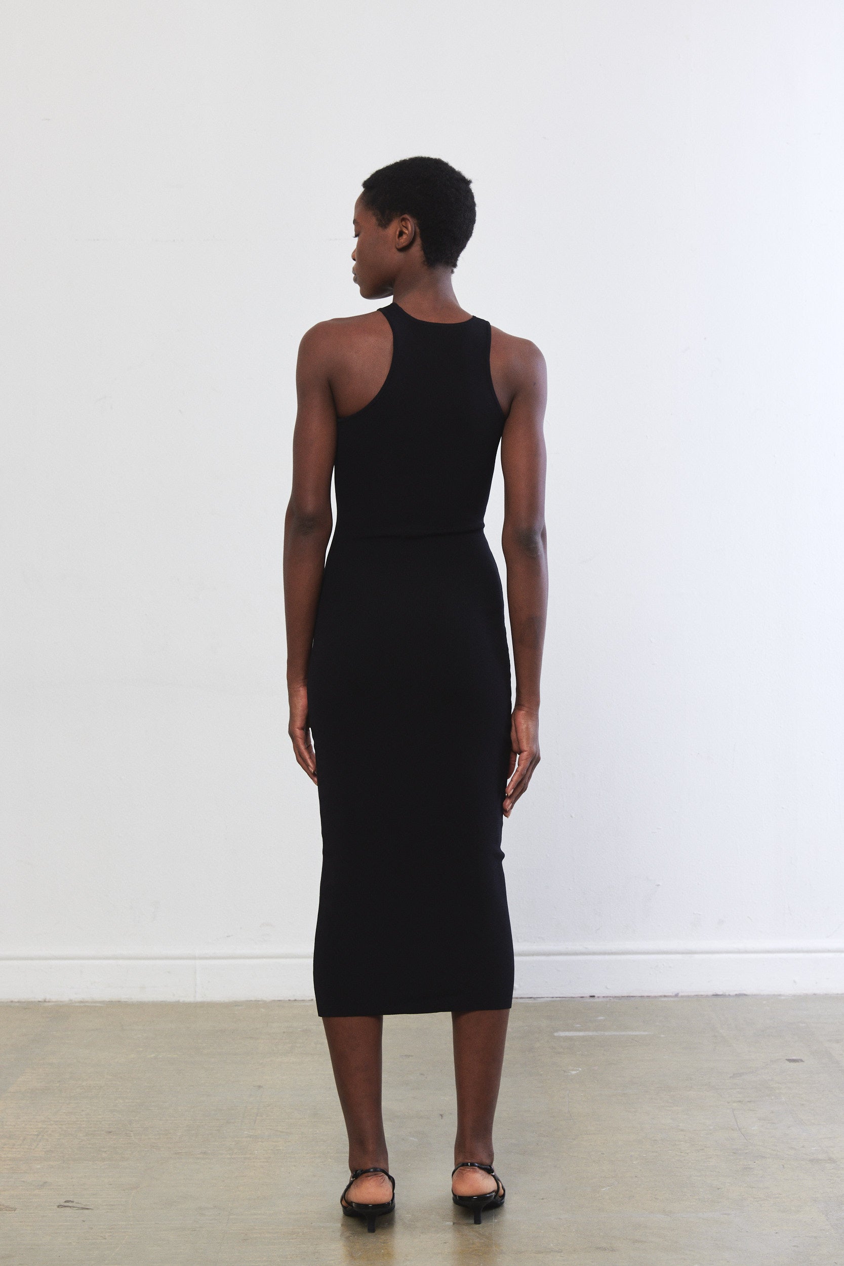Midi length dress with a close, second skin silhouette. Features an asymmetrical neckline. Made from a knitted fabric with fully fashion finishes. Complete the look with a classic heel or flat sandals.