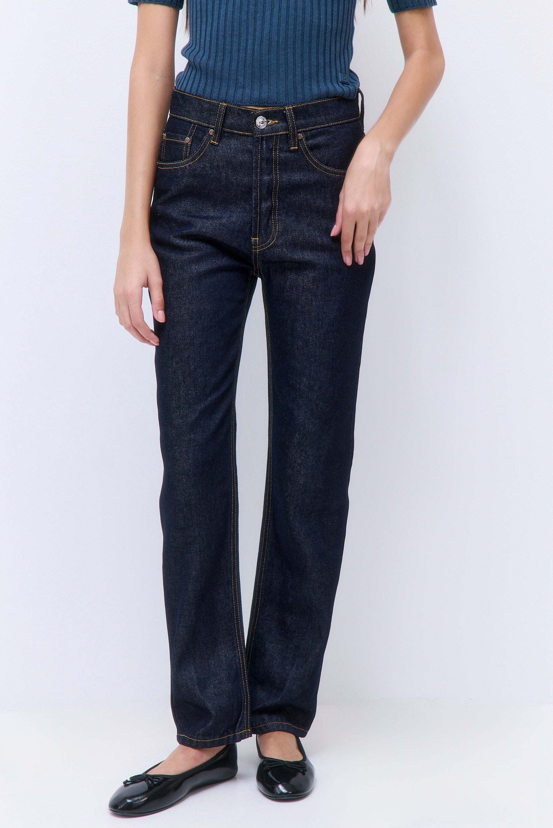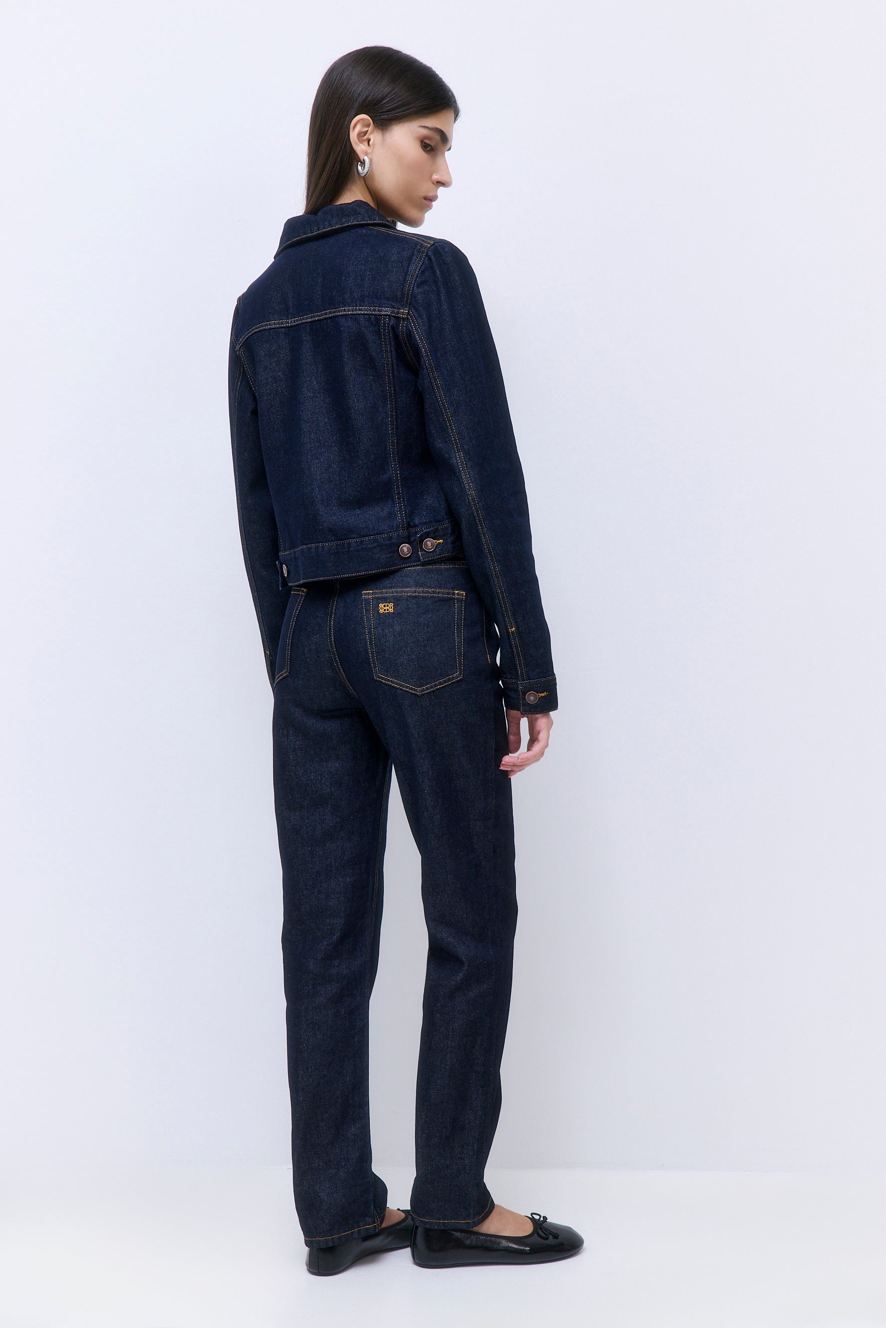 Our No.6 denim is a high waisted full length fit. An essential addition to your wardrobe. Front buttoned closure. Features a logo detail embroidered at the back pocket. Style it with our timeless Oversized Cropped Double Breasted Trench Coat and timeless Soft Ribbed Crew Neck for the ultimate Fall look.