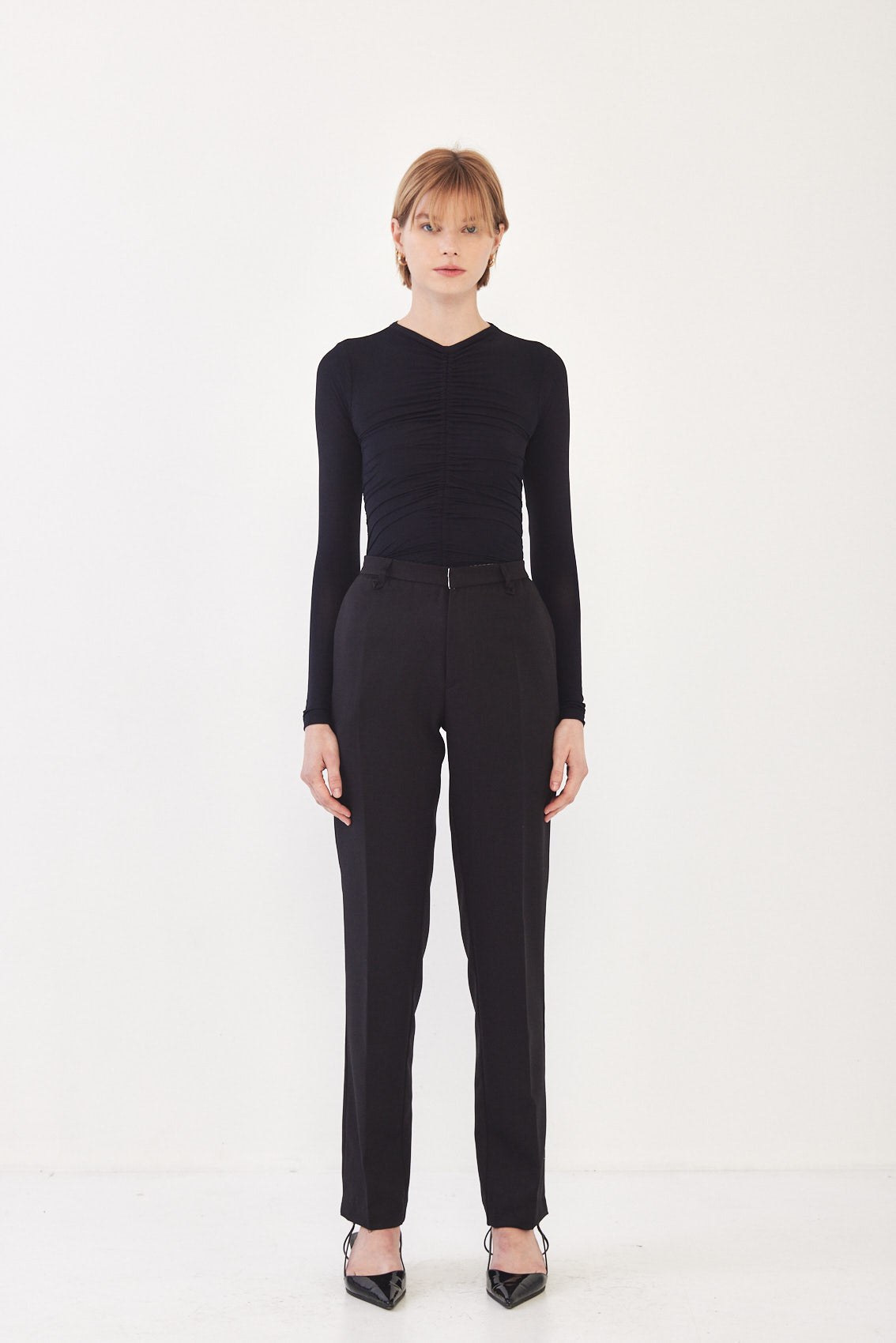 A close fit long sleeve top. Made from a thin elastic fabric. Features front and back gathering details and a nicki neckline. Complete the look with any high waisted bottoms.