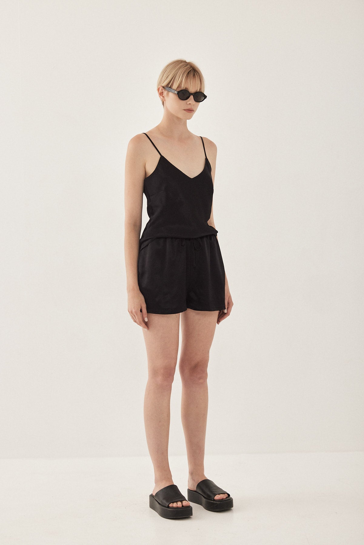 Satin slip camisole. Featuring a v neckline and thin adjustable straps. Made from breathable material. Cut in a special bias cut technique so that the materials falls smoothly and moves with your body. Style yours with the matching satin shorts, our round sunglasses and your favorite shoulder bag for an effortlessly chic look.