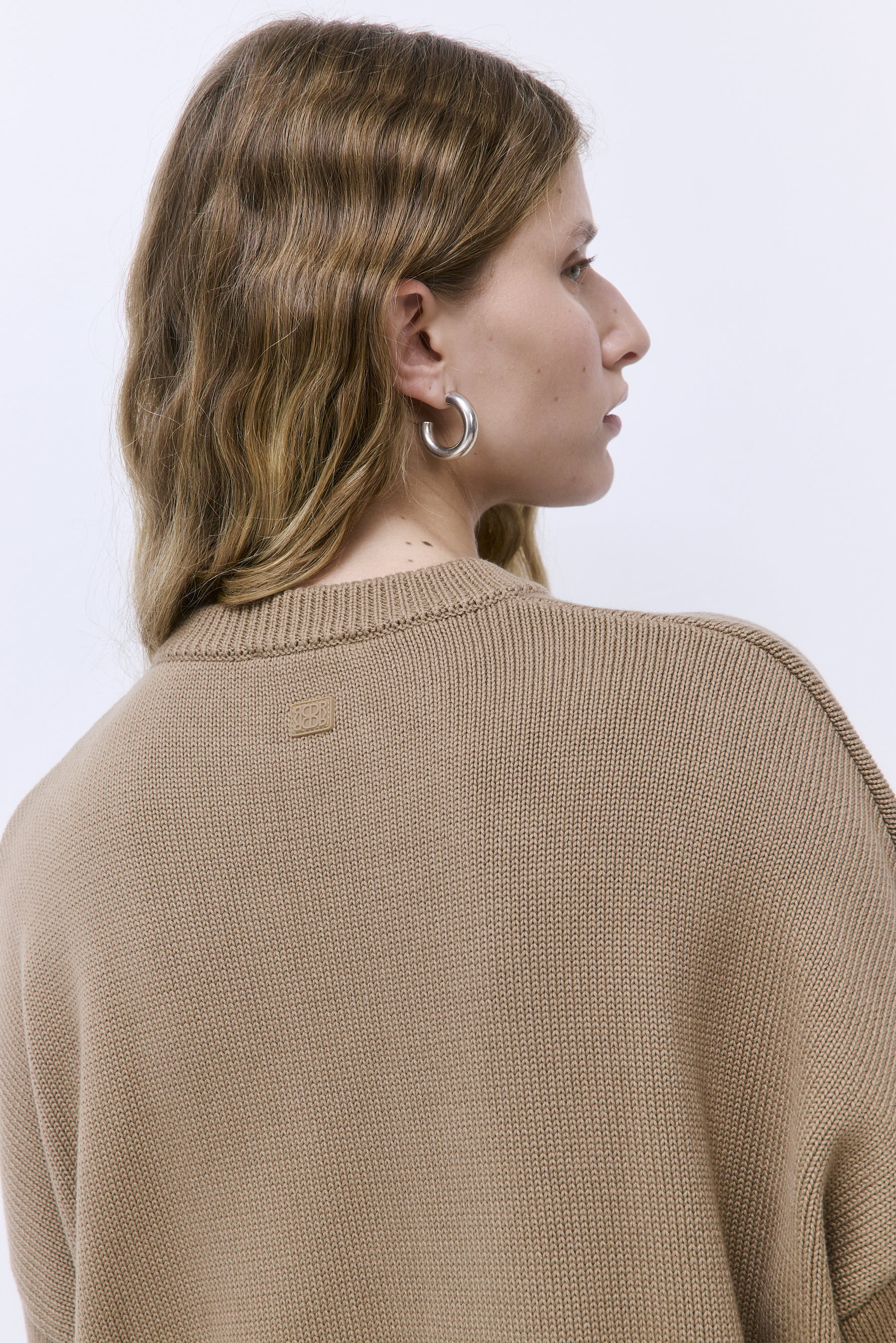 The perfect cozy winter essential. Crew neckline. Oversized fit. Slits on the side. Dropped shoulders. Wide rib hem. Tonal silicon logo on the back. Fully fashioned. Style it with our with our chic Sheer Midi Skirt and pair these with our iconic Yvon Shoulder Bag for an effortless everyday look.