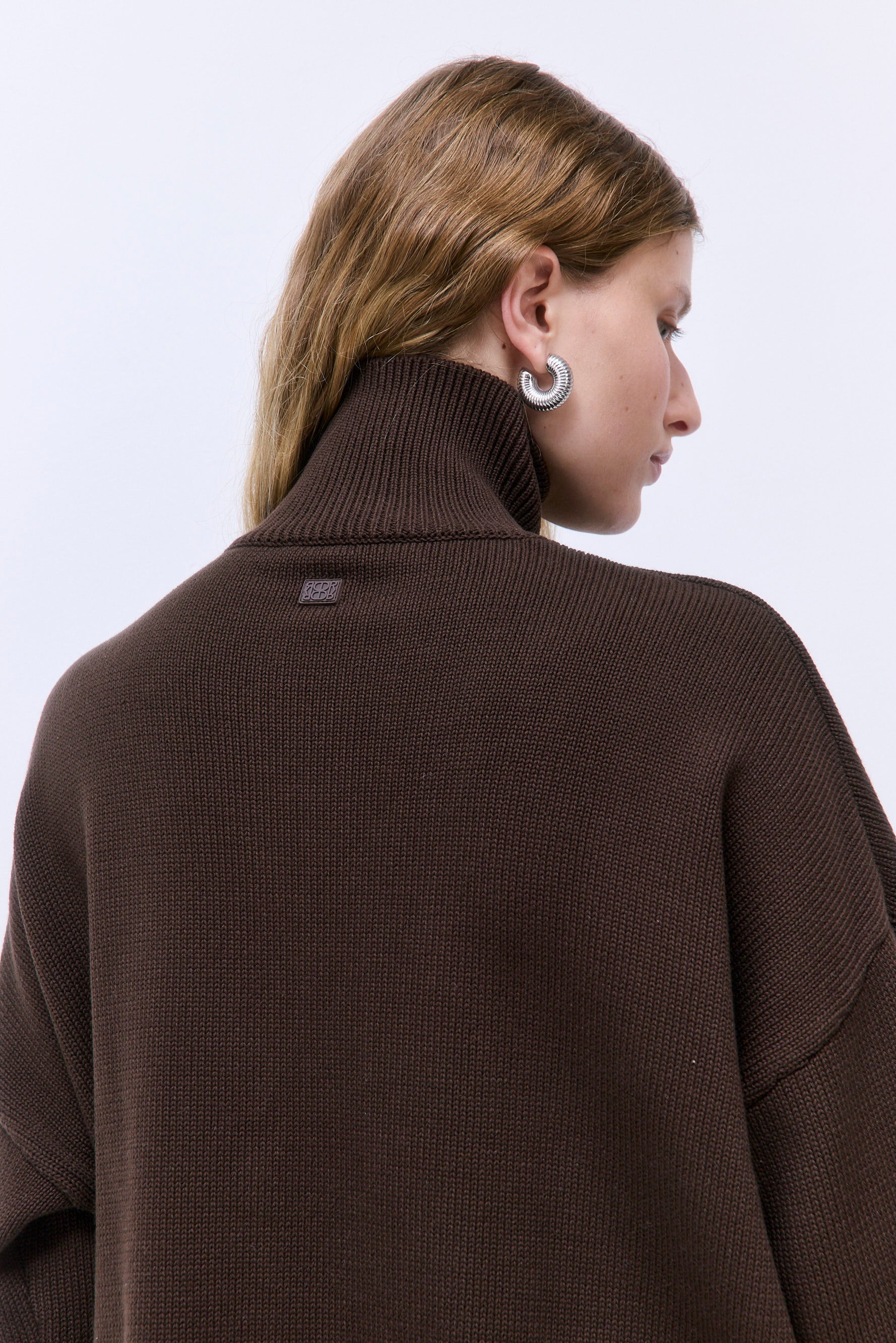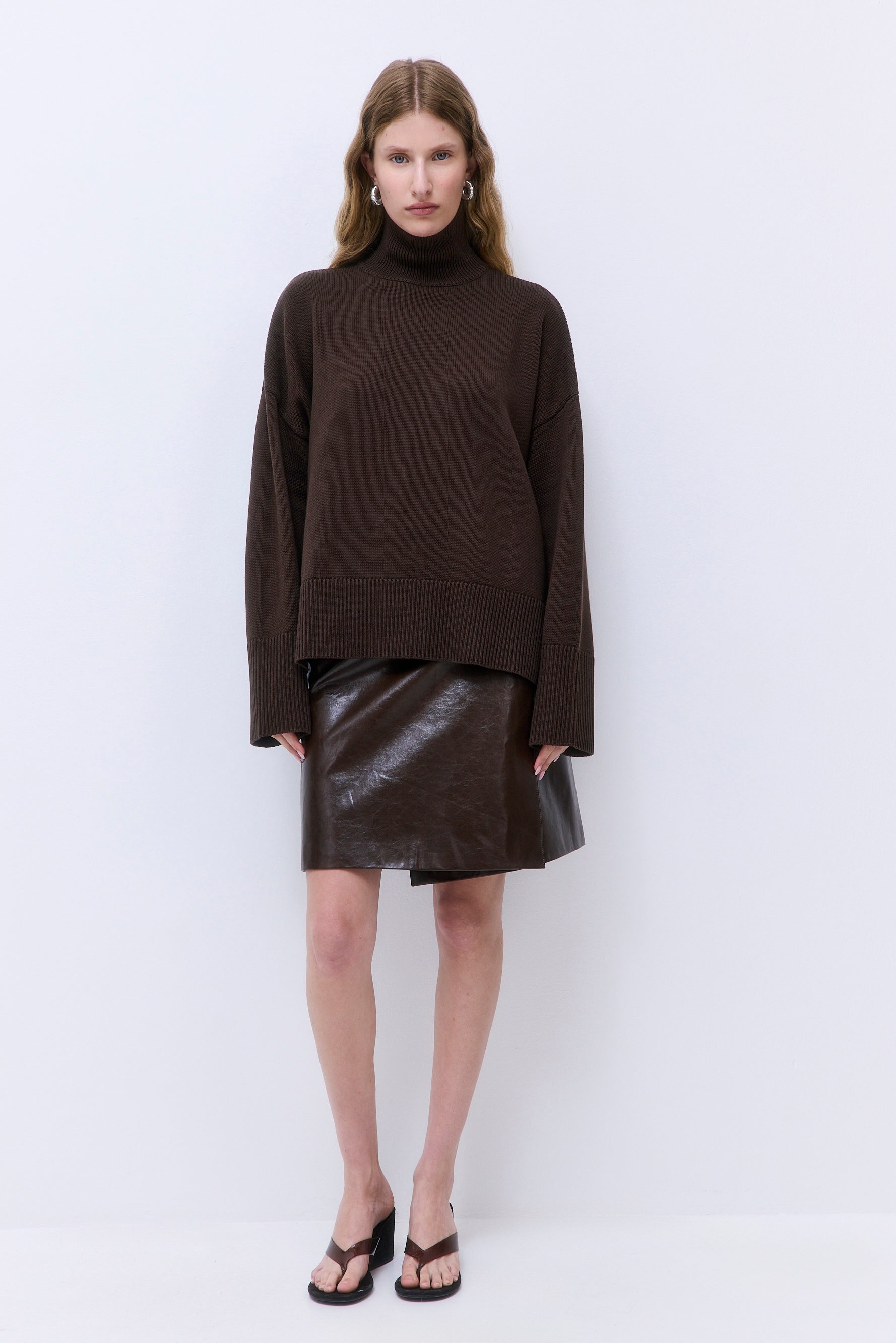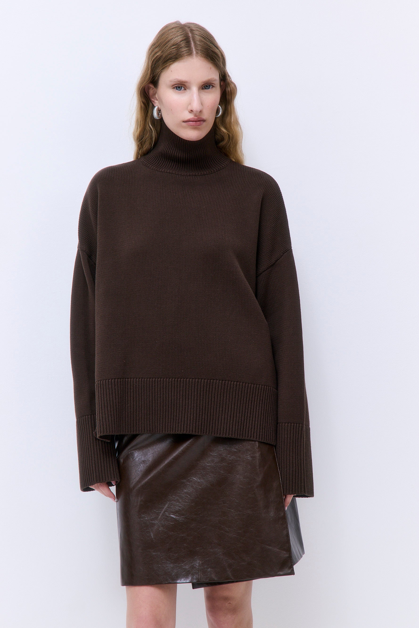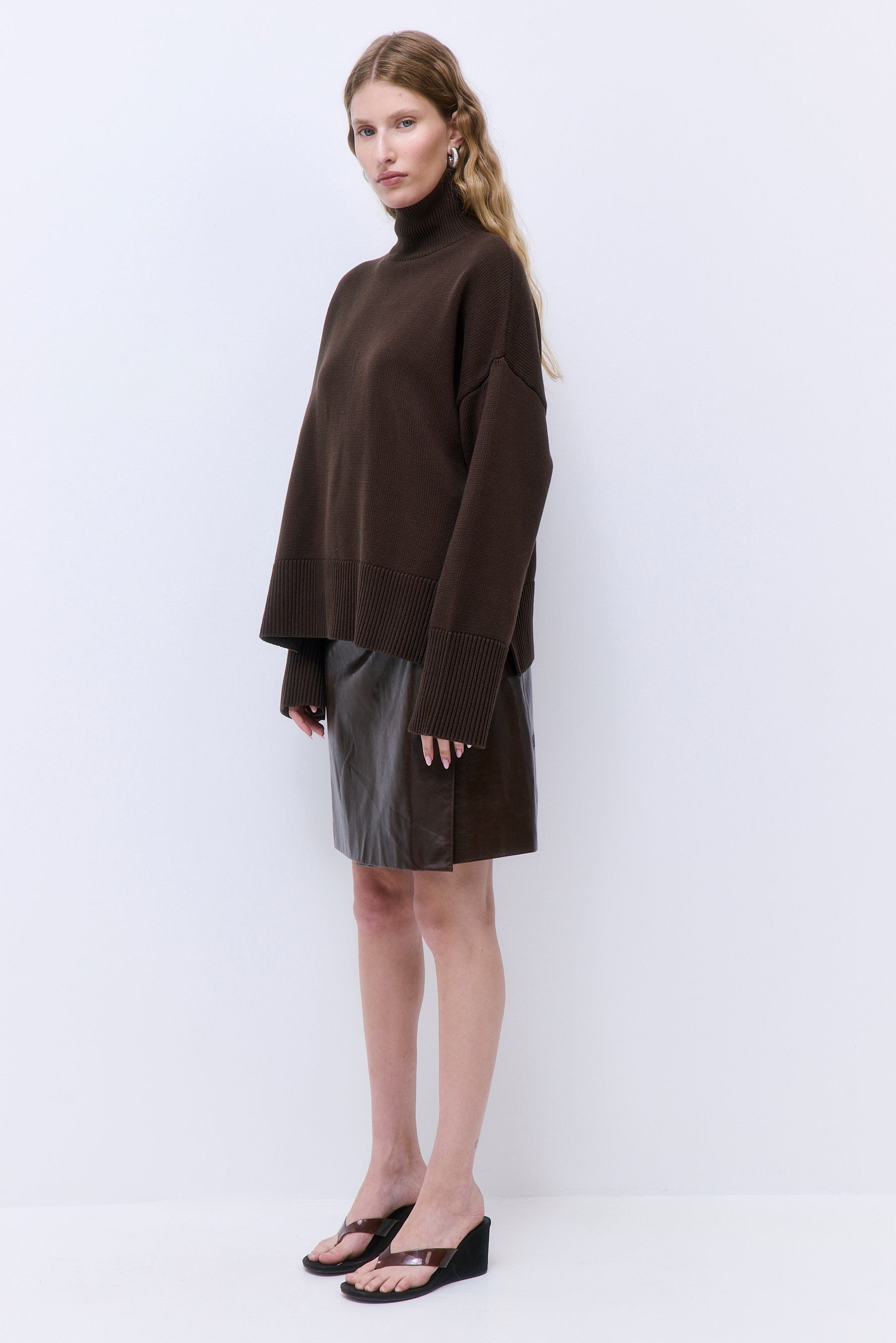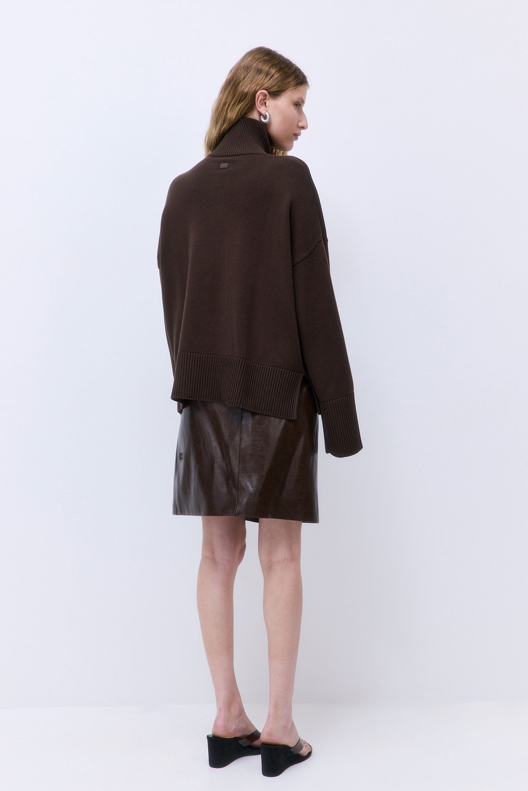 The perfect cozy winter essential. Turtleneck. Oversized fit. Slits on the side. Dropped shoulders. Wide rib hem. Tonal silicon logo on the back. Fully fashioned. Style it with our with our chic Sheer Midi Skirt and pair these with our iconic Yvon Shoulder Bag for an effortless everyday look.