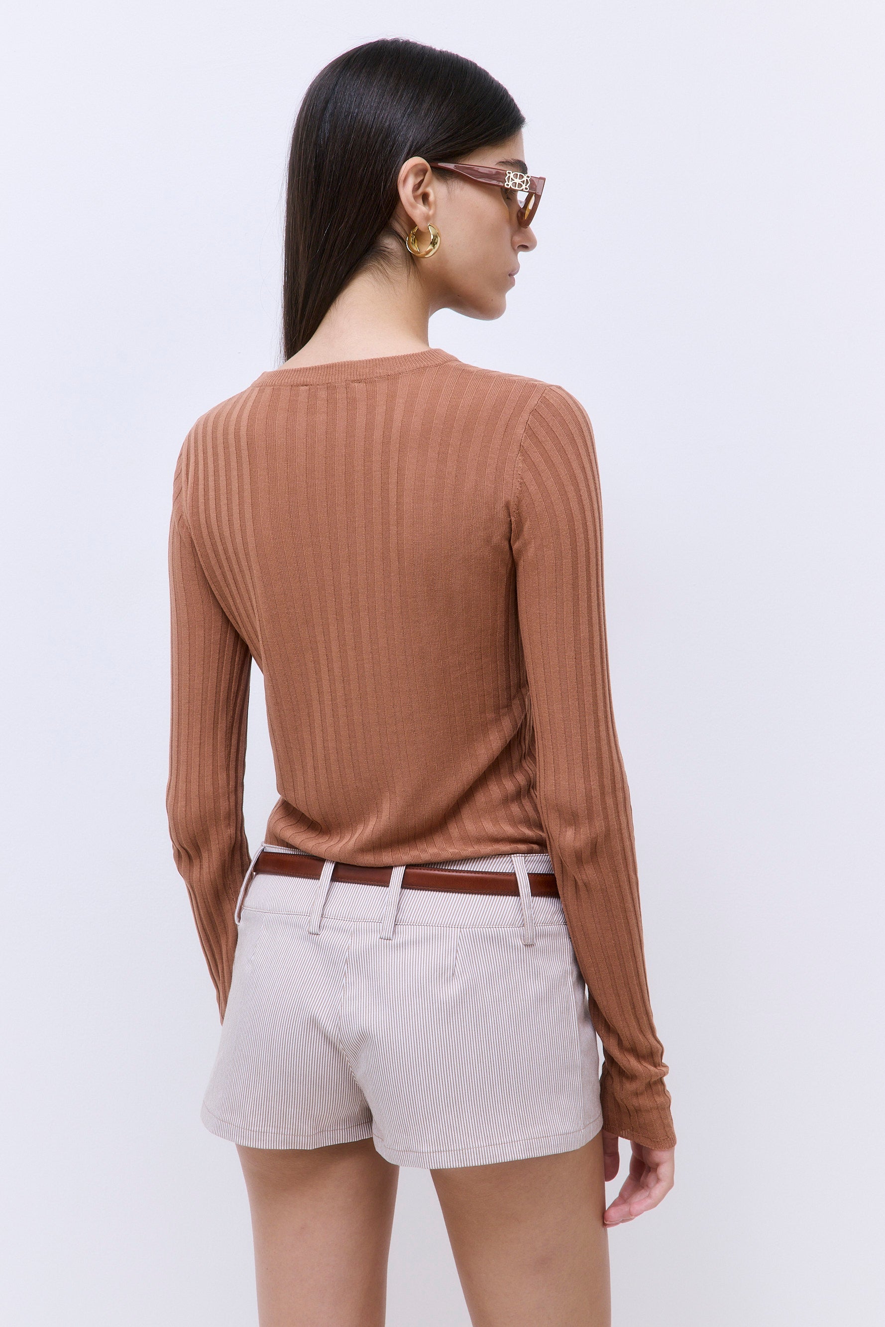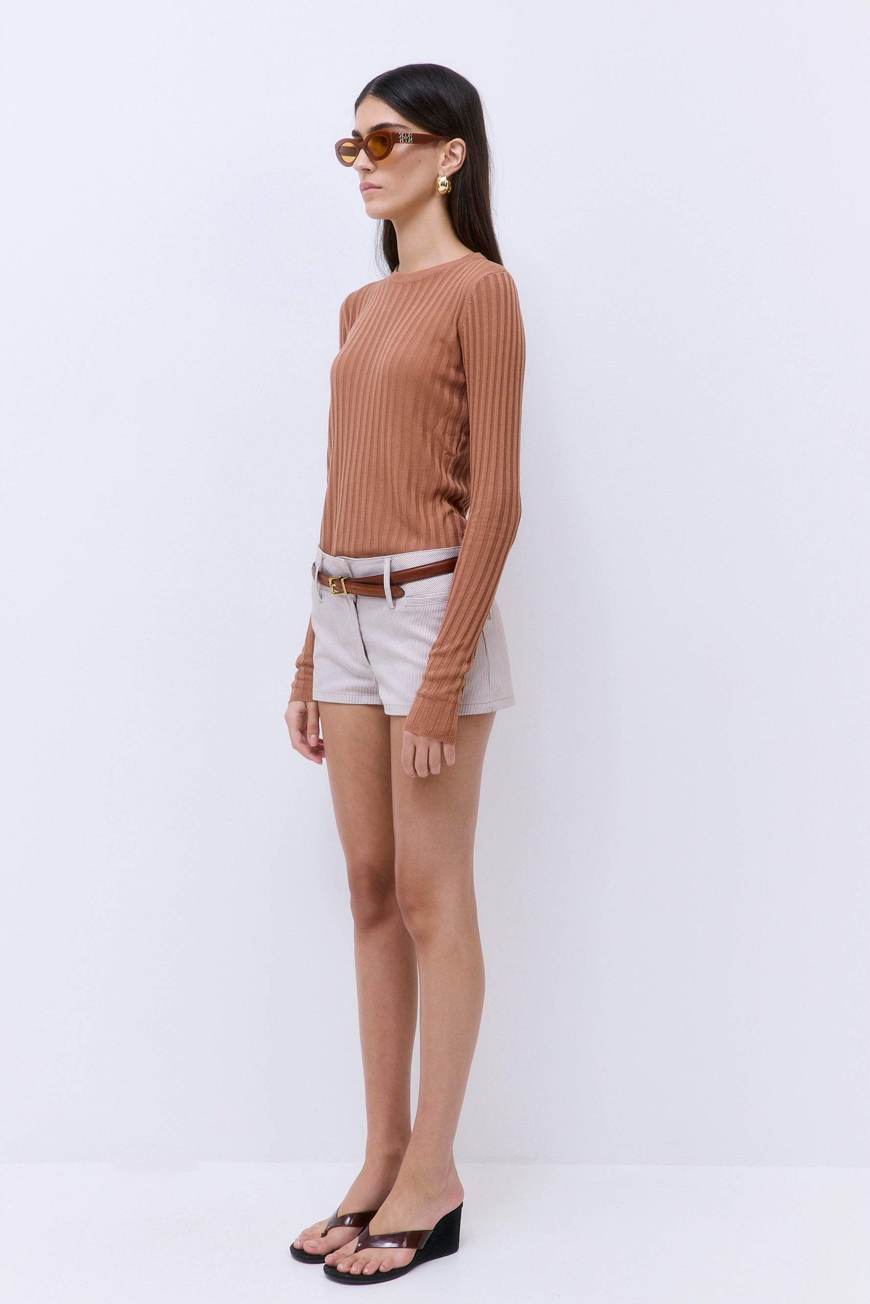A staple piece for every capsule wardrobe. Ribbed crew neck. Ribbed finish. Slim fit. Full length. Fully fashioned. Clean finishes. Pair it with our stylish Micro Mini Skirt and our sleek Rodika Tote Bag for an everyday effortless look.