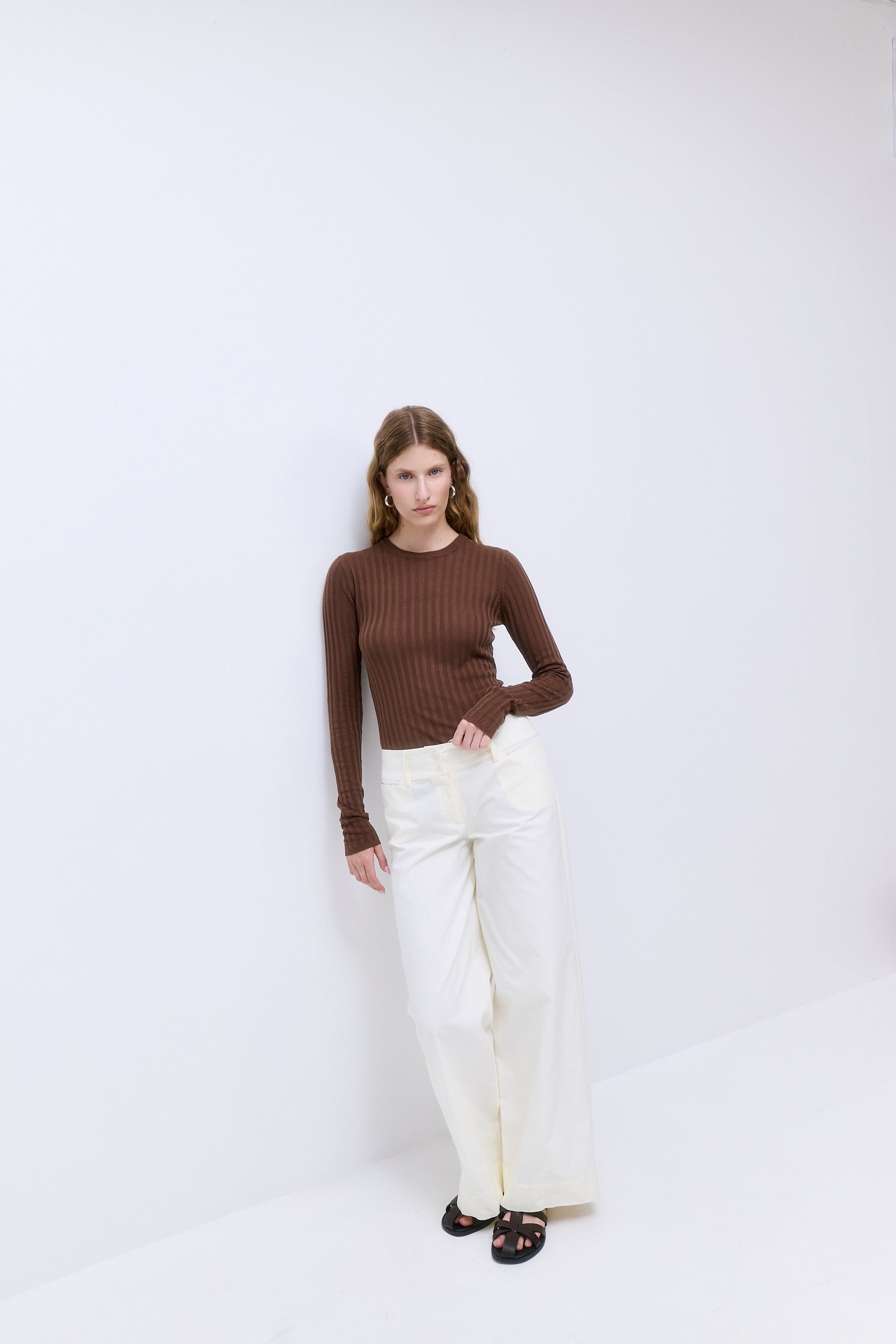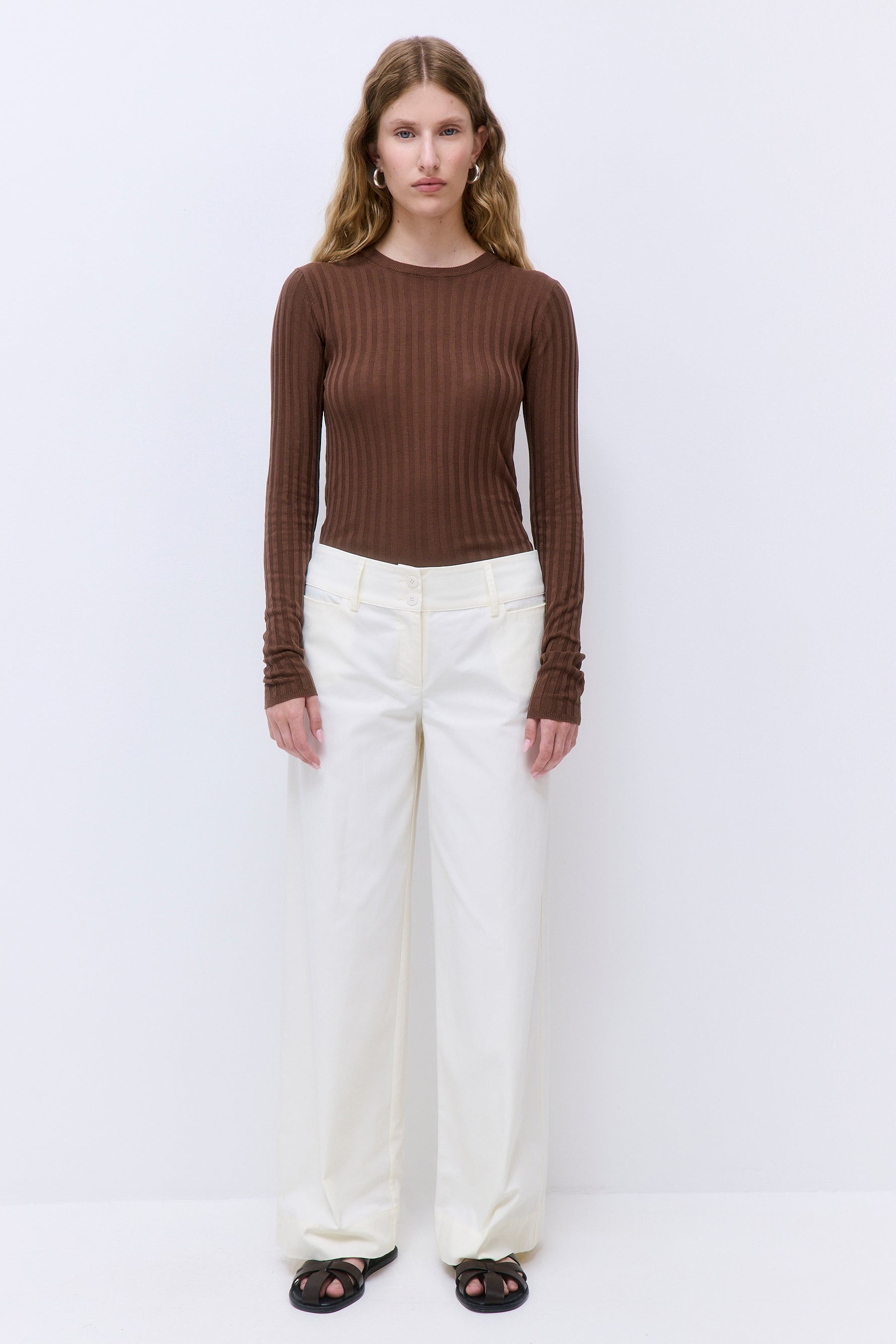 A staple piece for every capsule wardrobe. Ribbed crew neckline. Ribbed finish. Slim fit. Full length. Fully fashioned. Clean finishes. Pair it with our stylish Micro Mini Skirt and our sleek Rodika Tote Bag for an everyday effortless look.