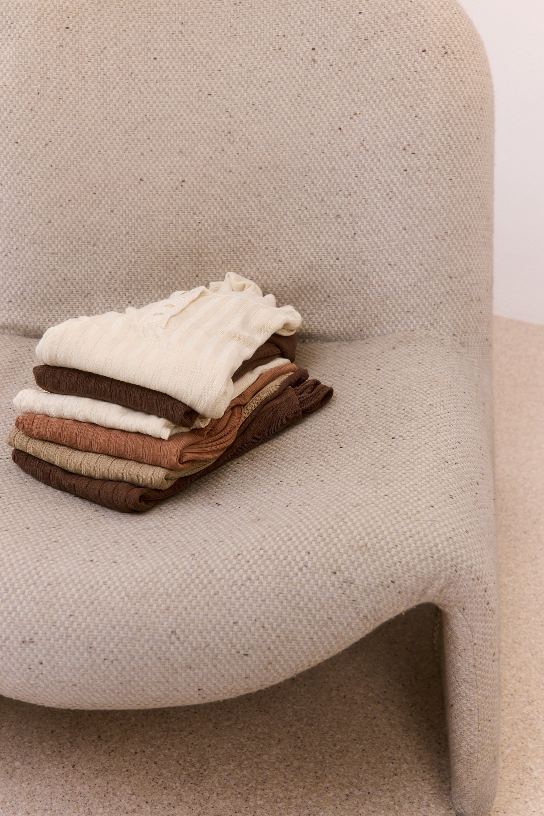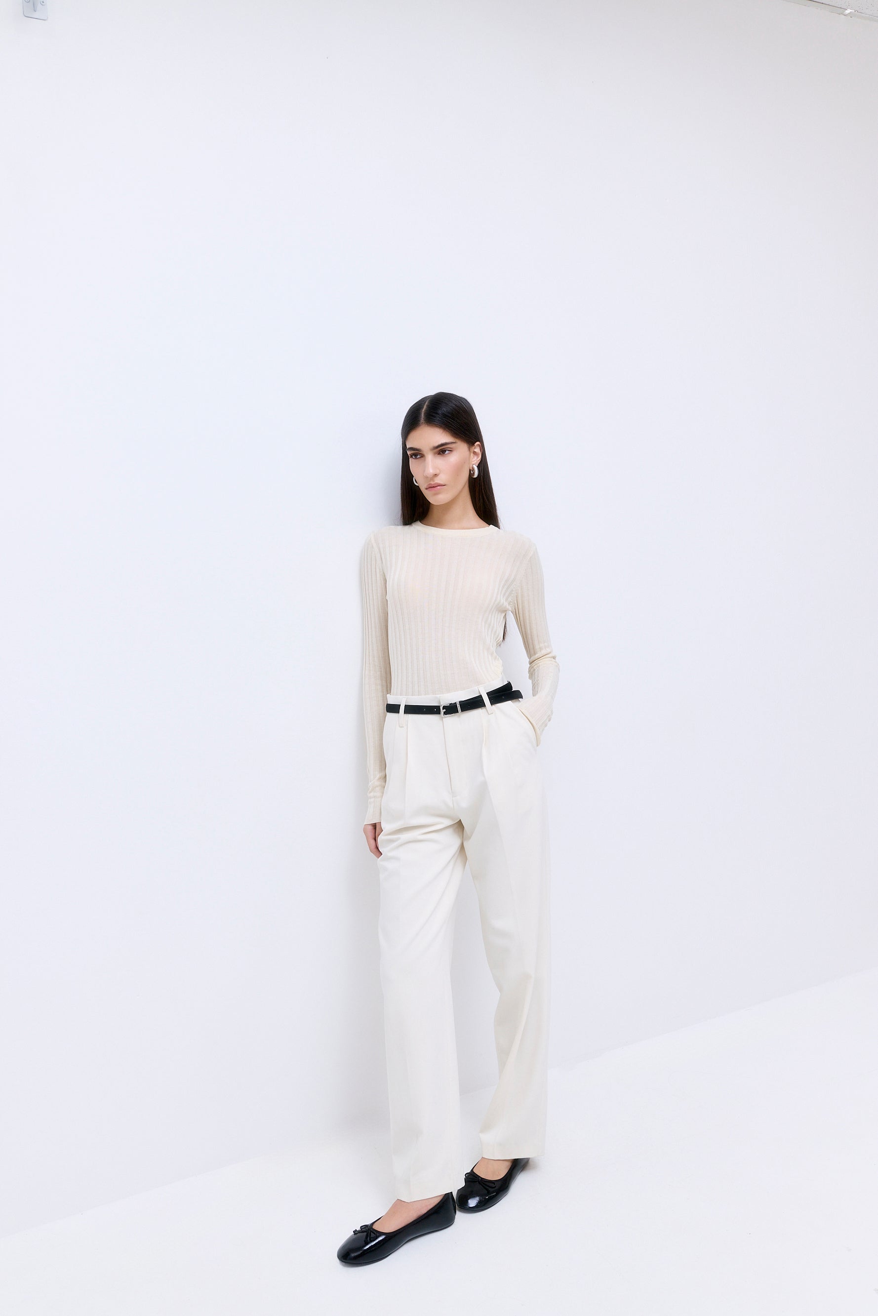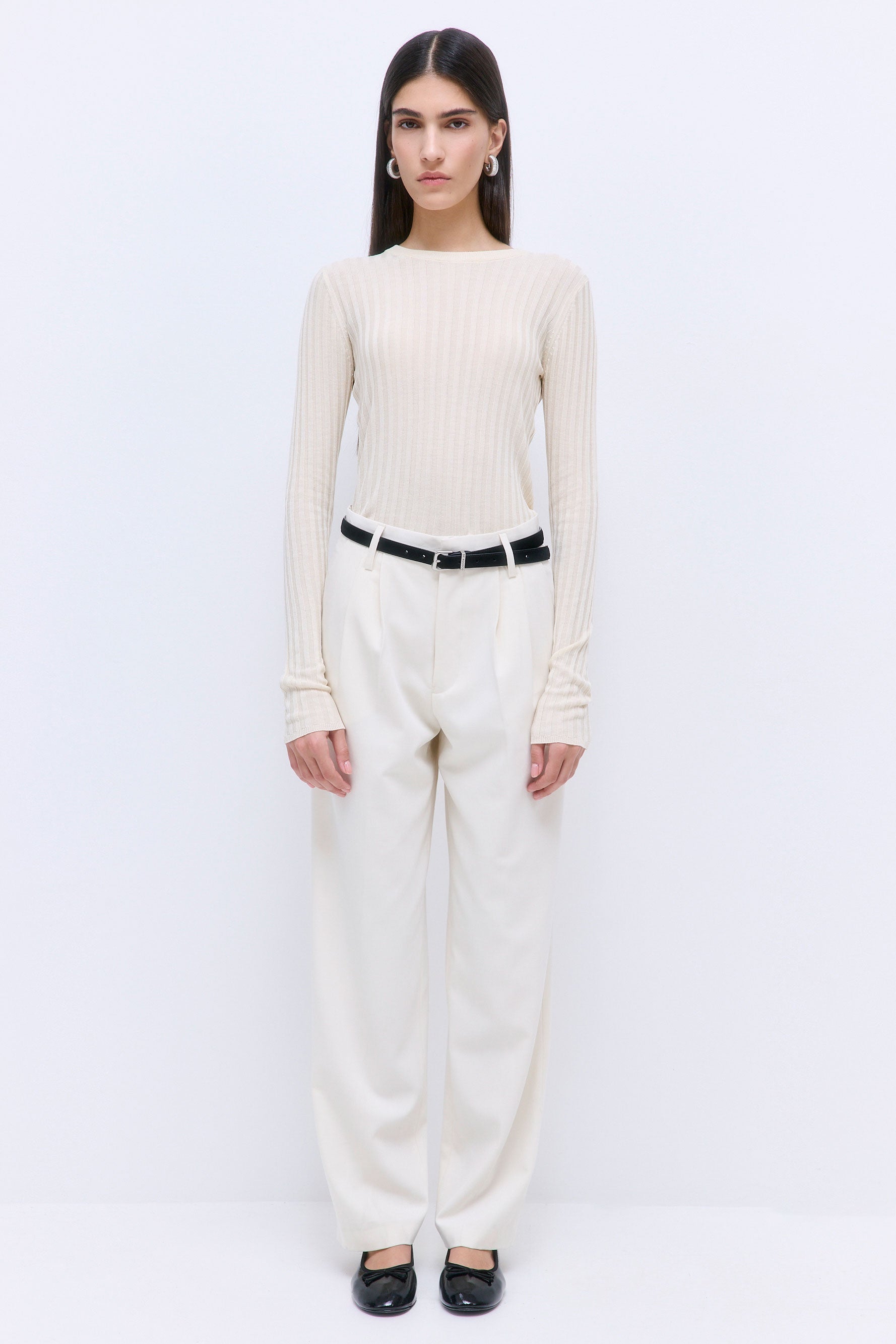 A staple piece for every capsule wardrobe. Ribbed crew neck. Ribbed finish. Slim fit. Full length. Fully fashioned. Clean finishes. Pair it with our stylish Micro Mini Skirt and our sleek Rodika Tote Bag for an everyday effortless look.