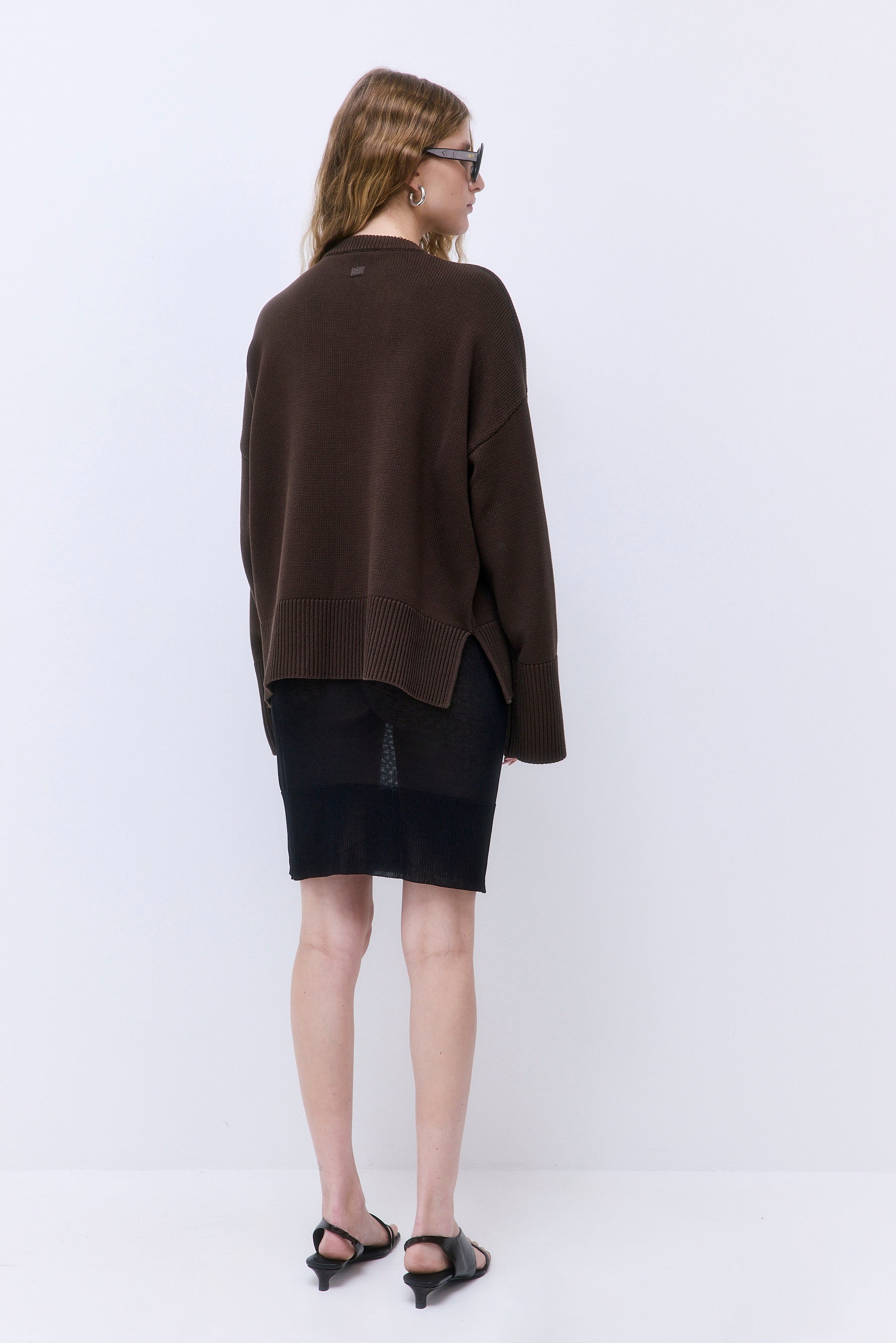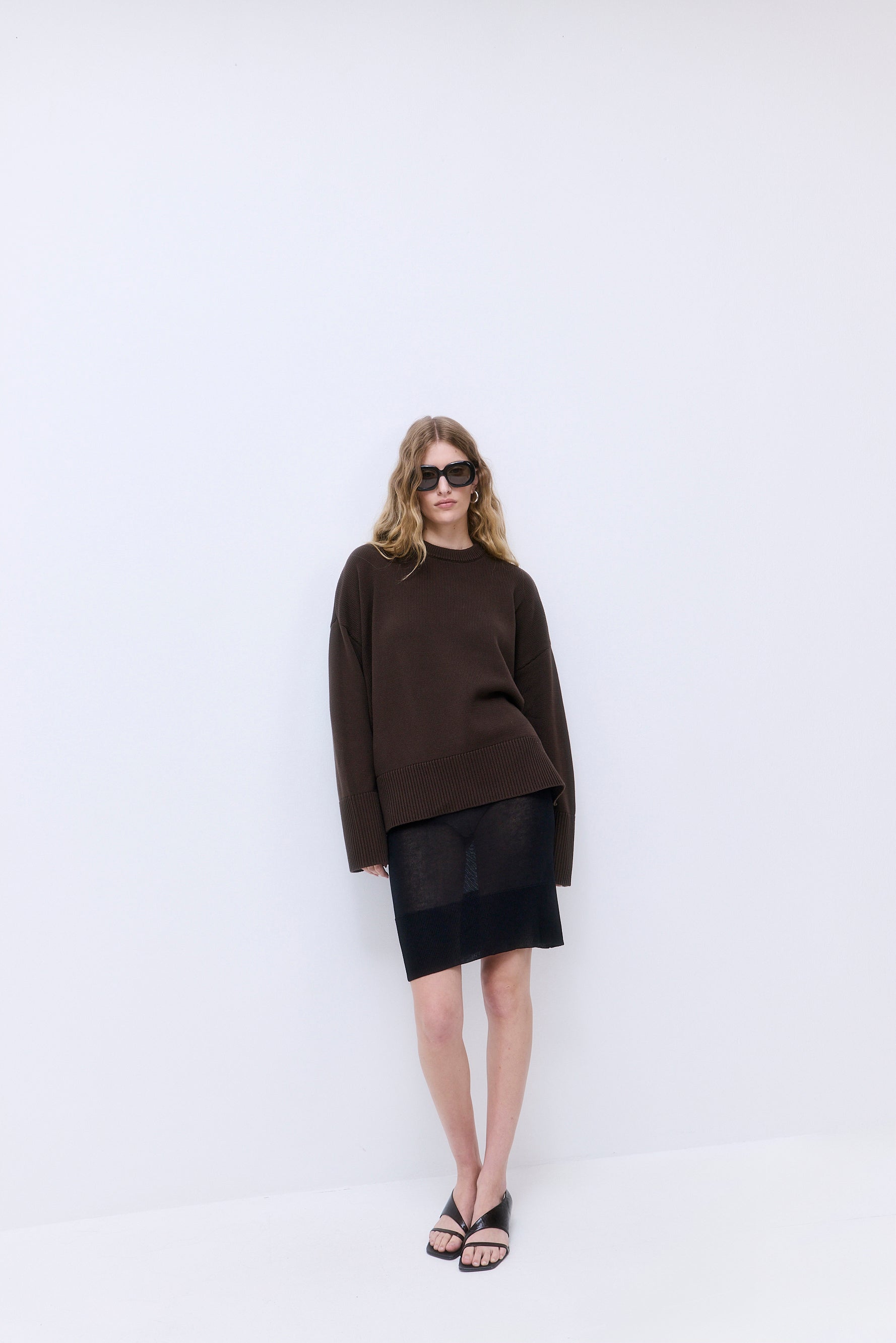 The perfect cozy winter essential. Crew neckline. Oversized fit. Slits on the side. Dropped shoulders. Wide rib hem. Tonal silicon logo on the back. Fully fashioned. Style it with our with our chic Sheer Midi Skirt and pair these with our iconic Yvon Shoulder Bag for an effortless everyday look.