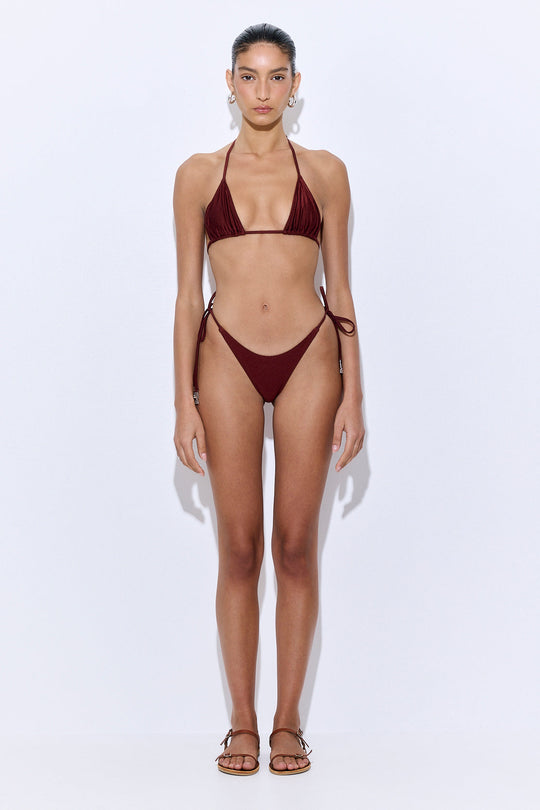 Melissa, named after the graceful water nymph, is the ultimate blend of minimalism and elegance. Made from luxurious shiny Italian fabric that flatters and supports your shape with a sleek, second-skin fit. Classic triangle silhouette with adjustable tie closures at the neck and back which can be worn in multiple stylish ways. Features silver logo pendants on the ends of the bottom straps. Preparation for cup inserts (no cups provided). Lined. The ultimate top for tanning. Style it with our flattering Malis bottom, our beautiful shirred maxi dress and finish off with one of our cool scrunchies for the ultimate summer look.