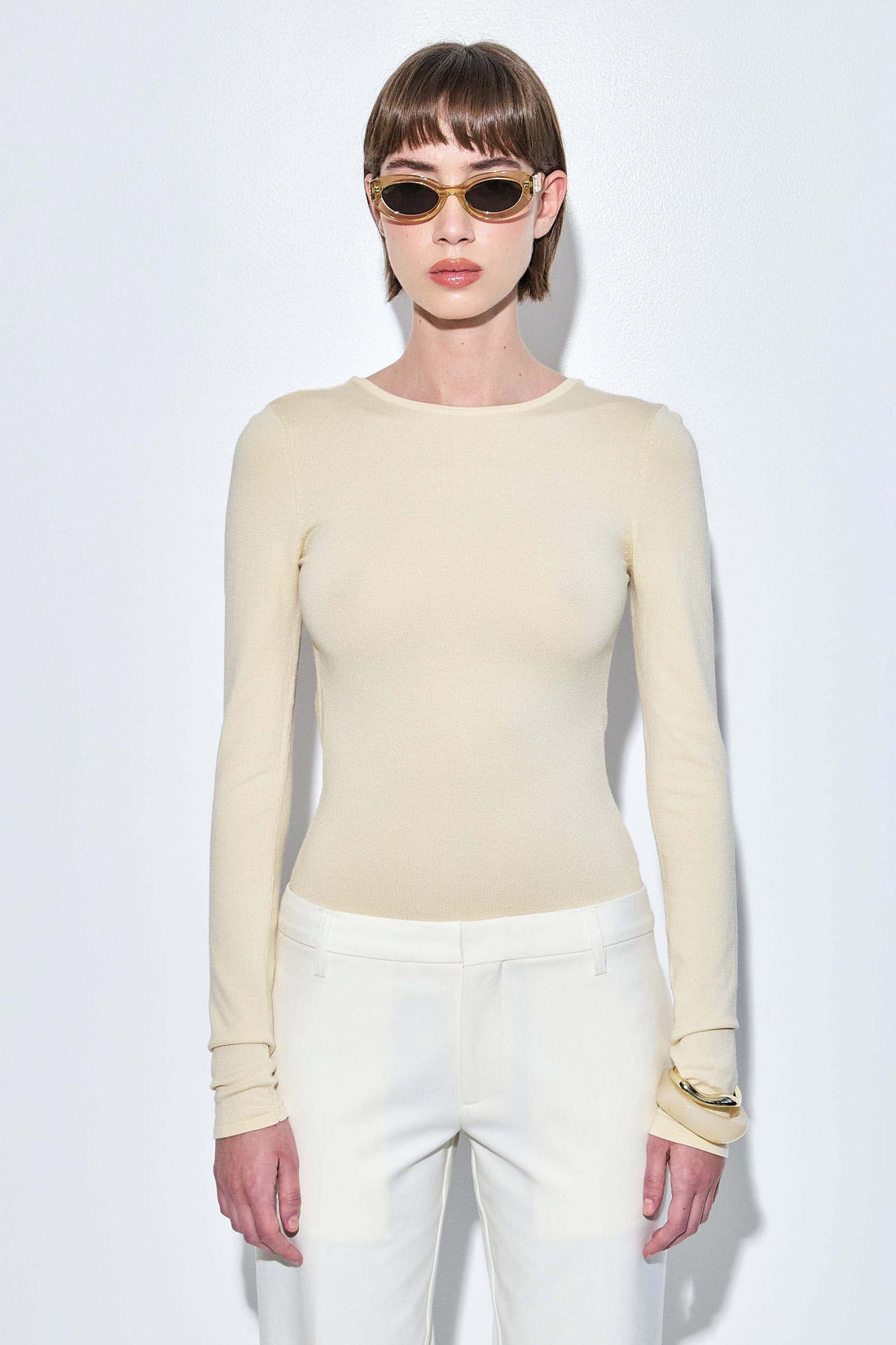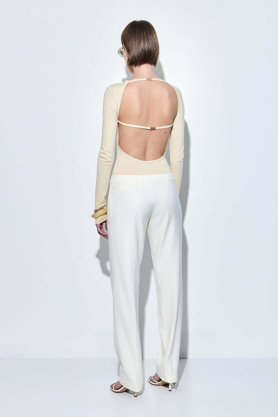 Our knitted open back buckled top is your new go-to ocassion essential. Long sleeved. Fitted silhouette. Clean Finish. Fully fashioned. Soft and slightly stretchy fabric that hugs the body. Featuring an elegant open back with delicate gold logo buckle details. Style it with our flattering pair of denim and throw our double wool oversized blazer on top to seal this effortless look.