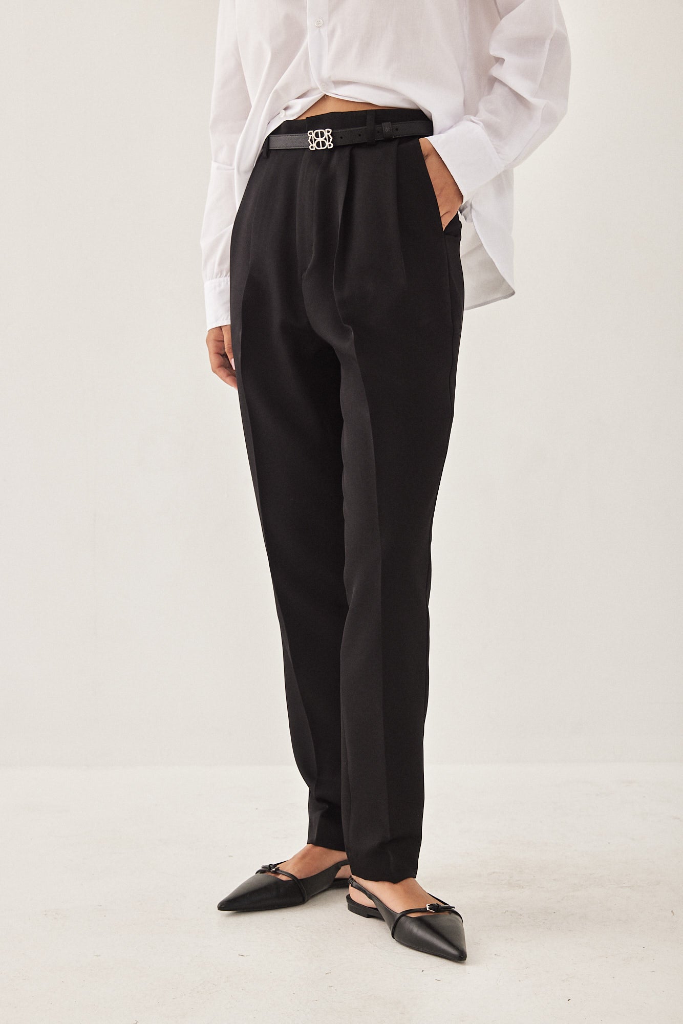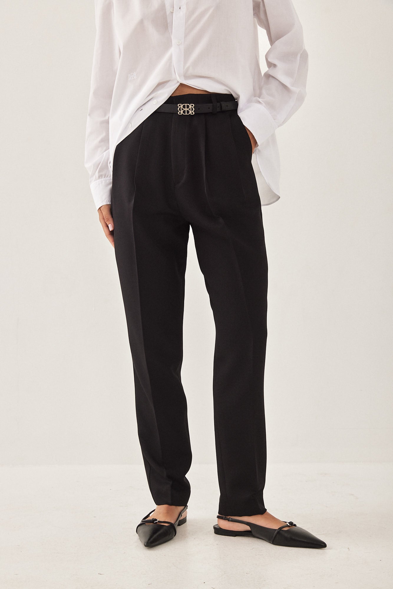 High waisted tailored pants with a delicate balloon shape that tapers slightly at the ankle. Non-stretch lightweight woven fabric. Featuring belt loops, side pockets. Full length. Front zipper closure. Embroidered logo at the back. Complete the look with a basic tank top and the matching daddy blazer.