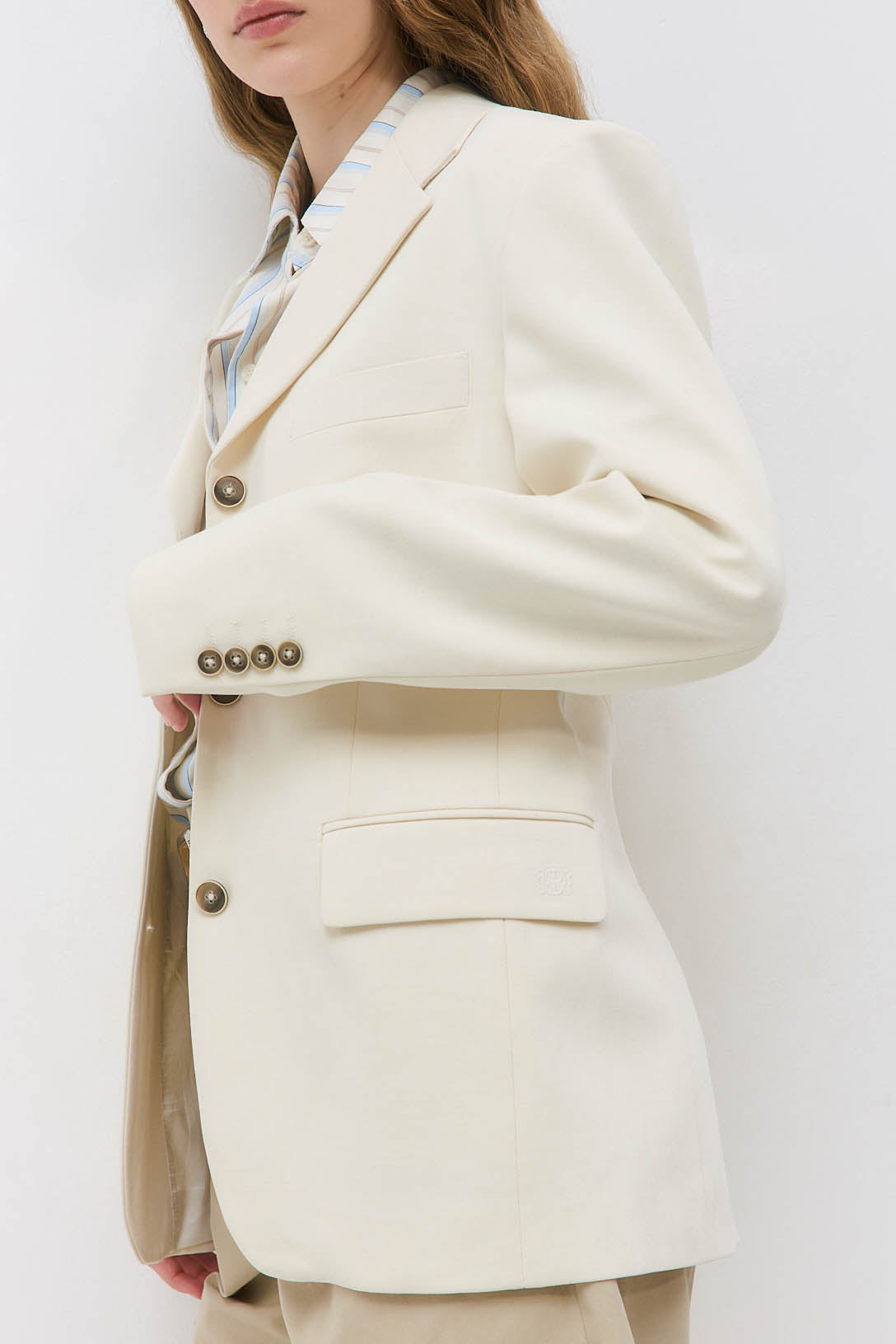 Welcoming new, timeless pieces to our iconic Daddy collection. A classic blazer. Oversized fit. Complete with a lapel collar. Featuring two front flap pockets. Tonal buttons with contrast trim edge. Tonal embroidered logo. Fully lined. Detailed with two inside pockets. Wear it with our new, stylish Slim Daddy Pants and timeless Yvon Shoulder Bag for a refined look.