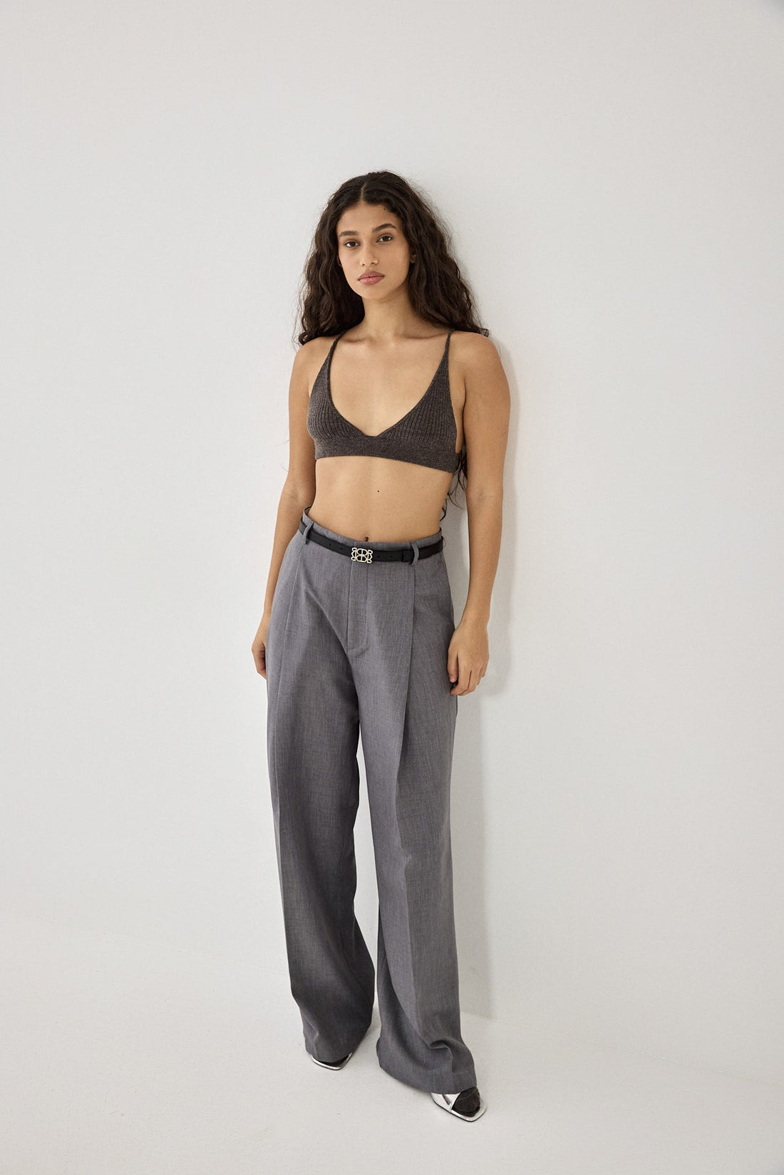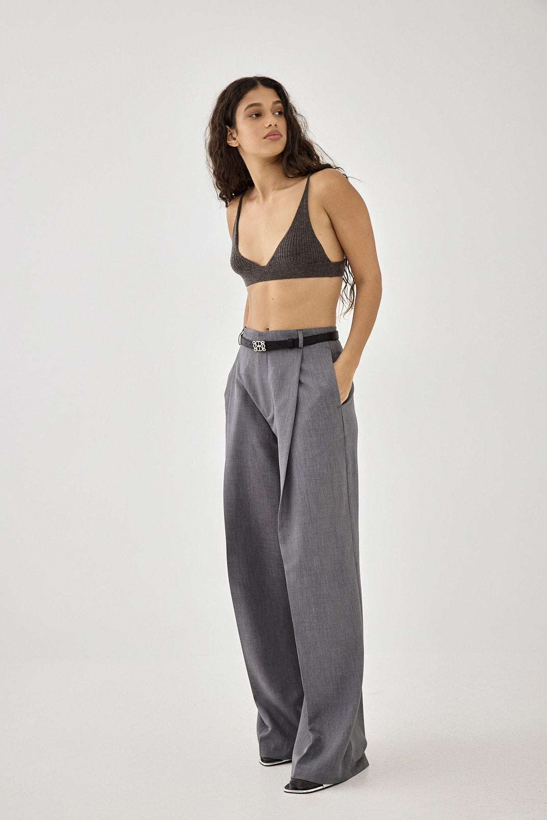 High waisted tailored pants with an extra wide silhouette. Non-stretch lightweight woven fabric. Featuring belt loops. Front zip and metal hook closure. Embroidered logo detailing at the back. Two side pockets. Style it with your favorite basic tee and a pair of sandals for an ultra-chic everyday look.