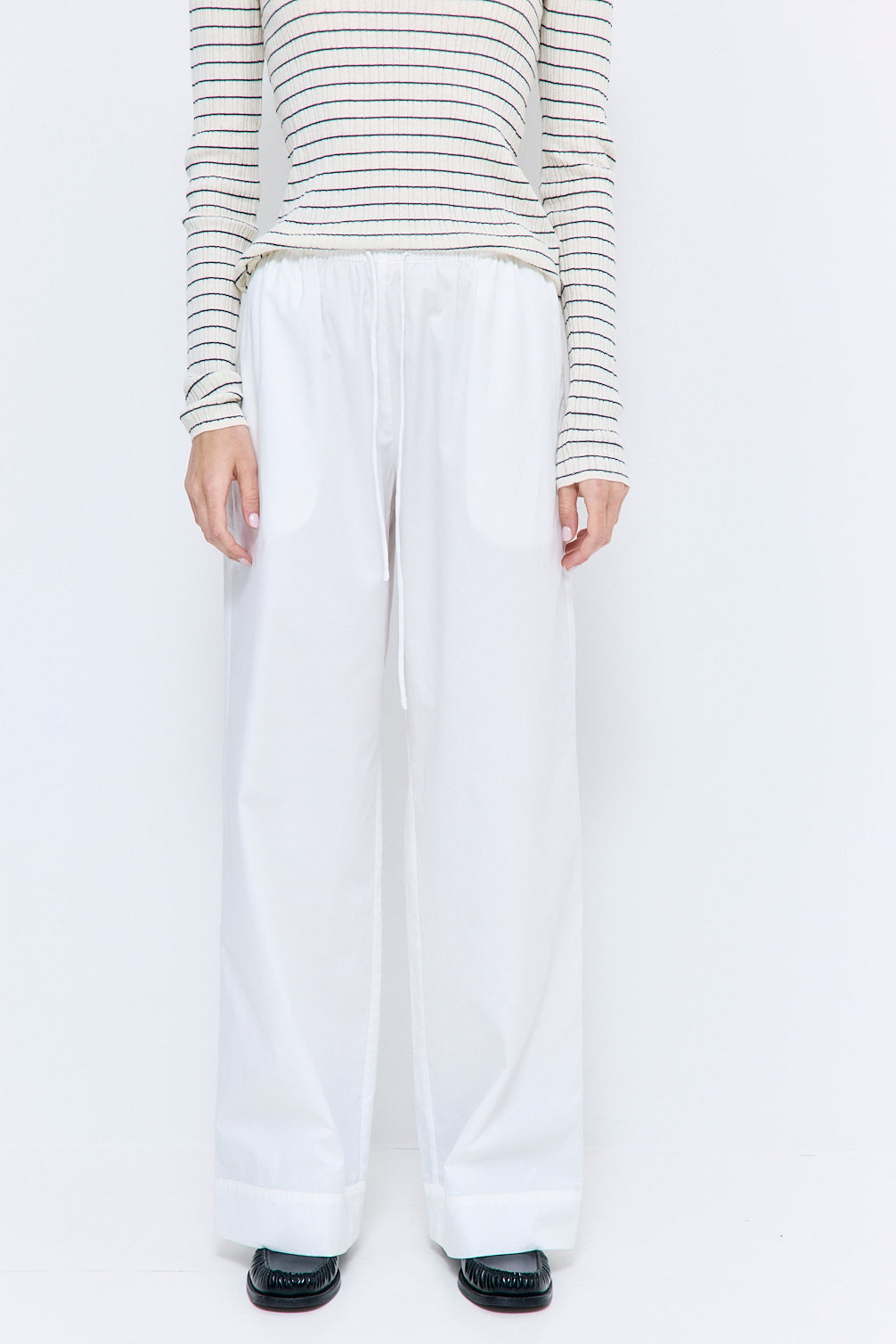 Our new mid rise poplin pants are a true summer staple. Mid rise long pants. Thin elastic waistband featuring an ultra thin drawstring closure. Two side pockets. Delicate logo embroidery detailing. Wide legged fit. Wide hem finish. Style it with our new striped cap sleeved tee, our oval sunglasses and finish this look with our gorgeous Yvon shoulder bag.