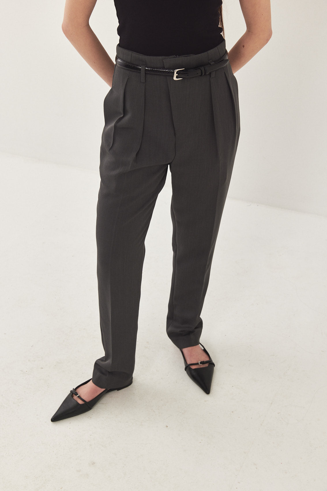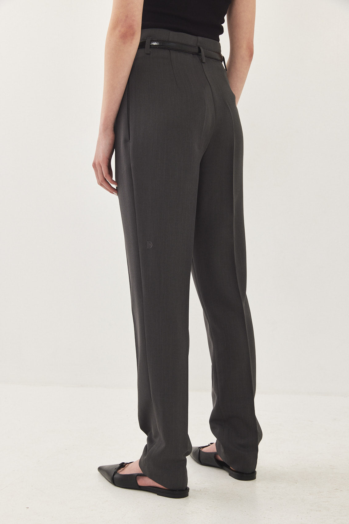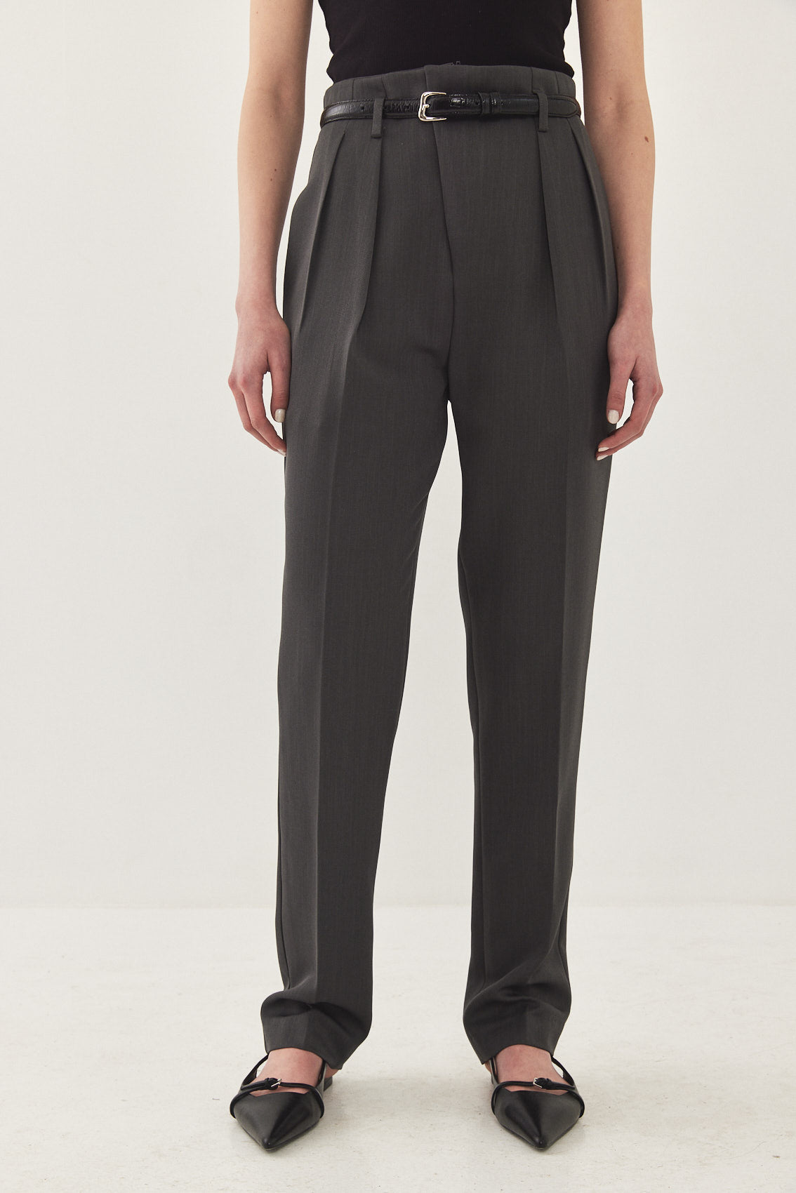 High waisted, straight tailored pants. Subtly relaxed fit that tapers slightly at the ankle. Featuring a diagonal zip fly and a metal hook closure. Side pockets, front pleat detail and belt loops. Style yours with a basic top and a matching daddy blazer for an effortless ultra chic look.