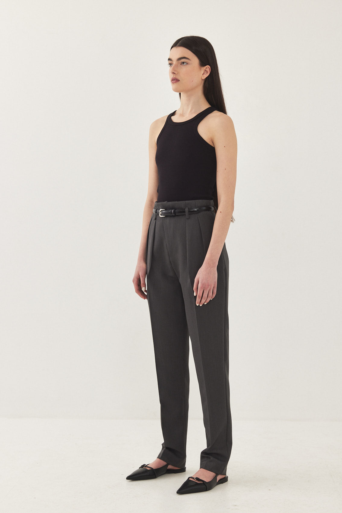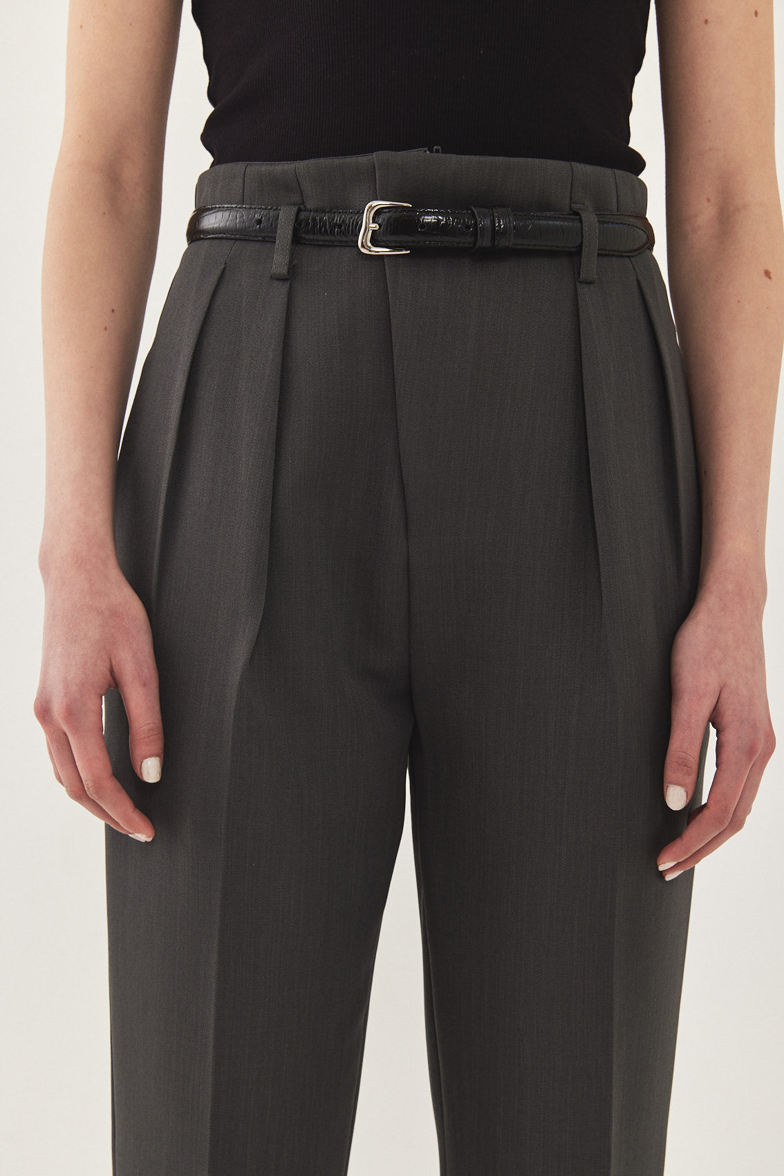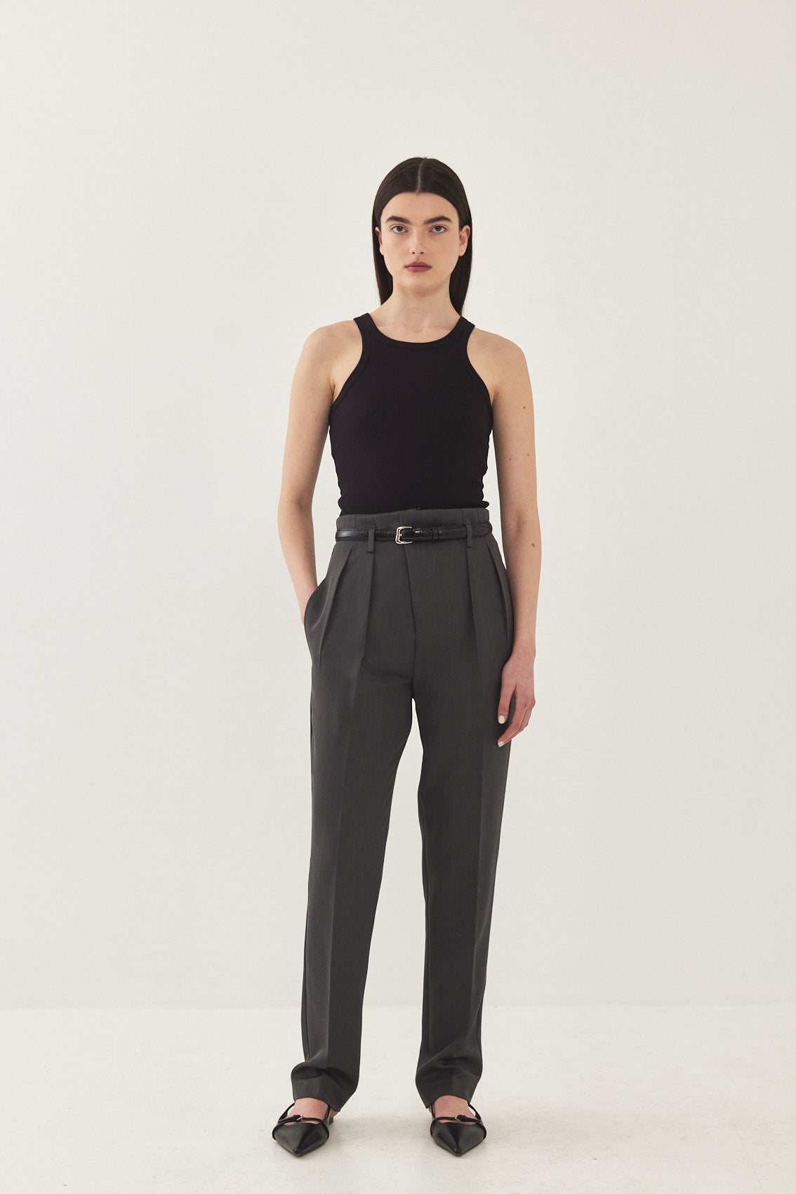 High waisted, straight tailored pants. Subtly relaxed fit that tapers slightly at the ankle. Featuring a diagonal zip fly and a metal hook closure. Side pockets, front pleat detail and belt loops. Style yours with a basic top and a matching daddy blazer for an effortless ultra chic look.