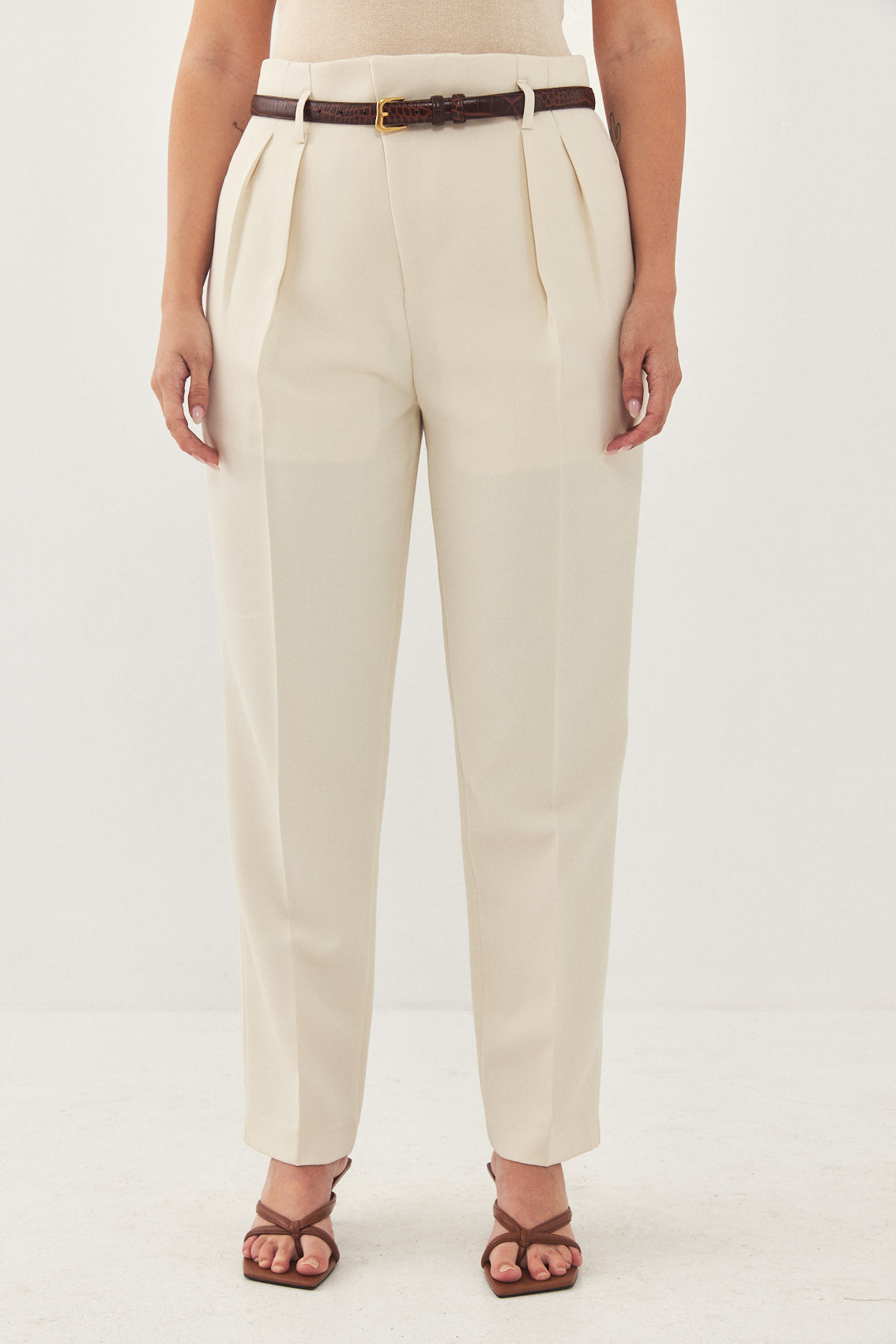 High waisted, straight tailored pants. Subtly relaxed fit that tapers slightly at the ankle. Featuring a diagonal zip fly and a metal hook closure. Side pockets, front pleat detail and belt loops. Style yours with a basic top and a matching daddy blazer for an effortless ultra chic look.