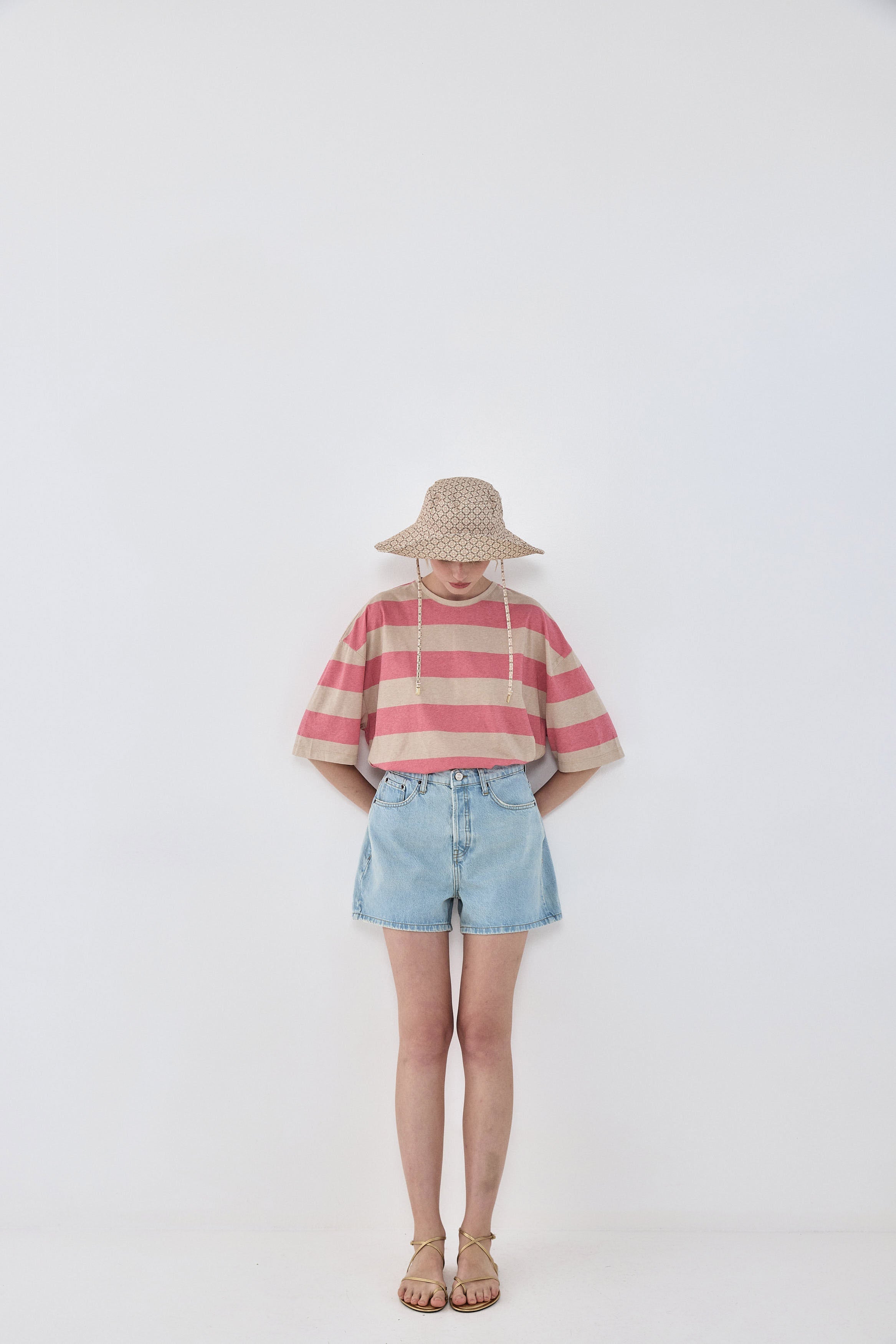The coolest oversized t-shirt you'll own. Wide stripes. Crewneck. Drop down shoulders. Oversized fit. Logo embroidery detailing on the front. Style it with your favorite denim shorts, 90's style shoulder bag and delicate kitten heels for an effortlessly stylish look.