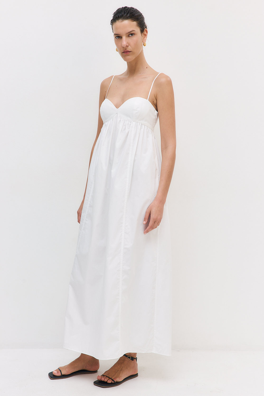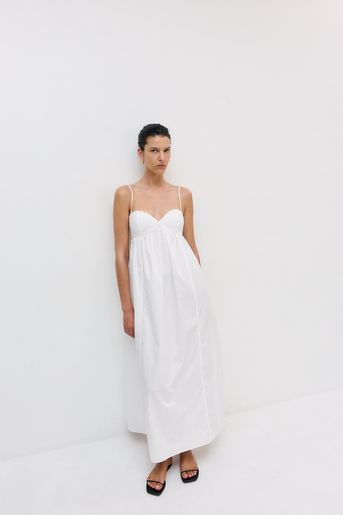 Our new Cupped Poplin Maxi Dress is the ultimate summer essential. Luscious crispy poplin fabric that moves with you. Maxi length. Cupped neckline with thin adjustable straps. Delicate tonal zipper closure. Designed with two side pockets. Detailed with a tonal embroidered logo on the side. Featuring gathered detailing at the bust and a flowy A line skirt. Style it with our luxurious Rodika tote bag and our beautiful scrunchie for the perfect summer day.