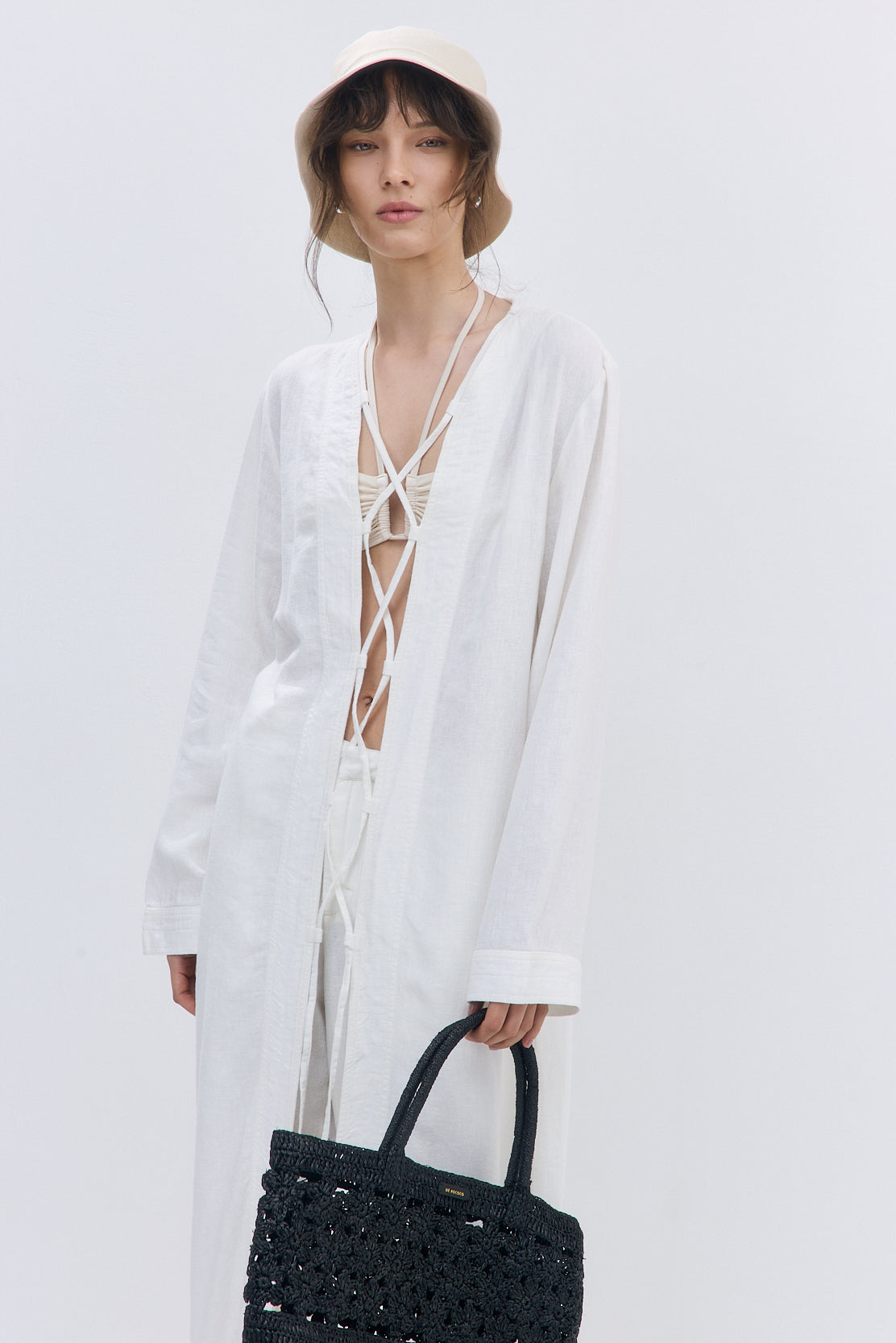 Casual sophistication at its finest. Linen String Tie Cover Up with crisscross tie detailing along the opening. Sleeves finished with a wide hem. Crafted from semi-sheer fabric. Flows into a straight line silhouette at the bottom. Detailed with a tonal embroidered logo at the waist side. Style it with our iconic Oval Sunglasses and sleek Rodika Tote Bag for a boho-chic look.