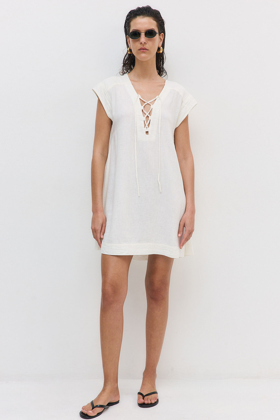Casual sophistication at its finest. Deep V neck mini dress with crisscross tie detailing. Armholes finished with a wide hem. Wing sleeves for effortless movement. Crafted from semi-sheer fabric. Featuring a back yoke. Flares out at the bottom to create a flowing silhouette. Style it with our iconic Oval Sunglasses and sleek Rodika Tote Bag for a boho-chic look.