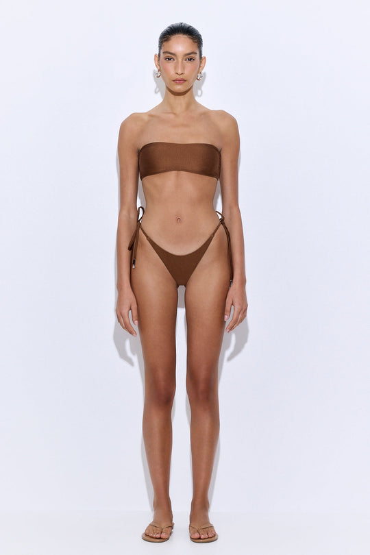 Pareia, named after a mystical water nymph, moves with an effortless grace—just like the waves and just like you. Mid to minimal coverage. Made from luxurious shiny Italian fabric that flatters your curves and hugs your body for a sleek, effortless fit. Minimal coverage with a daring, ruched design that sits high on the hips for an elongated silhouette which can be adjusted per your preference. Features a silver logo detailing on the back. Lined. Style it with our Melenia top, our new shirred maxi skirt and our cool matching scrunchie for the most beautiful summer look.