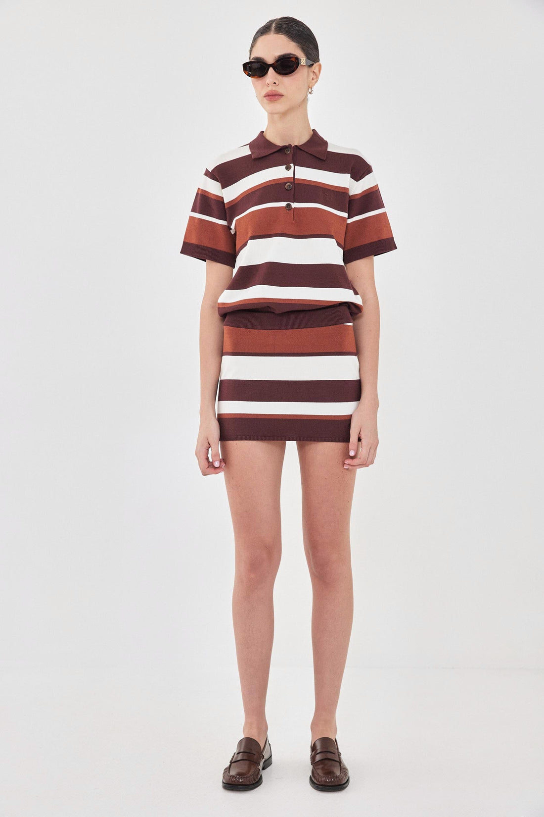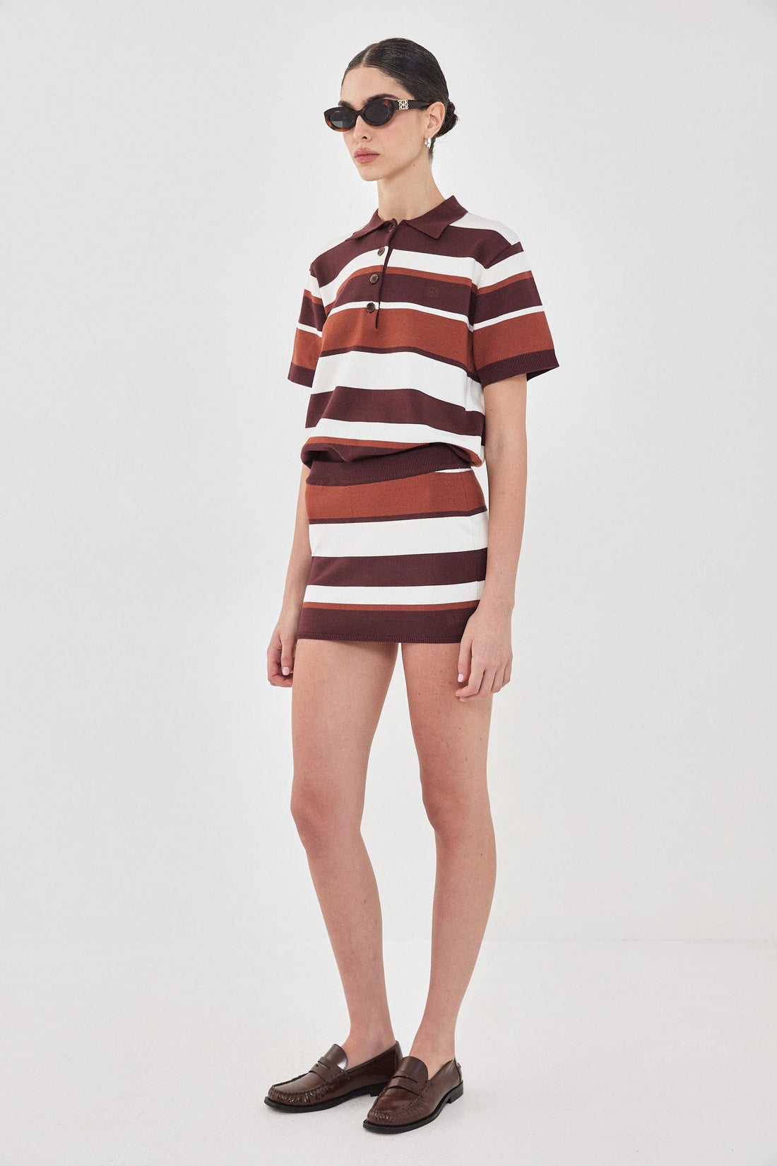 The newest addition to our timeless fully fashioned knitwear, our new striped burgundy polo shirt is a must have this fall. Short sleeved. Four branded buttoned frontal closure. Ribbed finish. Delicate embroidered logo on the front. Classic collar. Style it with a high waisted wide leg denim and a wide buckled belt for a chic vintage inspired everyday look.