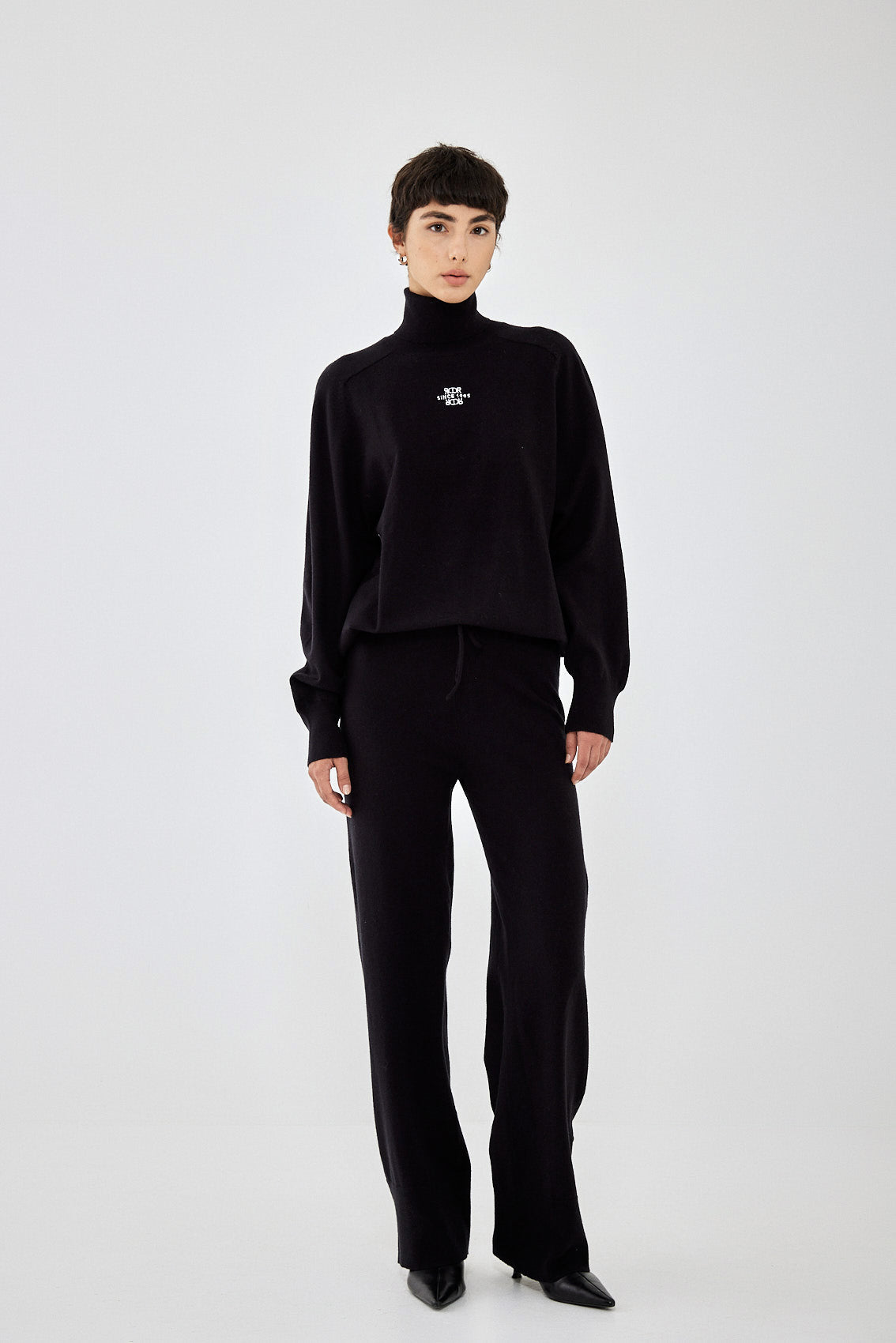 The perfect addition to your winter wardrobe. Thin knitted turtleneck top. Made from the softest material. Raglan sleeves with a cuffed finish. Embroidered logo on the front. Style it with the matching thin knitted pants, vegan leather trench and our quilted carry all for the ultimate winter look.