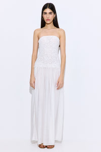 Our new lace drop waist maxi dress is the ultimate occasion wear essential. Featuring a luxurious strapless lace bodice and a drop waist that extends into soft, flowing chiffon from the hips down. Maxi length. Delicate lace and chiffon fabric. Torso features semi sheer internal lining. Tonal side zipper closure. Features internal silicon at the chest for extra grip. Style it with our beautiful Yvon bag and throw on our oval sunglasses for the classiest look ever.