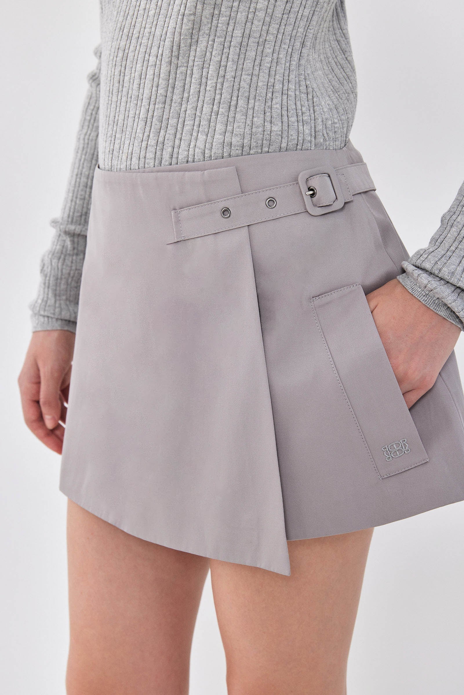 Ready for any occasion, our wrap mini skirt brings a dose of elegance and charm. Lined. Two side pockets. Adjustable strap for both high and mid waist. Tonal embroidered logo on the pocket. A-line fit. Style it with our matching cropped trench coat, our long sleeved ribbed knit and a pair of our oval sunglasses for a classy and chic look.