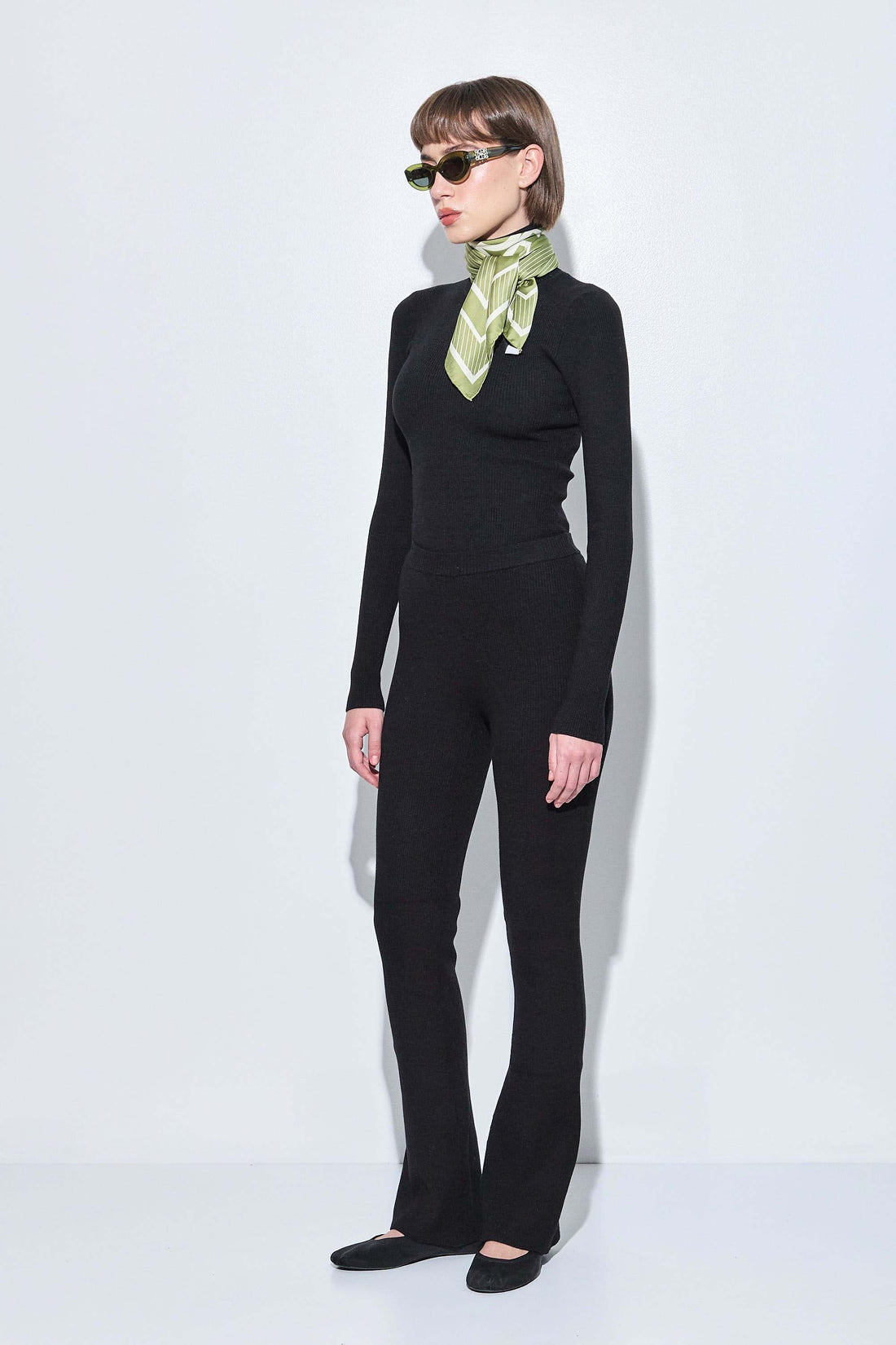 Get ready to fall in love with our new luxurious fall essential. Our new ribbed flared leggings are the perfect choice for a cozy yet stylish occasion. High waisted. Full length. Delicate flare fit. Tonal embossed logo silicone patch detailing on the back. Comfortable elastic ribbed waistband. Style it with our matching ribbed turtle neck top and throw our vegan leather jacket on top to seal this day to night look.