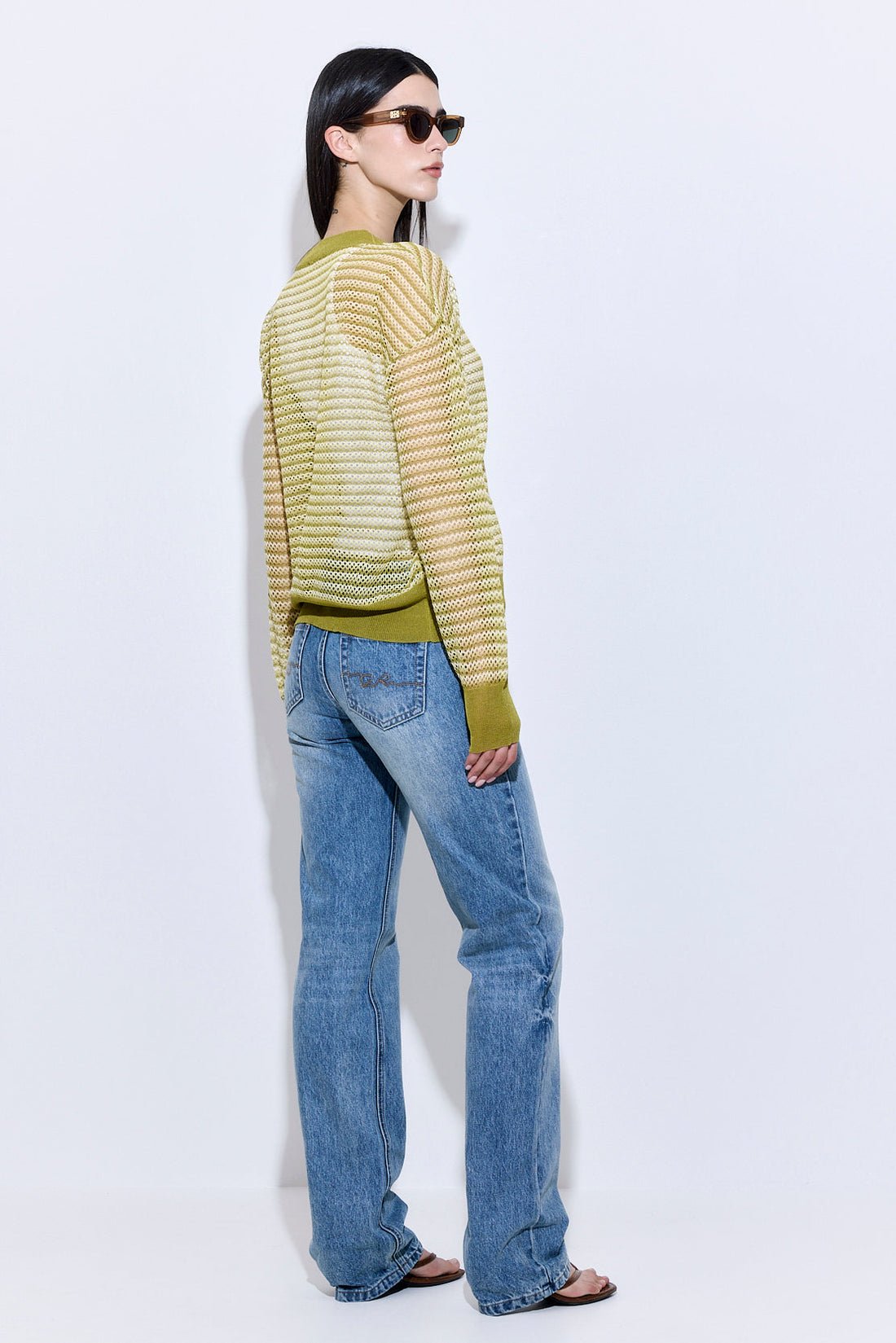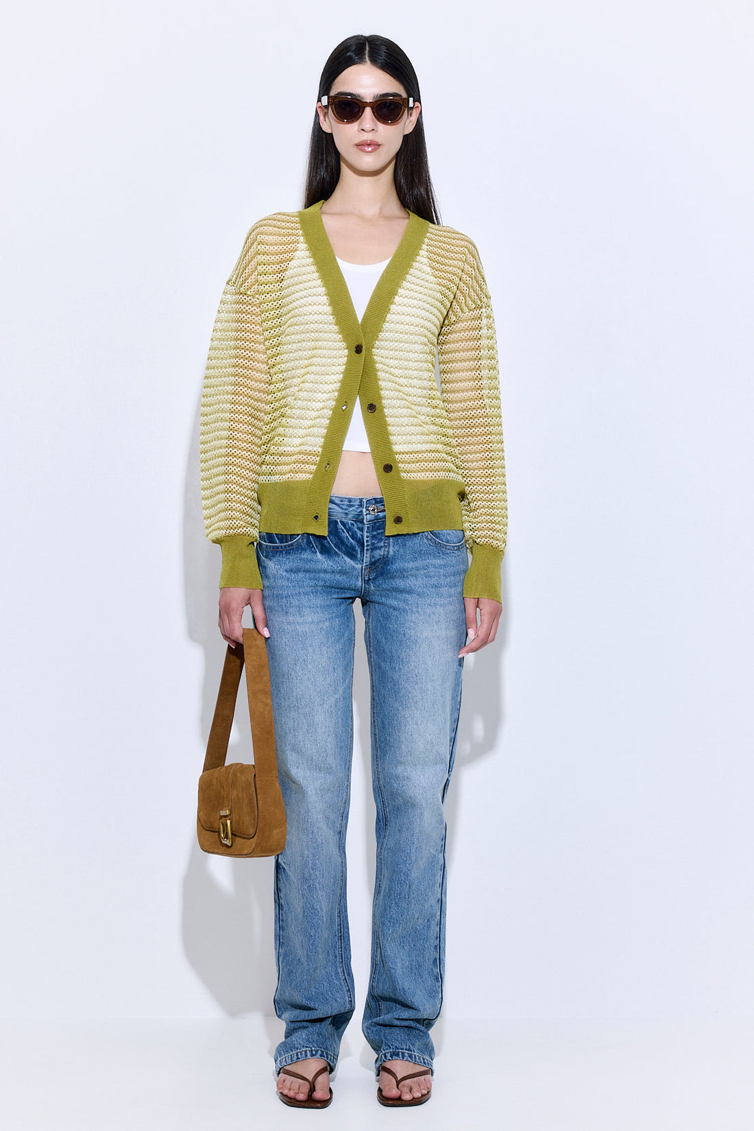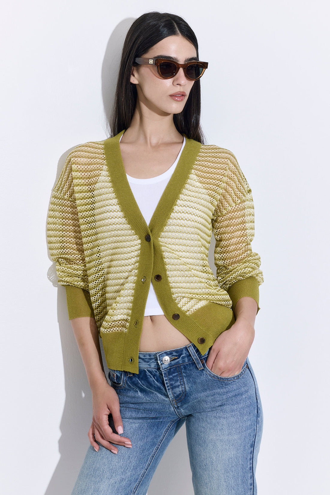 Our crochet cardigan is the perfect lightweight layer for breezy days and cool summer nights. Crafted from an airy open-crochet fabric, it offers a relaxed fit with a deep V-neckline and an engraved logo buttoned closure for an elevated touch. Featuring a ribbed finish on the cuffs, hem, and neckline for a structured yet comfortable feel. Style it over our new Calliphea one piece and our matching crochet maxi skirt for the most beautiful look this season.
