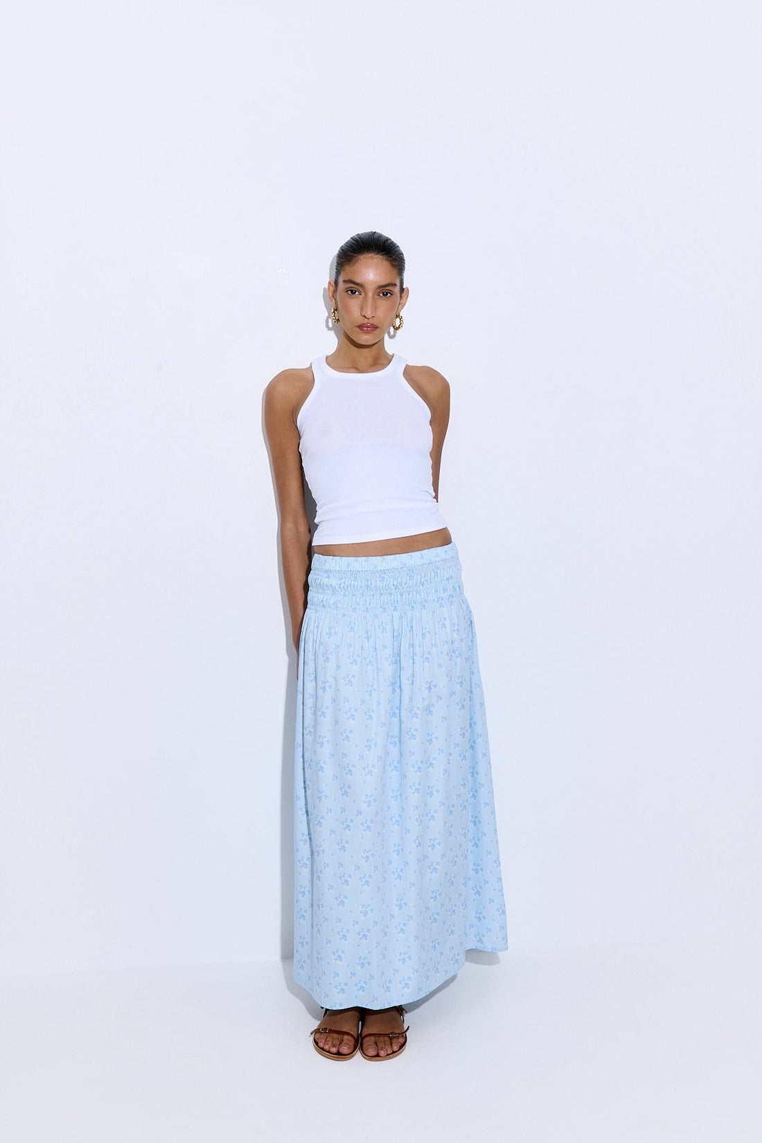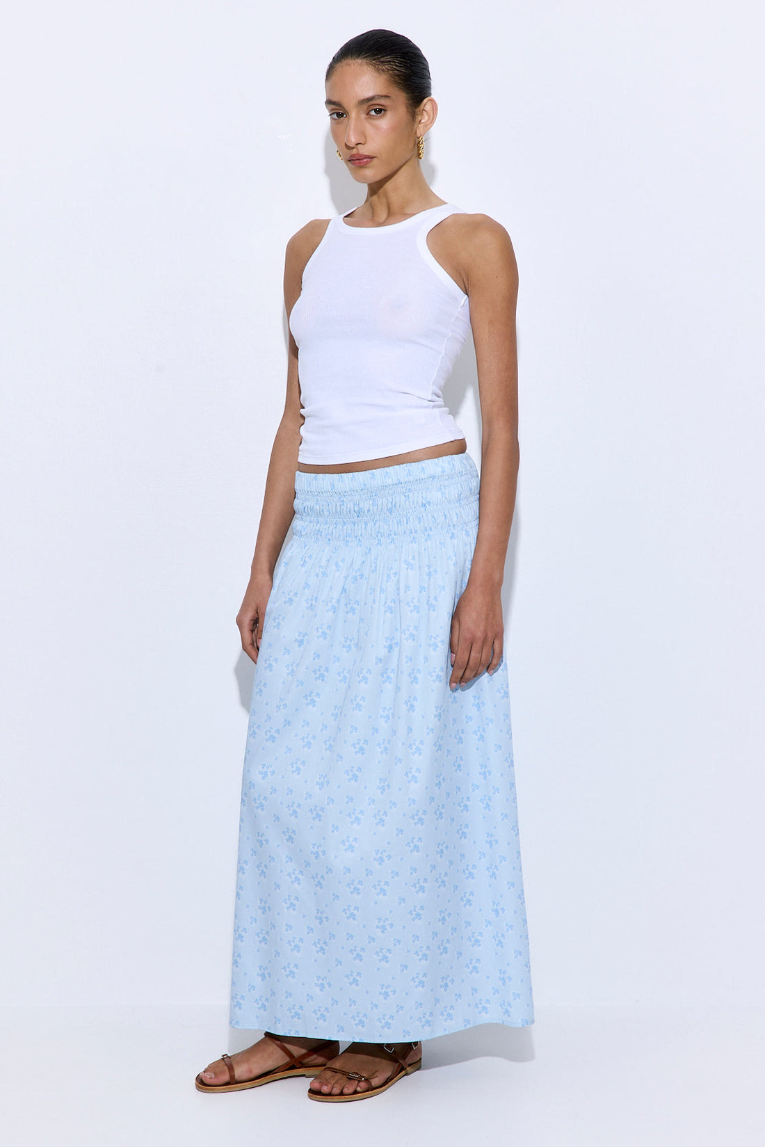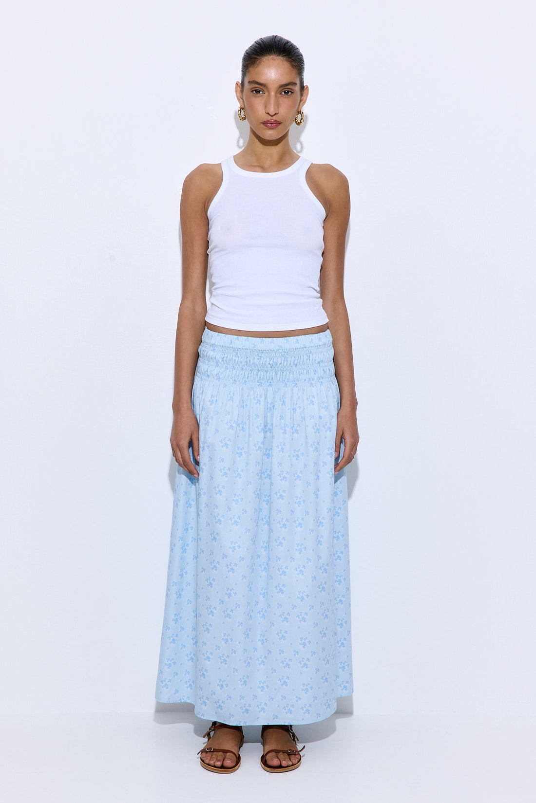 Our new shirred waist maxi skirt is the perfect blend of comfort and elegance. Designed with a soft, voluminous silhouette for effortless movement. Made from lightweight, breathable cotton for an airy feel. Featuring a wide, elasticated smocked waistband for a secure and flexible fit. PAir it with our new buckled tank top and a pair of our oval sunnies for a cool and effortless look.