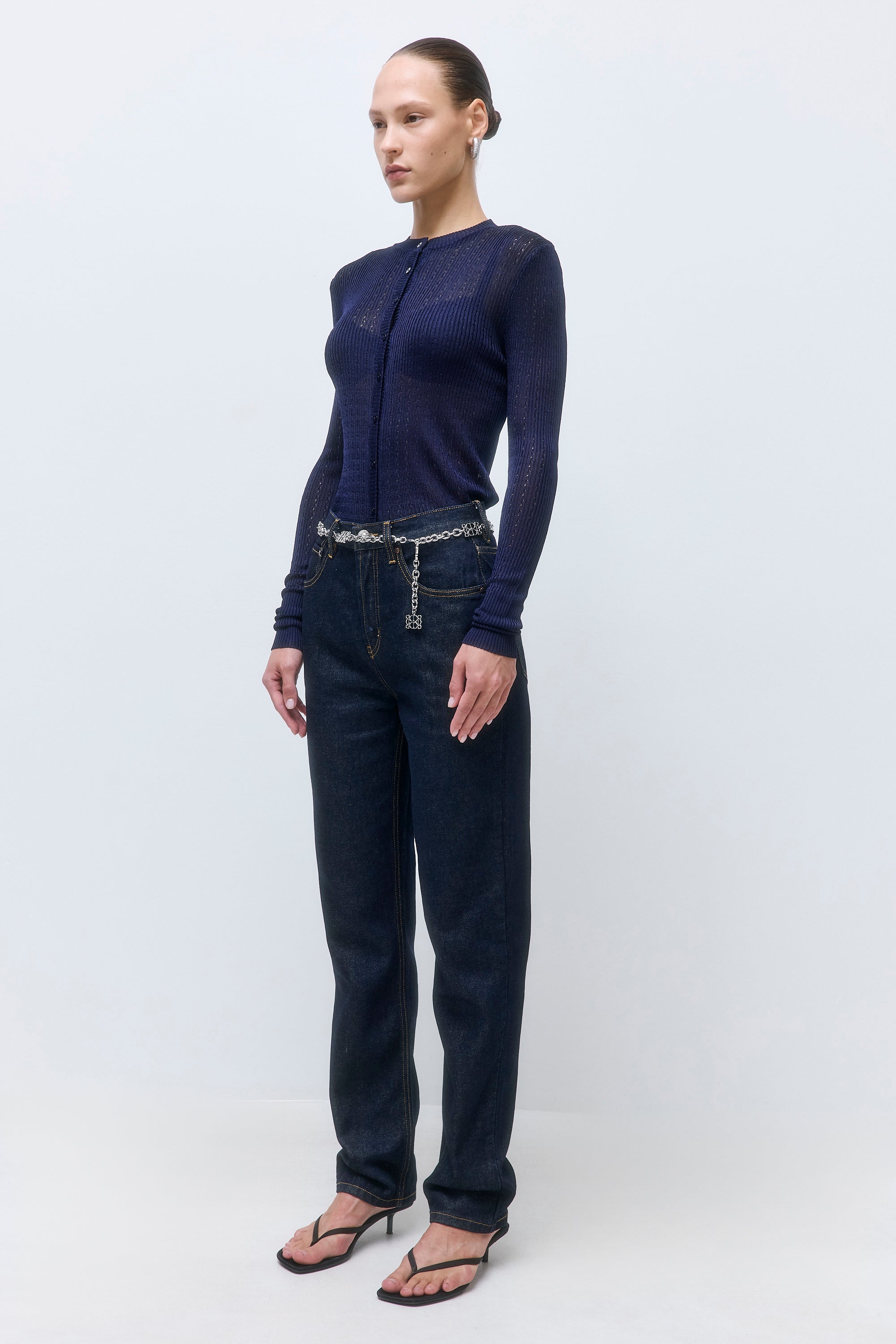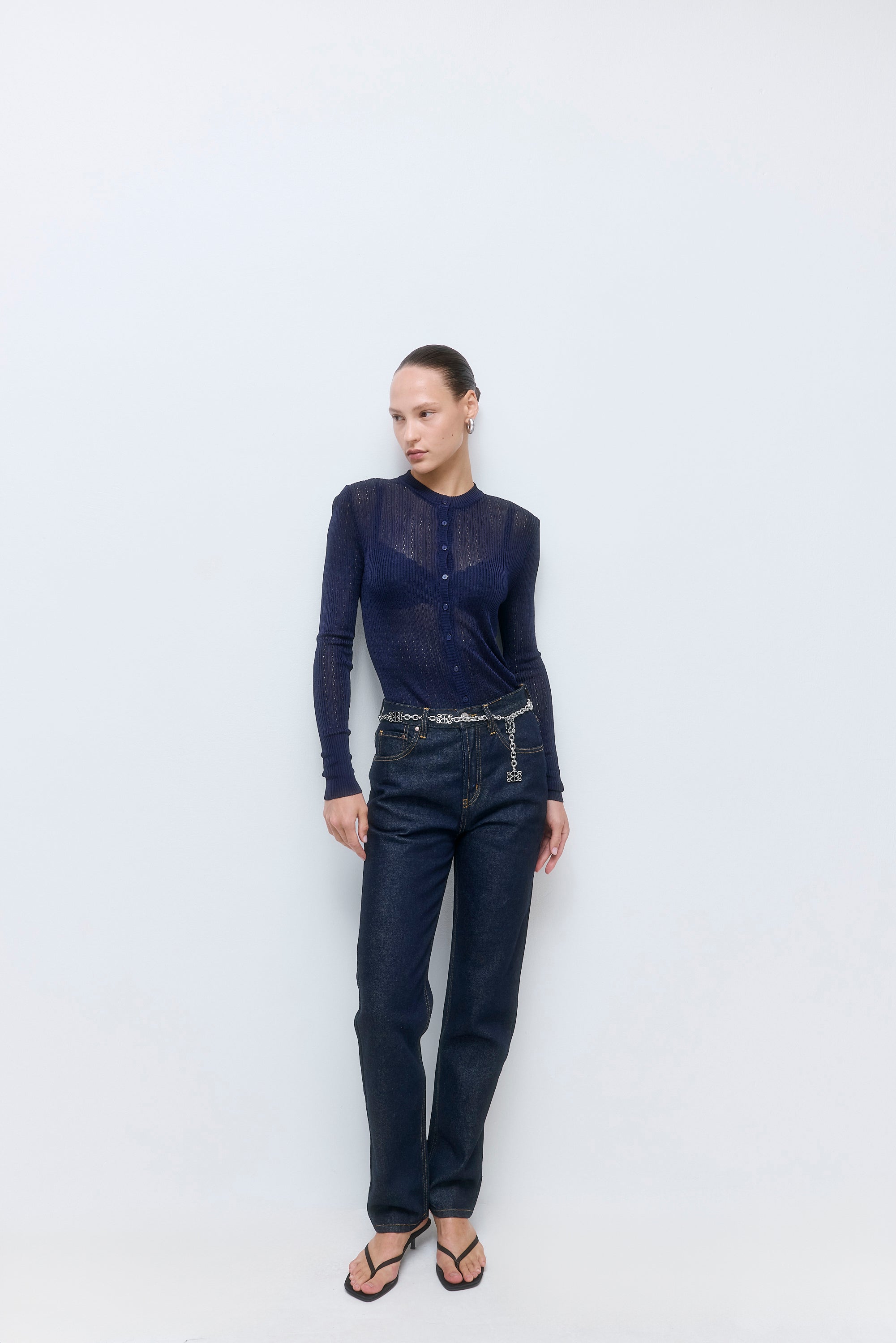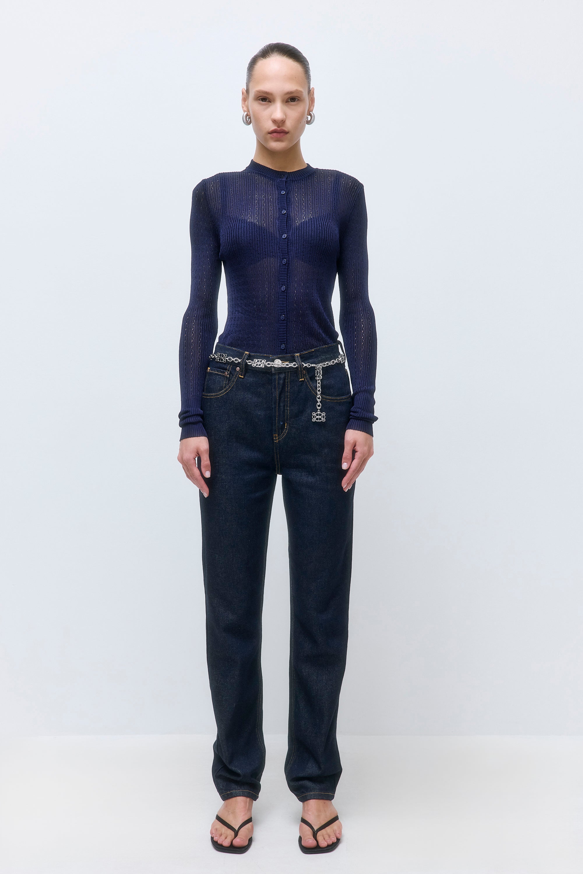 A sleek, sculpted essential. Semi-sheer crochet with a subtly slick texture. Fitted long-sleeved tee. Cardigan. Featuring a tonal button closure. Fully fashioned. Style it with our iconic Logo Chain Belt and pair those with our refined Yvon Shoulder Bag for an effortless everyday fit.