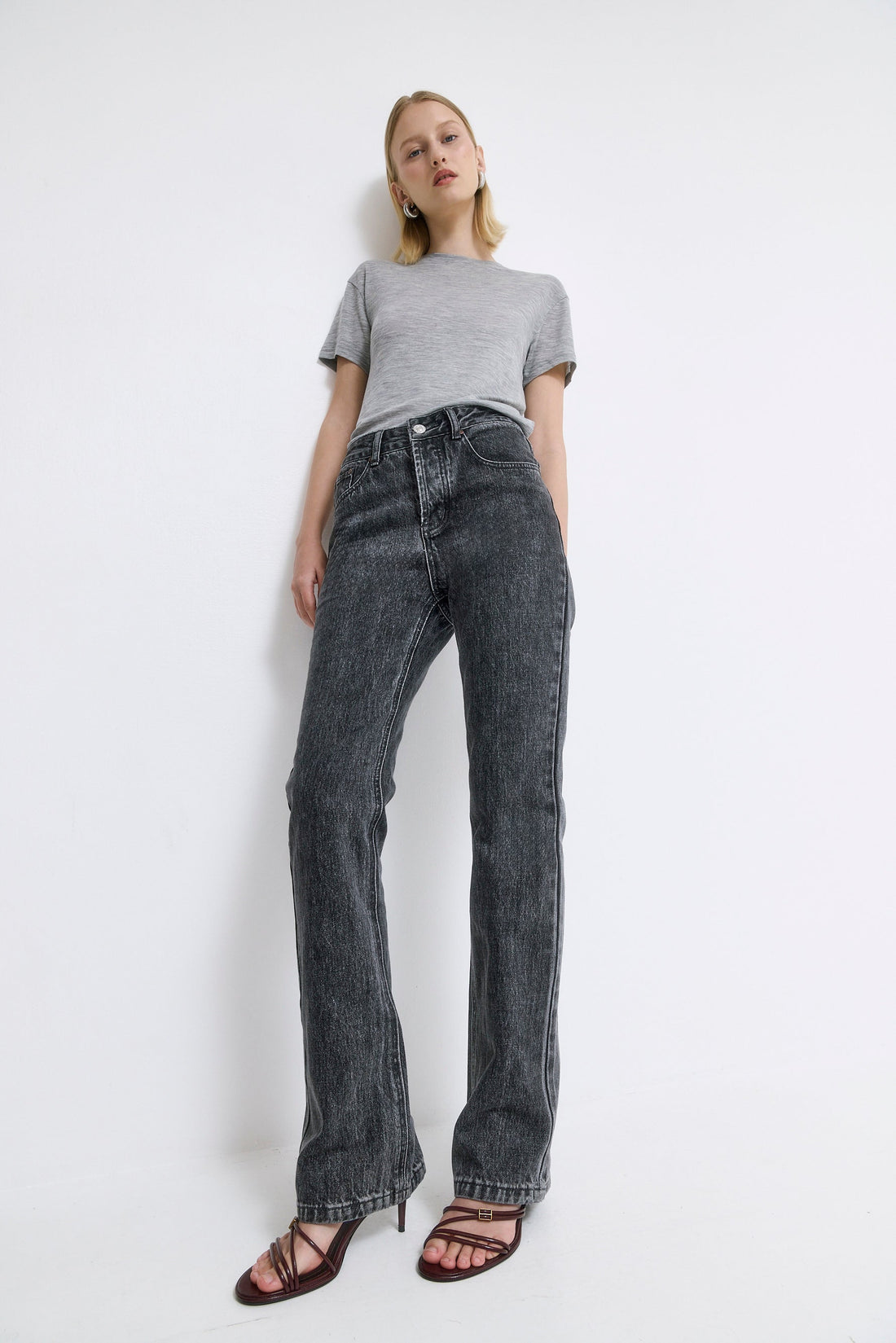 Our No.14 denim is a mid-waist, full-length bootcut that combines timeless design with a modern edge. Featuring a flattering silhouette that elongates the legs, it’s crafted for ultimate comfort and style. A classic buttoned closure and subtle detailing ensure versatility for any occasion. Style it with our lightweight turtle neck knit, our oval sunnies and throw our cool classic bomber for a chic everyday look.