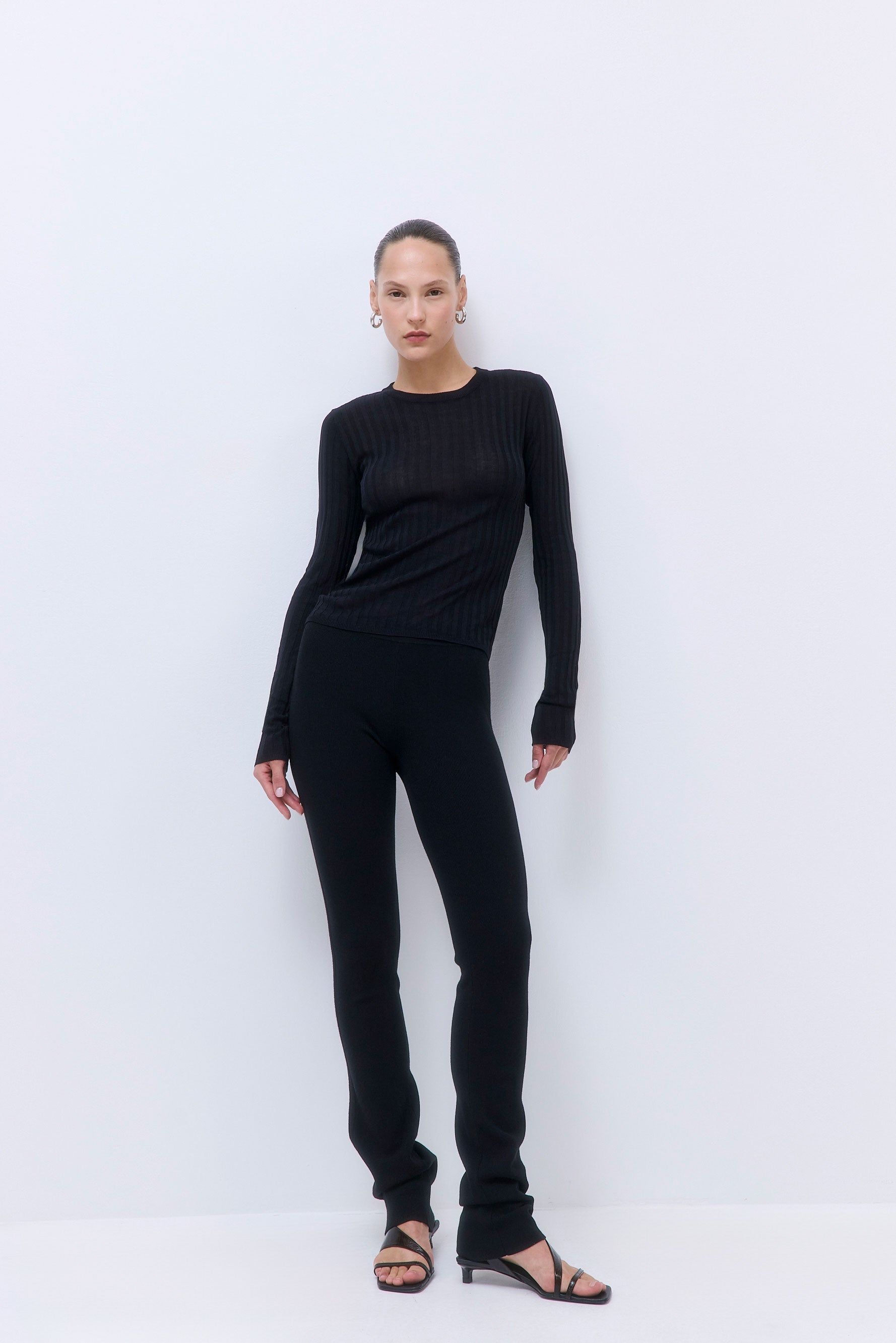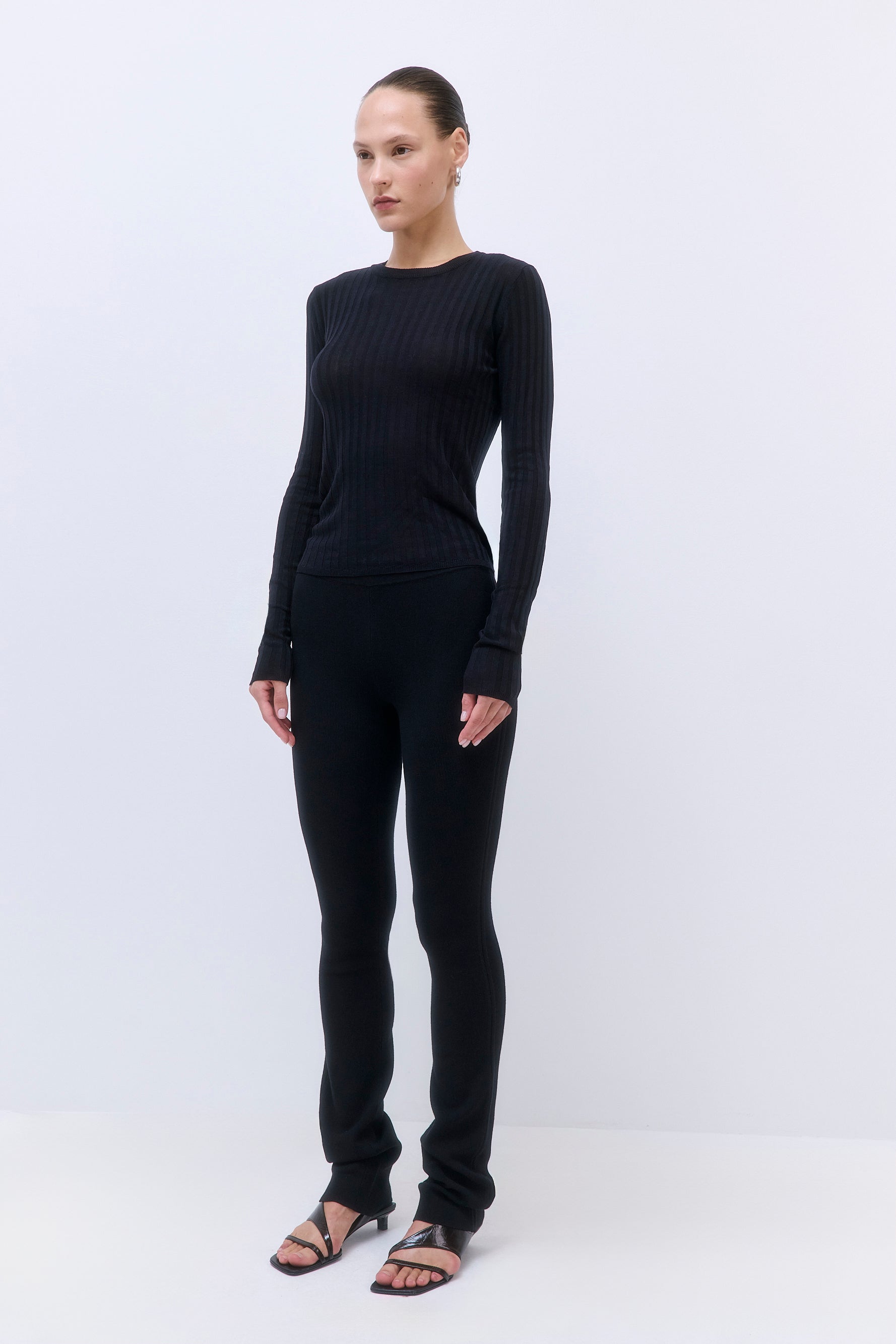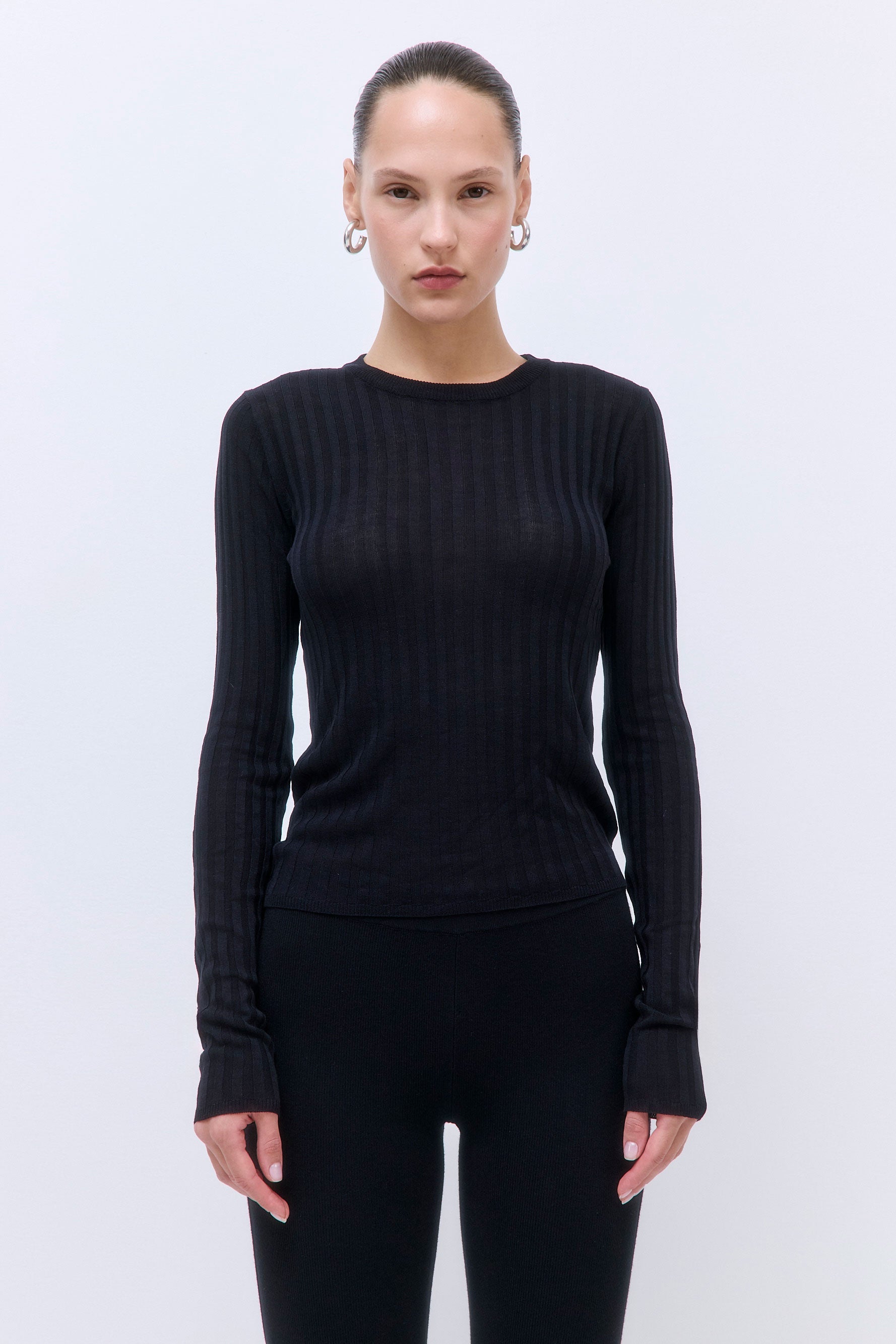 A staple piece for every capsule wardrobe. Ribbed crew neckline. Ribbed finish. Slim fit. Full length. Fully fashioned. Clean finishes. Pair it with our stylish Micro Mini Skirt and our sleek Rodika Tote Bag for an everyday effortless look.