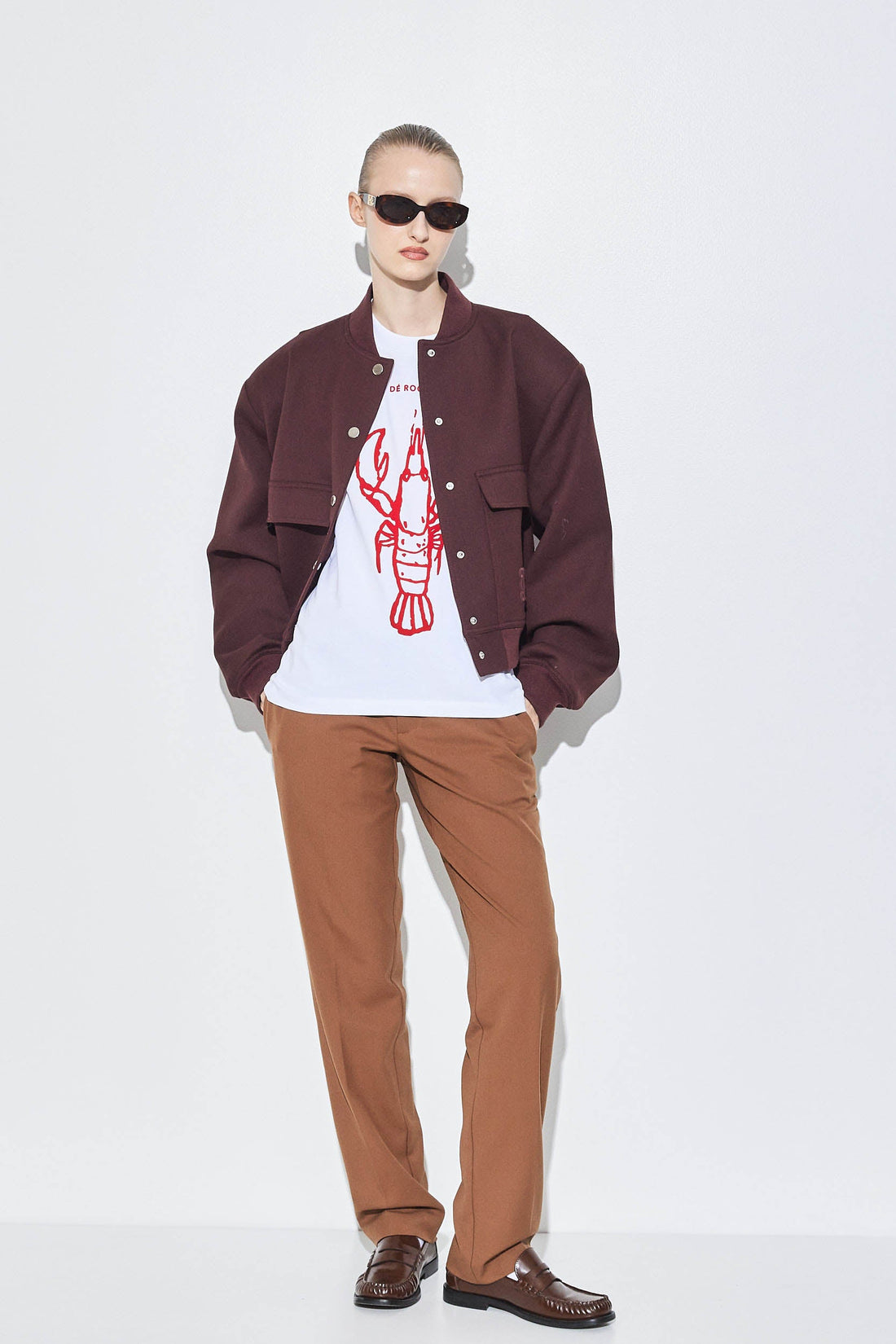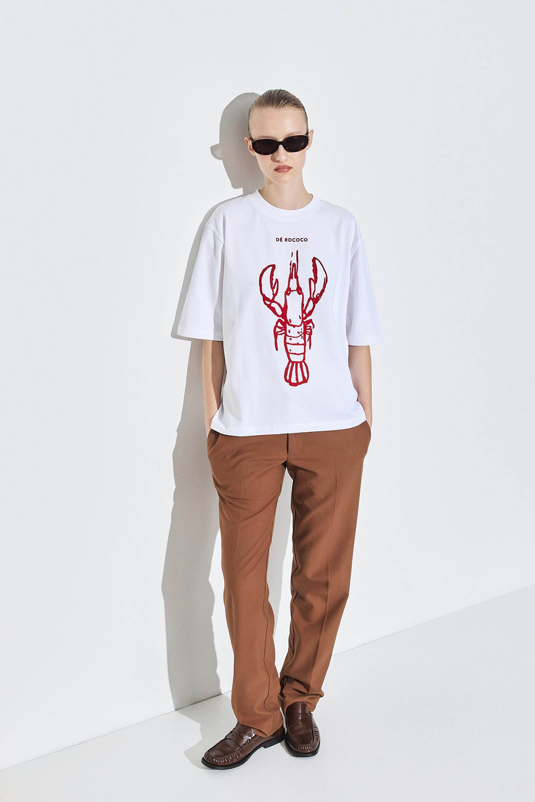 A fun oversized tee is an absolute summer essential. Lobster flock print. Crewneck. Oversized fit for an effortlessly cool look. Mid sleeves. Heavy cotton fabric, perfect for the warmer weather while maintaining the t-shirt's silhouette. Style it the light blue poplin pants, silver hoops and flats for an ultra stylish tonal look.