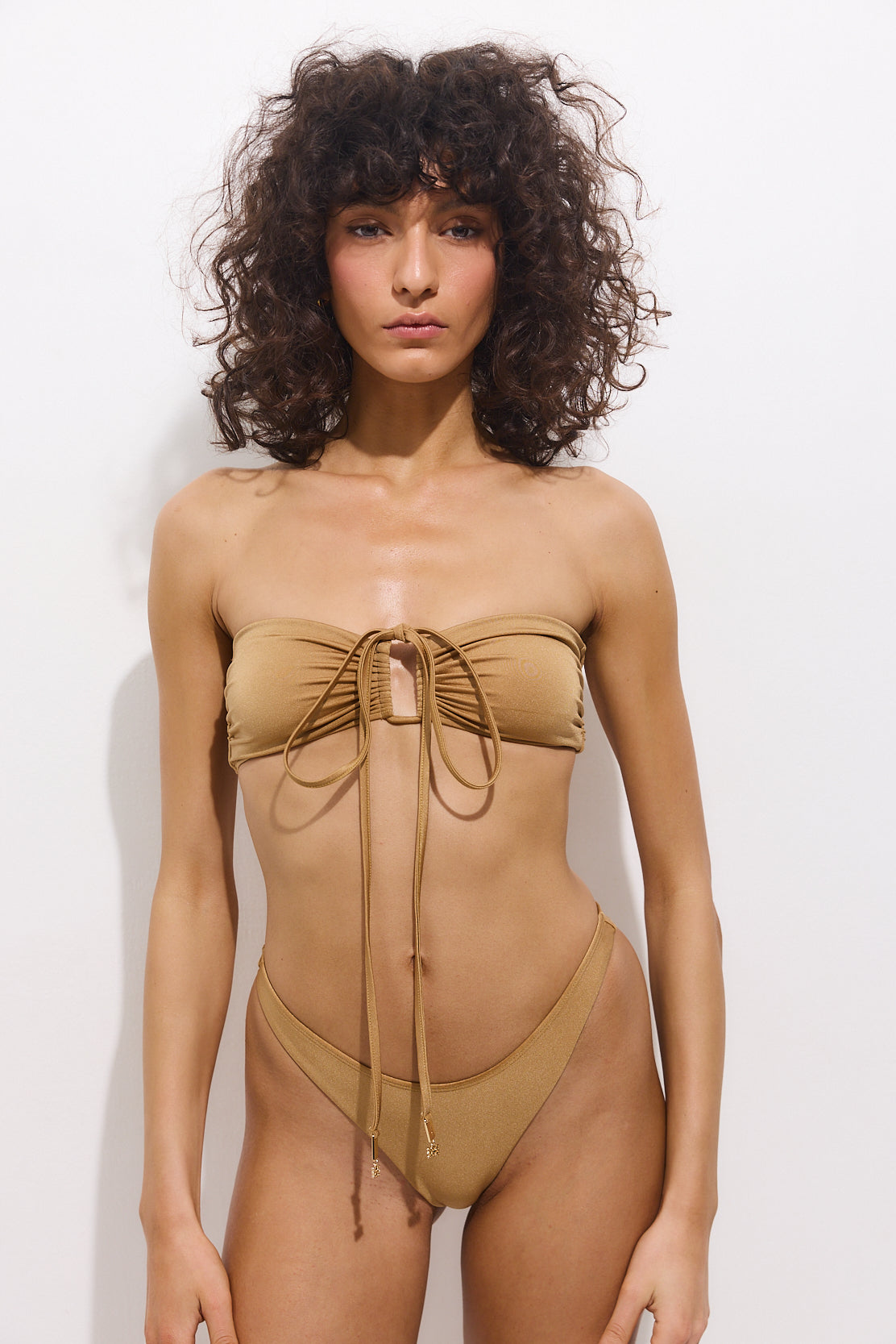 Introducing the spiced up version of our best-selling swim icons from over the years in a new dreamy shade. A signature silhouette, designed to create a striking V-shaped cleavage while offering enhanced support and a sculpted, confidence-boosting fit. Made from luxurious shiny Italian fabric that flatters your curves and hugs your body for a sleek, sculpting fit. Features side bones for additional support. Double lined. Gathering details at the front. Can be adjusted to your comfort, whether tied at the neck or made strapless. Featuring golden logo engraved aglets at the ends of the straps and an engraved golden hook closure. Supportive style, suitable for larger chests. Preparation for cup inserts (no cups provided). Style it with our iconic Spicy Ti Amo bikini bottoms, and tie it in with our timeless Striped Sarong for a polished, vacation-ready fit.