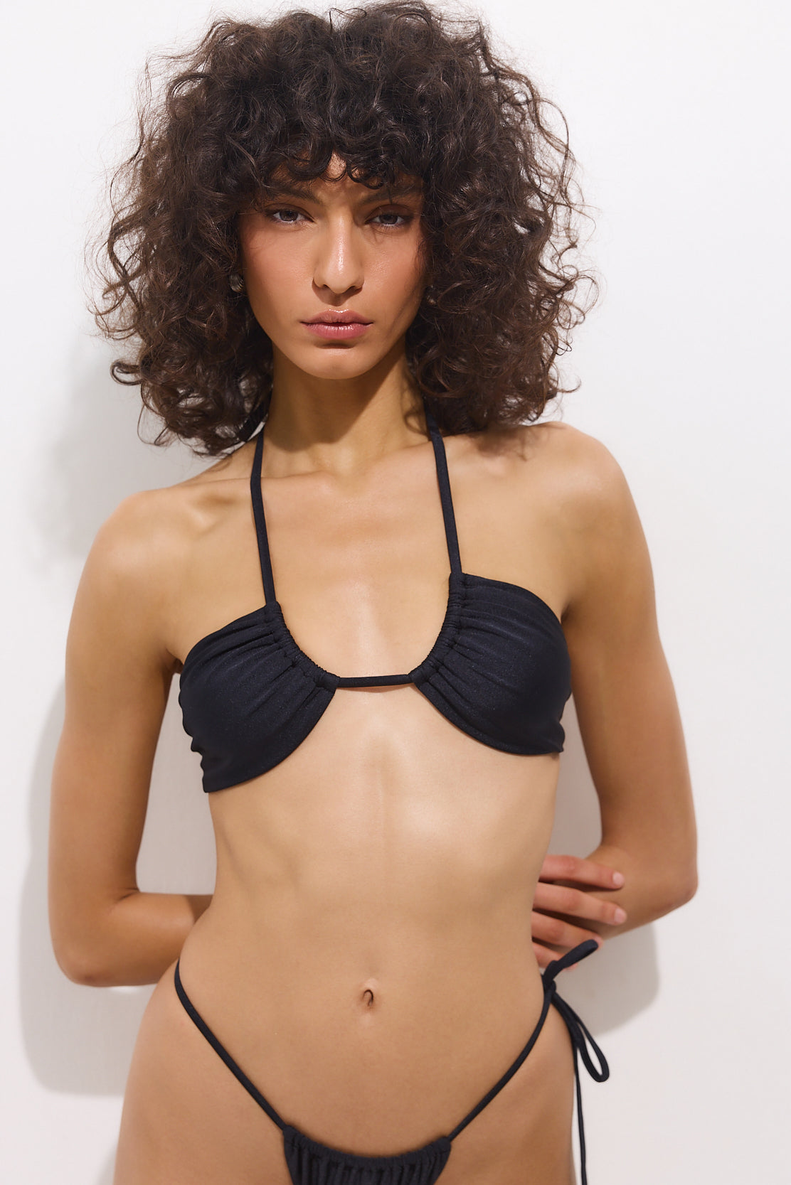 Introducing the spiced up version of our best-selling swim icons from over the years in a new dreamy shade. Melenia is designed for both elegance and support. Made from luxurious shiny Italian fabric that flatters your curves and hugs your body for a sleek, sculpting fit. Wide triangle silhouette with a fixed neck strap for added support. Thin tie closure featuring silver logo engraved aglets at the ends of the straps for a secure, adjustable fit. Preparation for cups inserts (no cups provided). Silver logo detailing at the nape. Lined. Can be worn in multiple ways, as desired. Style it with our beautiful Spicy Pareia bottom and our irresistible Tanagra Scrunchie for the hottest pool side look.